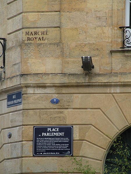 La place du Parlement, ancienne place du Marché Royal, présente une configuration en quadrilatère irrégulier. L'ordonnance architecturale, homogène, associe un rez-de-chaussée commercial, deux étages nobles et un troisième traité en attique, le tout couronné par une corniche avec balustrade et un comble. L'édifice est en pierre de taille; toutes les clés de voussures sont ornées de masques et de coquilles sculptés et toutes les fenêtres sont pourvues de balcons en fer forgé. La réalisation date de 1754.