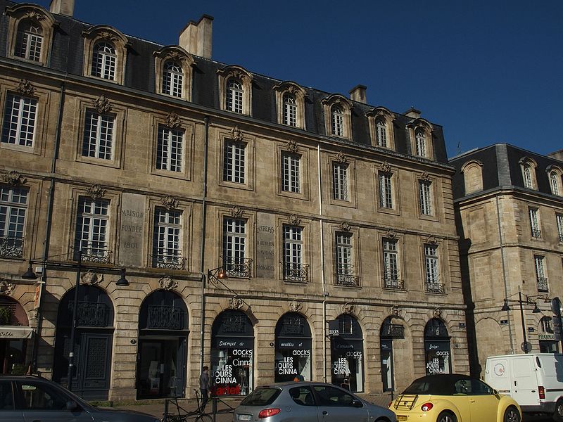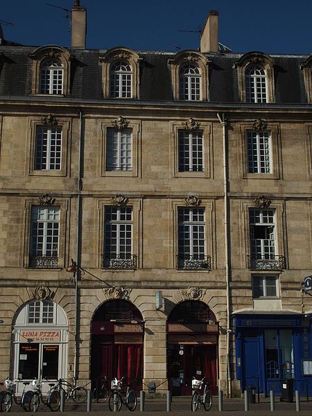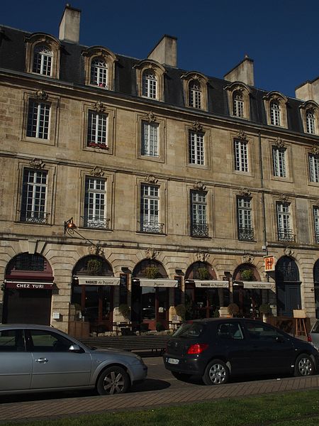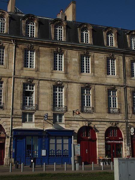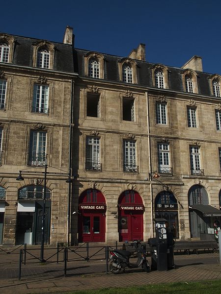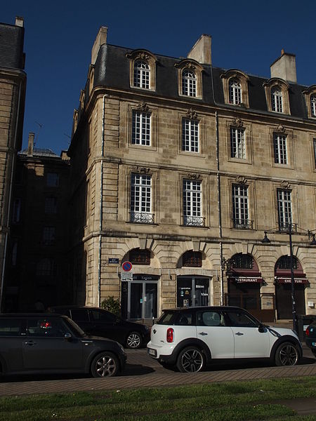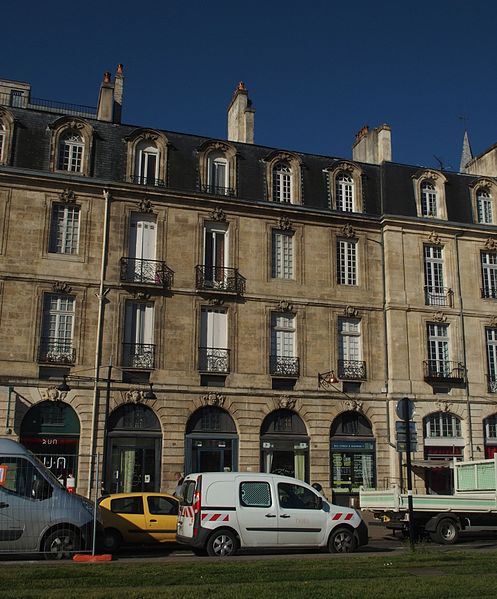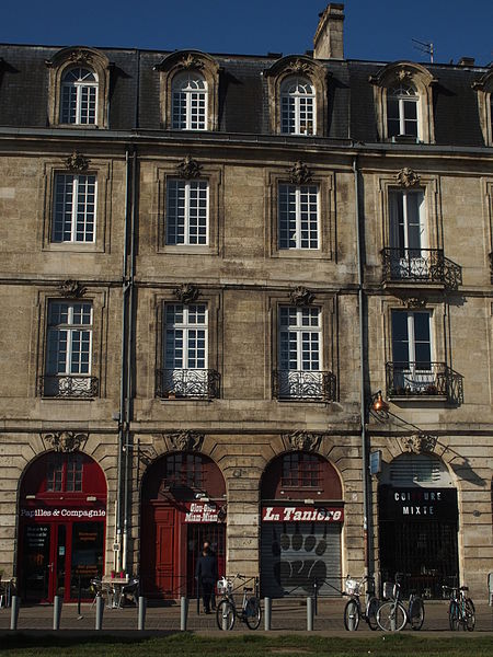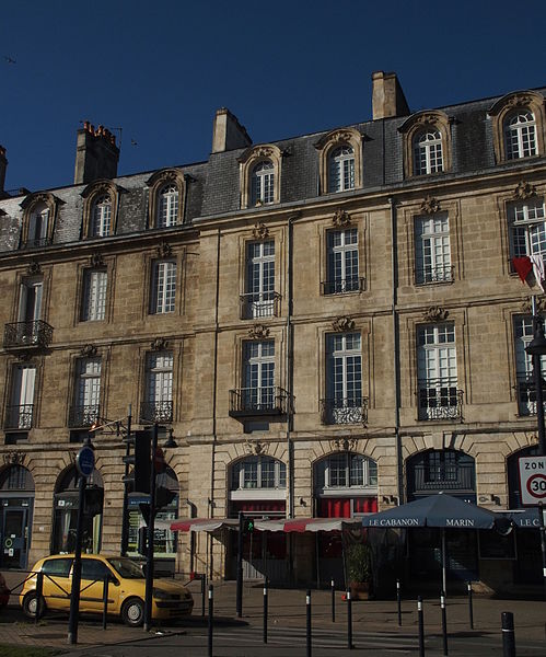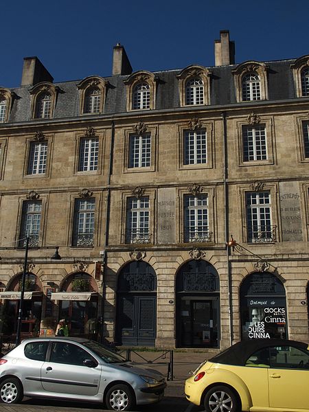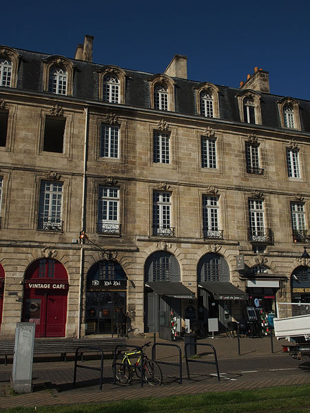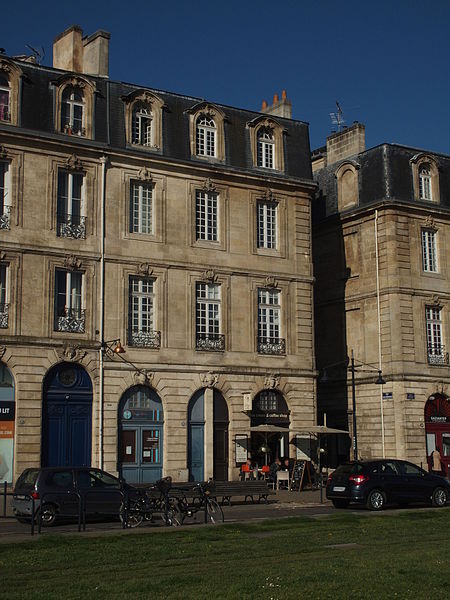 L'idée d'une place royale et d'une façade uniforme le long des quais de la Garonne a mis du temps à s'imposer. En 1729, Jacques Gabriel présente trois projets et, en 1731, il réalise le quai de la Douane et les façades en bordure du fleuve. En 1746, l'intendant Claude Boucher obtient des jurats l'acceptation de la première création d'un quai. À la mort de Boucher, Aubert de Tourny reprend le projet avec Ange-Jacques Gabriel, fils de Jacques. La perspective monumentale, édifiée en 1748 à l'initiative de Tourny, prolonge la place de la Bourse, ancienne place Royale, face au fleuve. L'ordonnance architecturale est homogène : un rez-de-chaussée et un entresol formant soubassement, inscrits dans une série d'arcades en plein cintre, puis deux grands étages carrés surmontés d'un comble à la Mansard percé de lucarnes en pierre. Le soubassement est souligné par des refends et de riches motifs sculptés aux clés des arcades. Si certaines façades ont perdu leurs appuis ou leurs balcons en fer forgé, elles conservent leur caractère grâce à leurs encadrements et à leurs larmiers d'origine. L'installation de magasins au rez-de-chaussée a parfois porté atteinte aux arcades.