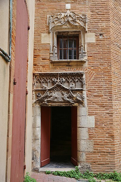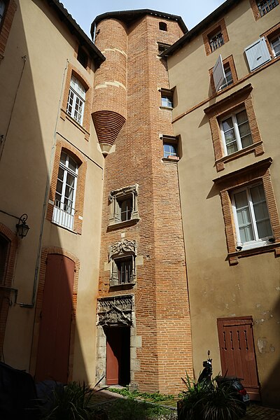 L'édifice conserve une tour gothique dont la porte est surmontée d'un linteau où deux griffons ailés soutiennent un blason martelé. L'intérieur du cadre, au-dessus du linteau, est orné d'une série de petites arcatures imitant des boiseries gothiques. La petite fenêtre qui domine la porte porte, au‑dessus de l'accolade, une fleur de lys au milieu de rinceaux de feuillage embroussaillé. Vers l'angle rentrant de la façade nord, côté cour, se trouve un réservoir de plomb pour la conduite des eaux portant la date de 1775, époque de la construction de l'aile nord de la cour édifiée par le capitoul Jehan Taverne.