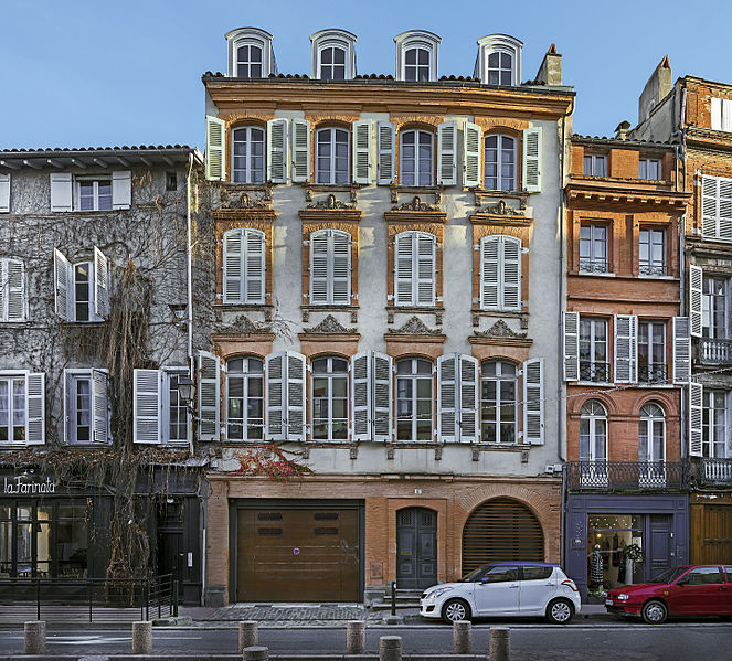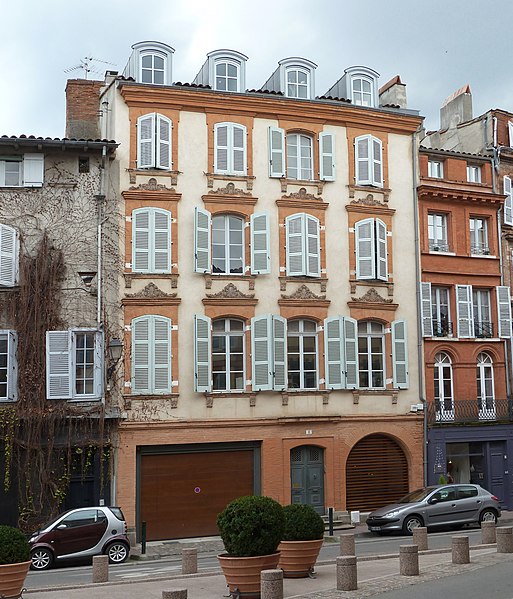 La façade comporte trois étages de hauteur décroissante. Les fenêtres des deux premiers niveaux sont légèrement en saillie et leurs linteaux cintrés sont surmontés d'une corniche ornée d'un motif de feuillages et d'une palmette. Les pentures des hauts contrevents sont scellées dans des pierres dont la blancheur contraste avec le rose de la brique.