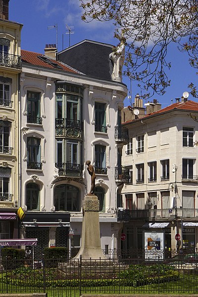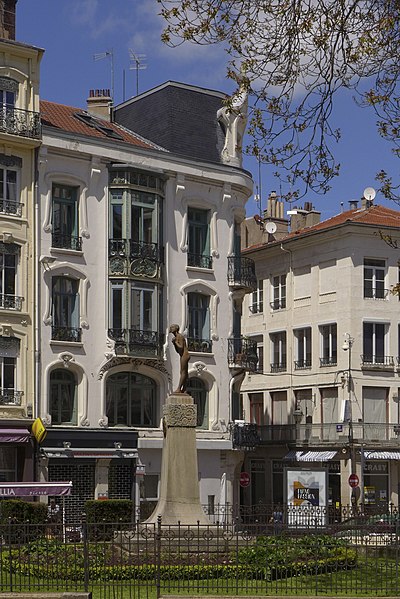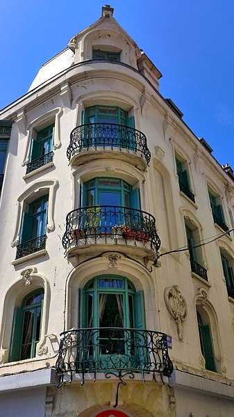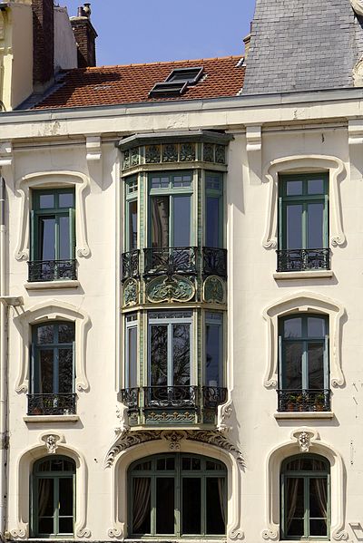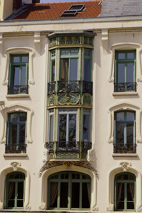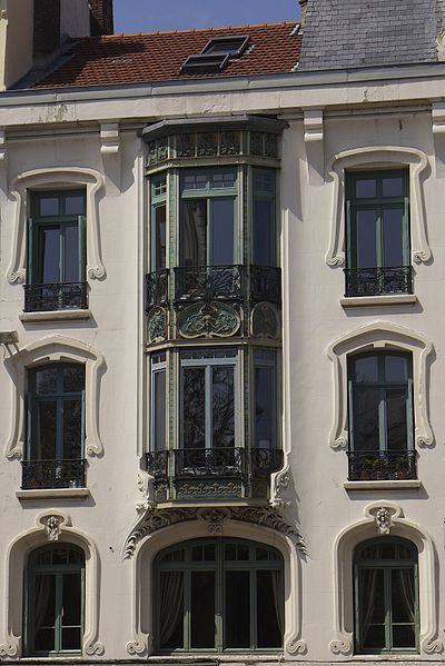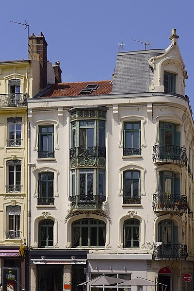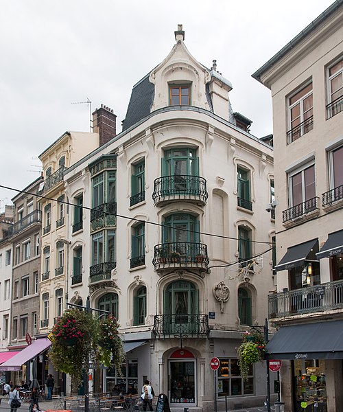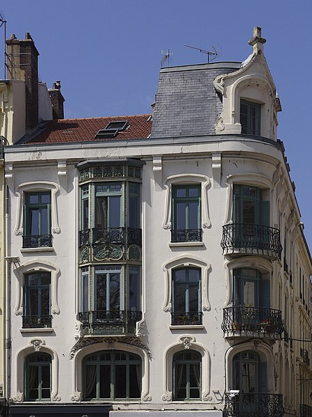 Construit en 1904, cet immeuble d'angle s'organise autour d'une cour intérieure et présente en façade principale un rez-de-chaussée élevé sur caves surmonté de trois étages carrés. La travée centrale des deuxième et troisième étages comprend un bow-window métallique orné d'une ferronnerie de style Art Nouveau. Les portes-fenêtres sont dotées de garde-corps en ferronnerie du même style que le bow-window. Chaque étage dessert deux portes palières, ouvrant chacune sur deux immeubles distincts. Sauf au troisième étage, les appartements ont été réaménagés et ont perdu leurs volumes initiaux.