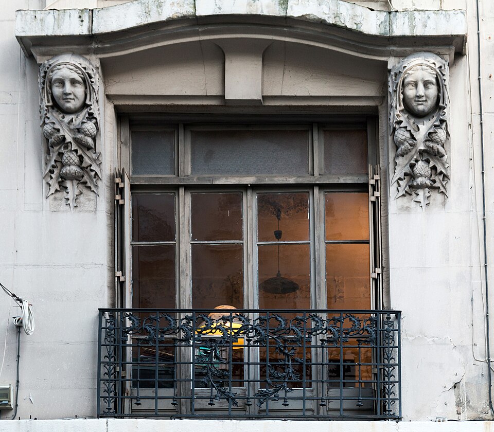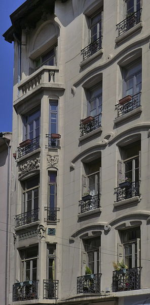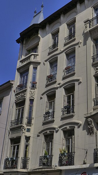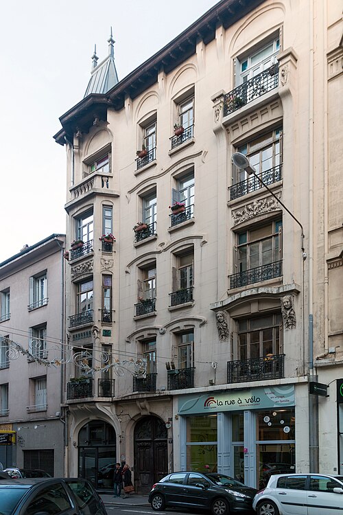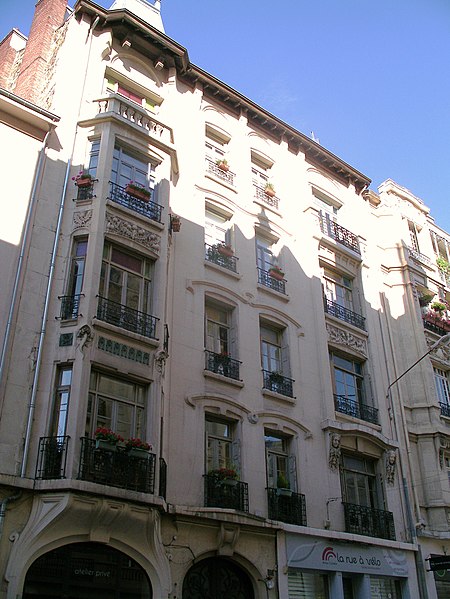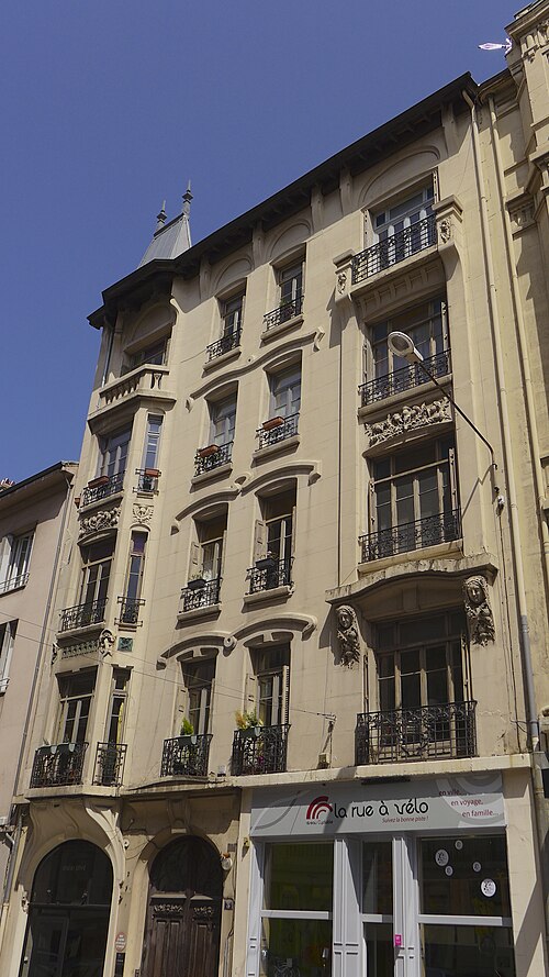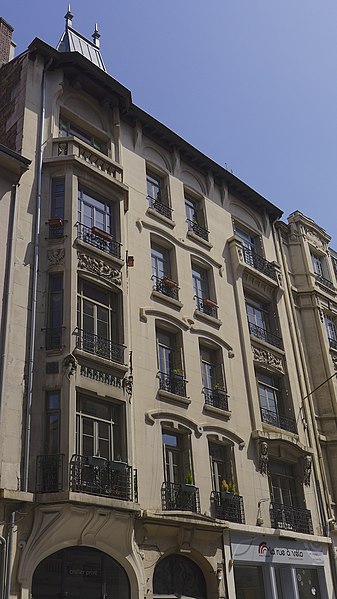L'immeuble, construit en 1911, s'élève sur cinq niveaux et s'organise en quatre travées. La première travée présente, jusqu'à l'avant-dernier niveau, un bow-window. Les deux travées centrales sont percées de baies rectangulaires surmontées d'arcs de décharge curvilignes décoratifs. La dernière travée comporte de larges baies rectangulaires dont la décoration évolue avec l'élévation.