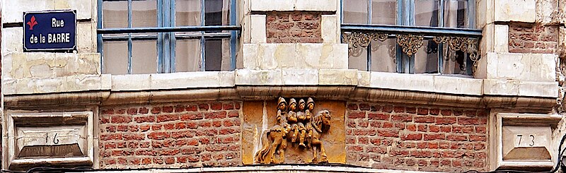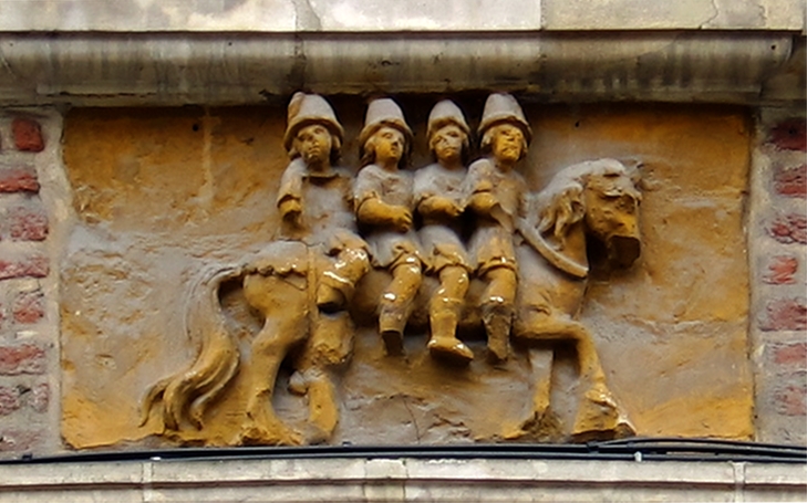 La pierre sculptée représentant les quatre fils Aymon placée dans le mur de façade au-dessus du rez-de-chaussée : inscription par arrêté du 14 mars 1944