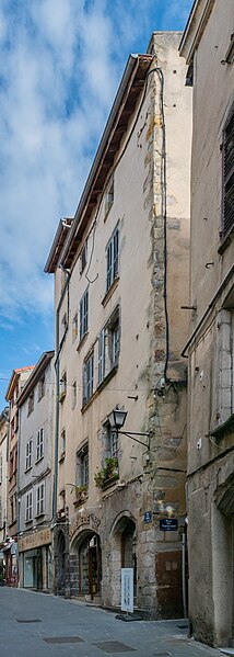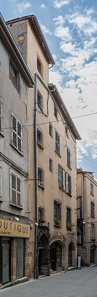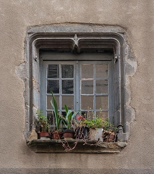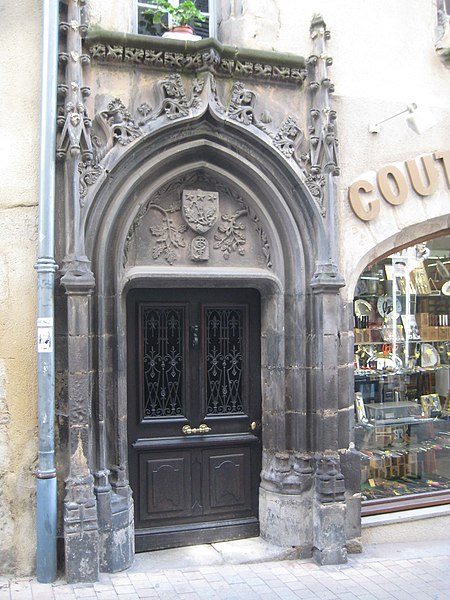 L'immeuble s'ouvre par une porte du XVe siècle, composée d'un cadre surmonté d'un tympan en arc brisé. De petits contreforts accolés, terminés par des pinacles, portent une moulure d'archivolte ornée de crochets déliés et de choux frisés. L'extrémité de l'accolade s'articule avec l'appui mouluré et sculpté de la fenêtre supérieure, dont le boudin supérieur contourne la saillie de cette extrémité.