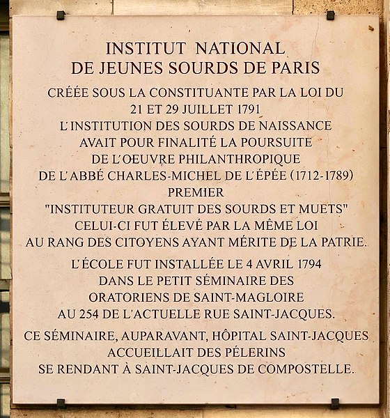 L'Institut national des jeunes sourds de Paris, également surnommé Institut Saint-Jacques, est un établissement français d'enseignement gratuit spécialisé dans l'éducation des jeunes sourds, fondé en 1791 et installé au 254, rue Saint-Jacques dans le 5e arrondissement depuis 1794 ; il compte parmi les plus anciens établissements scolaires pour sourds au monde. En 1772, douze ans après l'ouverture de la première école pour sourds à Édimbourg, le prêtre Charles-Michel de L'Épée ouvrit à Paris une école informelle au 14 de la rue des Moulins pour développer une méthode pédagogique distincte de celle de Jacob Rodrigue Pereire, mais il rencontra des difficultés de financement, l'archevêché de Paris refusant son aide en raison de sa réputation de janséniste. Le 21 novembre 1778, Louis XVI lui accorda une pension de 6 000 livres et plaça l'institution sous protection royale, lui assurant un soutien financier. Un arrêt du 25 mars 1785 érigea l'institution en établissement d'éducation et ordonna son transfert au couvent des Célestins, dont le patrimoine était revenu à l'État après la suppression du monastère en 1778. À la mort de l'abbé de L'Épée en 1789, l'abbé Sicard lui succéda. En juillet 1791, un décret proposa de créer l'Institution des sourds-muets de Paris pour poursuivre l'œuvre philanthropique de l'abbé de L'Épée ; la loi votée à la fin du mois honora ce bienfaiteur et réattribua à l'établissement les biens de l'ancien couvent afin qu'ils ne figurent pas parmi les biens nationaux destinés à la vente. Le 28 septembre 1791, l'école des aveugles de Valentin Haüy rejoignit l'école des sourds au couvent des Célestins, et le premier règlement de l'Institution des sourds-muets et des aveugles-nés fut publié le 17 février 1792. En février 1793 l'abbé Sicard demanda la séparation des deux écoles ; la Convention nationale autorisa en février 1794 le placement des sourds-muets dans l'ancien séminaire Saint-Magloire, à l'angle de la rue Saint-Jacques et de la rue des Deux-Églises (future rue de l'Abbé de l'Épée), où l'institut s'installa en avril 1794 et demeure aujourd'hui. Un décret de la Convention du 5 janvier 1795 assimila et régla l'institution de Bordeaux sur le modèle parisien. À la fin de l'année 1800, Jean Itard fut nommé médecin de l'institution, fonction qu'il conserva jusqu'à sa mort en 1838. Les bâtiments furent reconstruits en 1823 par l'architecte Antoine-François Peyre. L'établissement a été dirigé par une succession de directeurs parmi lesquels l'abbé de L'Épée, l'abbé Sicard, Ernest Javal, Victor Collignon, François Xéridat, Robert Colin, et, plus récemment, Élodie Hemery et Paul Flad. De nombreux élèves et professeurs sourds y ont été formés ou ont enseigné, parmi eux Laurent Clerc, Jean Massieu, Ferdinand Berthier, René Princeteau et Bruno Braquehais. Parmi les directeurs, professeurs et médecins qui ont marqué l'institut figurent l'abbé de L'Épée, l'abbé Sicard, Jean Itard, Roch-Ambroise Auguste Bébian, Charles Cros et Pierre Michel Adam. L'institut a également servi de lieu de tournage : François Truffaut y a filmé L'Enfant sauvage (1970) et une place de l'institut porte son nom ; en 1977 il retourna à l'établissement pour choisir un jeune sourd, Patrick Maléon, pour son film La Chambre verte, où il joue aux côtés de Nathalie Baye. Le groupe sourd sud-coréen Big Ocean a choisi l'institut pour le clip de Flow, tourné le 12 novembre 2024. Des établissements apparentés sont l'Institut national des jeunes sourds de Bordeaux-Gradignan et l'Institut national des jeunes aveugles ; l'institut possède par ailleurs un site officiel et figure dans les portails consacrés à l'éducation, à la culture sourde et à la ville de Paris.