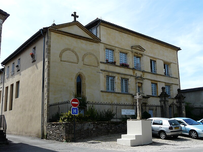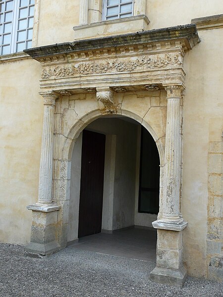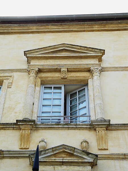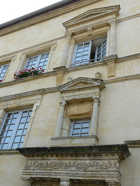 La façade, de style classique et datée du XVIe siècle, présente une porte encadrée de colonnes et surmontée d'un entablement orné d'une frise sculptée. Deux croisées, chacune pourvue de colonnes et de frontons triangulaires, rythment la composition. L'ensemble est couronné d'une corniche en pierre de taille.