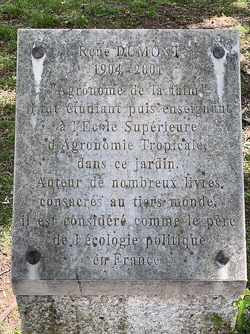 Le Jardin d'agronomie tropicale René‑Dumont est un espace vert situé à l'extrémité orientale du bois de Vincennes, à la lisière de Nogent‑sur‑Marne. Il occupe le site de l'ancien jardin d'essai colonial créé en 1899 par l'agronome et explorateur Jean Dybowski pour coordonner les expériences sur les plantes des colonies françaises, telles que caféiers, bananiers, arbres à caoutchouc, cacaoyer et vanillier. L'ensemble couvre environ 6,5 hectares, dont 4,5 hectares ouverts au public ; le reste est occupé par des bâtiments de recherche, notamment du Centre de coopération internationale en recherche agronomique pour le développement (CIRAD). L'accès unique se fait côté sud‑est par l'avenue de la Belle‑Gabrielle ; la station de RER la plus proche est Nogent‑sur‑Marne à 400 mètres et la station de métro Château de Vincennes se trouve à plus de 2,5 kilomètres. Le jardin, l'un des plus vastes du 12e arrondissement après le bois, le parc de Bercy et la coulée verte René‑Dumont, présente une végétation principalement endémique à l'Île‑de‑France ; seules quelques espèces tropicales subsistent, comme le bambou, l'arbre à latex et le kaki. Le terrain est plat ; au nord se situe un petit étang artificiel alimenté par un ruisseau lui aussi artificiel.