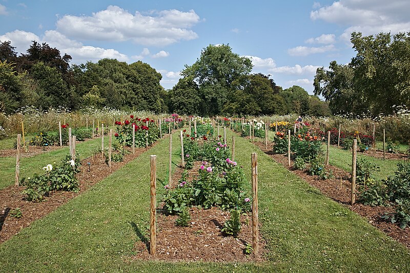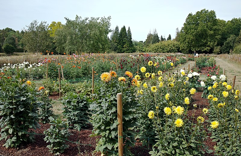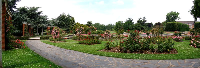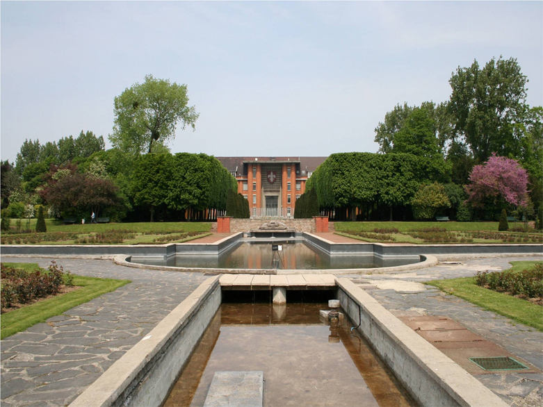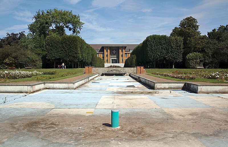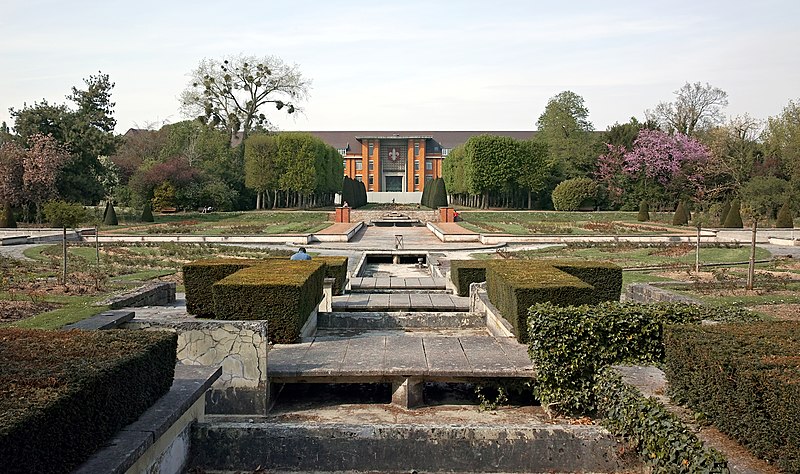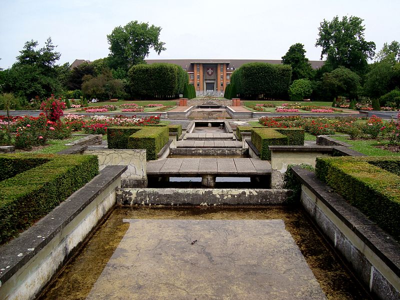 La perspective centrale se prolonge par une terrasse surplombant les bassins, organisés en croix selon les points cardinaux, avec une fontaine à déversement marquant la rupture de pente et un ensemble de bassins en escalier formant des cascades aboutissant à une fontaine à jets. La grande roseraie borde ces bassins et s’élève en terrasses circulaires desservies par des escaliers et des cheminements. À l’est et à l’ouest, des massifs de rhododendrons encadrent l’ensemble, tandis qu’au sud un péristyle Art déco, rythmé de cratères à bas-reliefs d’inspiration antique, célèbre les sports et les jeux de plein air. En été, le jardin présente une importante collection de dahlias.