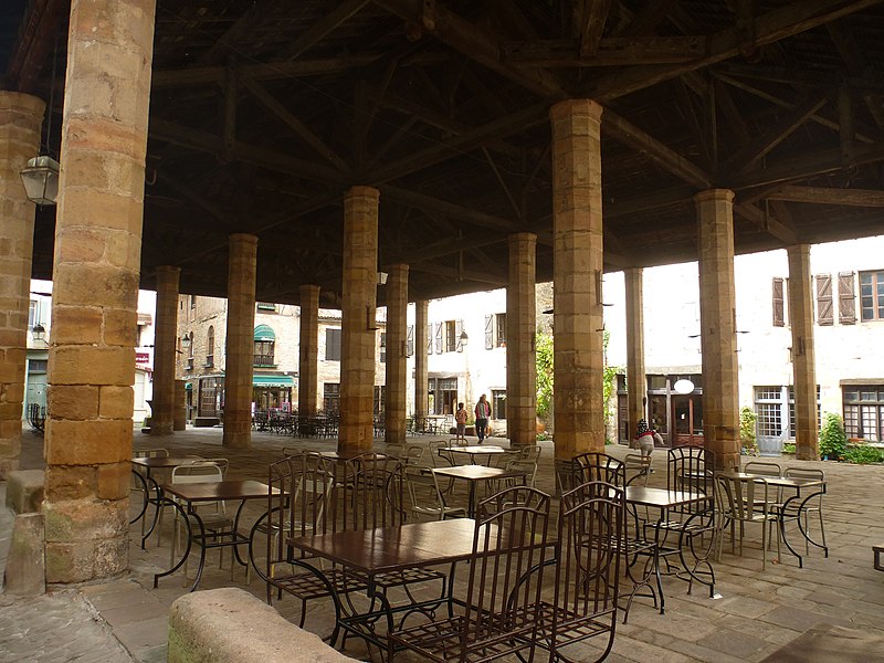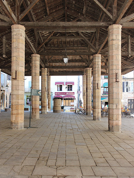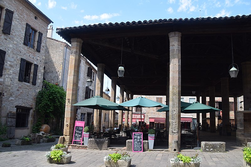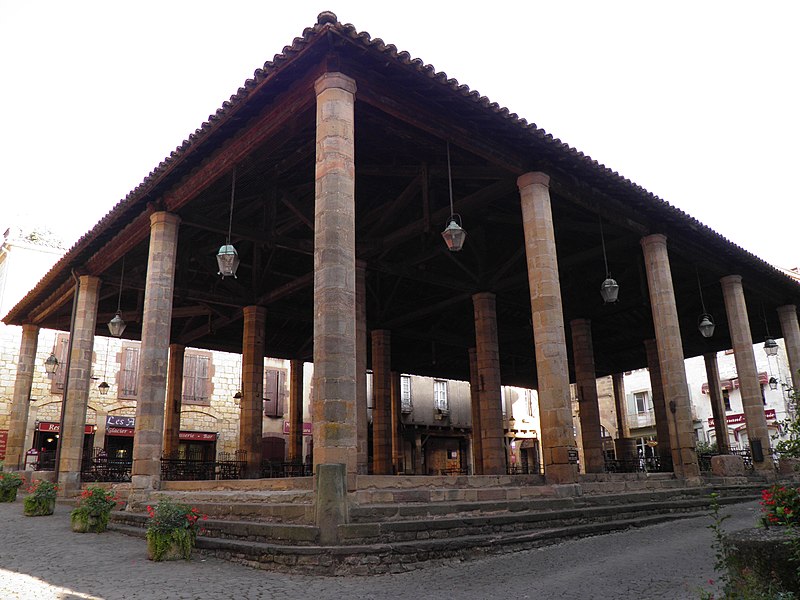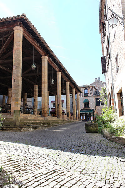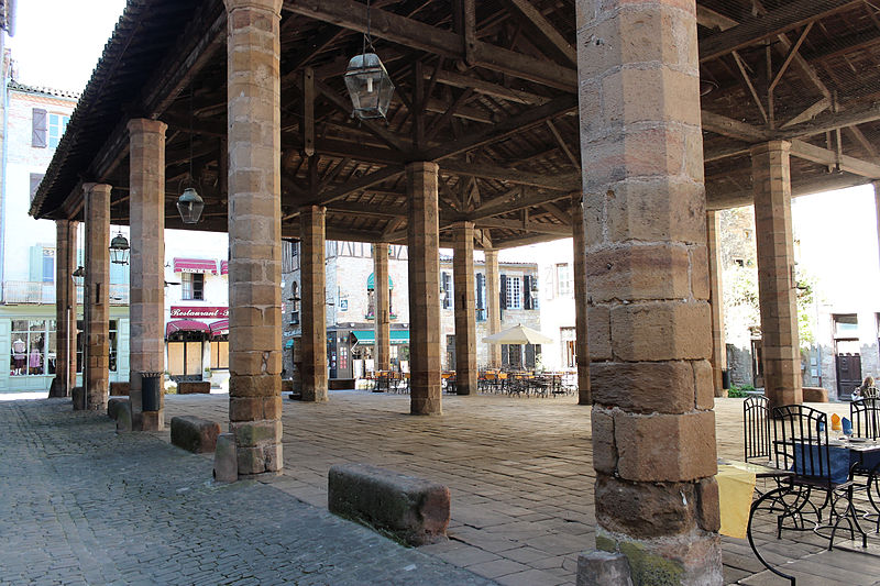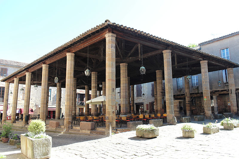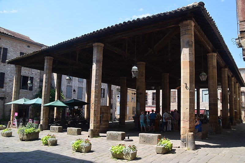 Les halles de Cordes-sur-Ciel datent du XIVe siècle et ont été construites pour la vente du cuir et des étoffes, à une époque où la ville prospérait comme centre de production de tissus brodés et de cuirs ouvragés. Cordes possédait depuis 1273 le droit de faire de la Saint-Barthélemy la fête communale, saint patron des tanneurs, et les commerçants firent couvrir la place du marché en 1276; un octroi du lieutenant du roi en Languedoc, daté de 1358, autorisa la reconstruction de la halle pour favoriser le commerce. Classées monument historique depuis le 28 janvier 1944, les halles occupent le point haut de la ville, au carrefour de la grande rue Raymond VII, de la rue Saint-Michel et d'une ruelle qui descend vers le Portanel. Elles consistent en une aire dallée de pierre mise à niveau, accessible par des emmarchements adaptés aux différences de niveaux. Vingt-quatre piliers de pierre, de section octogonale et pourvus d'un chapiteau simple sans ornementation, soutiennent une charpente en bois à quatre pans recouverte de tuiles canal. L'ensemble privilégie l'aspect fonctionnel : un anneau fixé à l'un des piliers a servi longtemps à l'exposition des animaux pour la boucherie, et des bancs de pierre entourent le pourtour. La toiture a été refaite au XIXe siècle; en revanche, s'il n'existe pas de document confirmant le remplacement des piliers, leurs nombreuses réparations laissent planer un doute sur leur appartenance intégrale au XIVe siècle. Sous les halles se trouve un puits, dont la margelle est proche d'une croix elle aussi classée au titre des monuments historiques. Selon la tradition, ce puits aurait plus de cent mètres de profondeur; il est signalé comblé depuis 1647 puis provisoirement rouvert en 1790 et en 1826. Un sondage réalisé en 1914 atteignait 86 mètres, tandis qu'une mesure de 114 mètres figure dans d'autres relevés. Des travaux entrepris par une équipe de spéléologues cordais ont repris les sondages à partir de 86 m en 1955 et ont permis d'atteindre 114 m en 1961. Le fond du puits est dallé de pierres calcaires rectangulaires finement taillées; la galerie, creusée dans la roche, présente des diamètres et des sections variables : 2,80 m sur 13 m, puis 2 m sur 21 m et enfin 1,70 m sur 51 m, cette dernière partie étant maçonnée en blocs calcaires. Le niveau d'eau se maintient autour de 12 mètres, correspondant à un volume estimé d'environ 33 m3. Les halles témoignent ainsi de l'activité commerciale et artisanale médiévale de Cordes-sur-Ciel, matérialisée par une architecture sobre et fonctionnelle adaptée aux besoins du marché.