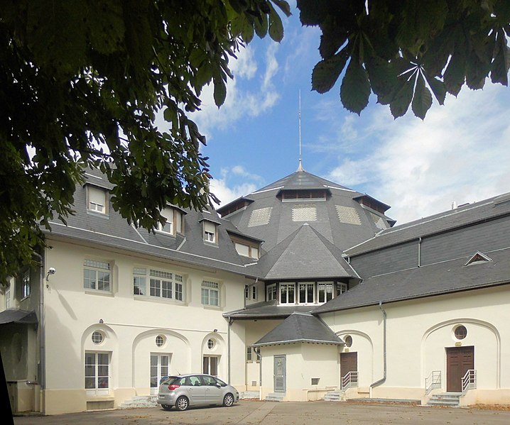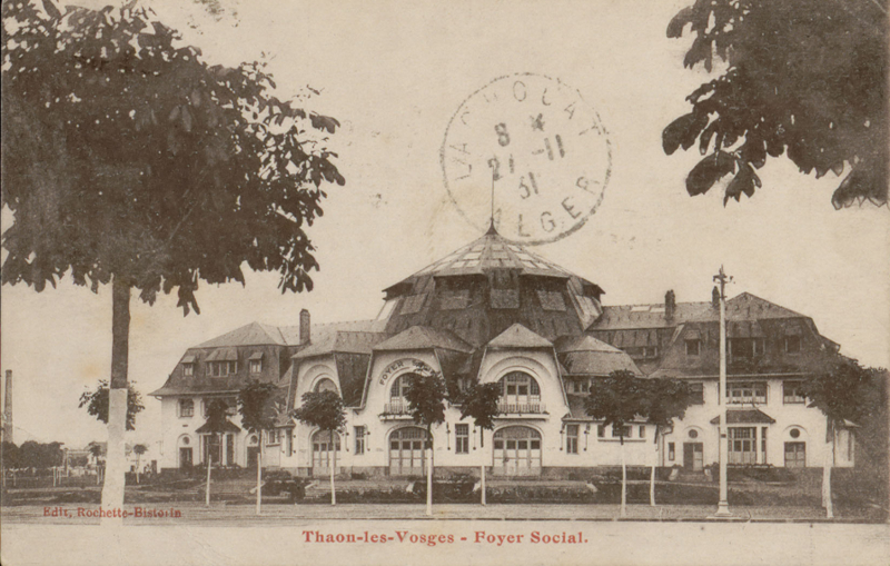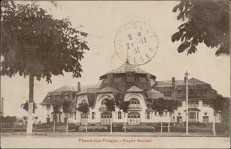 La Rotonde est un foyer patronal destiné à accueillir de multiples activités sociales, sportives et culturelles ; il comprenait notamment un théâtre et des salles de sociétés. Sa construction a débuté en 1910 à l'initiative de l'entreprise de blanchisserie et teinturerie de Thaon, propriétaire d'une cité ouvrière de 1 300 logements. Son plan en forme de croix de Lorraine est l'œuvre de l'architecte Desclers, qui propose un parti mi-régionaliste, mi-moderne. L'édifice a été prolongé par des extensions réalisées par l'architecte Albert Hébrard en 1920. La grande salle de la rotonde est décorée de peintures murales par Löys Prat.