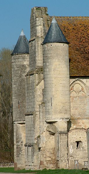 Les constructions actuelles s'organisent autour d'un plan carré : les côtés nord et ouest sont occupés par des murs, le côté sud accueille une chapelle composée de deux travées barlongues voûtées d'ogives, et le côté est est bordé par un grand bâtiment. Ce dernier, long de 28 mètres sur 10 et élevé à l'origine d'un étage, a suscité diverses interprétations quant à sa fonction — maladrerie, logis de l'abbé, réfectoire et dortoir des hôtes ou maison abbatiale — proposées par plusieurs spécialistes. Son architecture présente des analogies avec la galerie des Merciers du Palais royal de l'île de la Cité, attribuée au temps de saint Louis, mais cette datation paraît trop ancienne ; les analyses récentes le situent plutôt au premier quart du XIVe siècle et l'attribuent à l'abbé Thierry II ou Théodoric de Suisy (vers 1328-1360). Le lien familial d'Étienne de Suisy avec les hautes sphères ecclésiastiques et royales est également documenté.