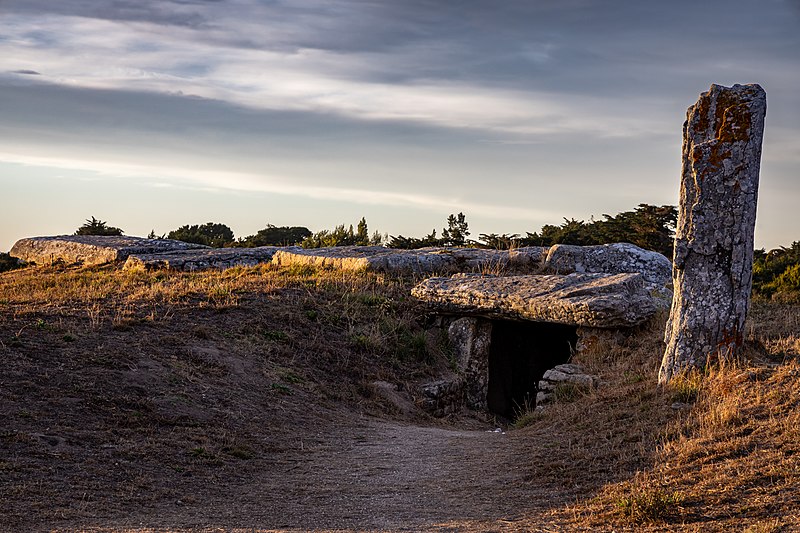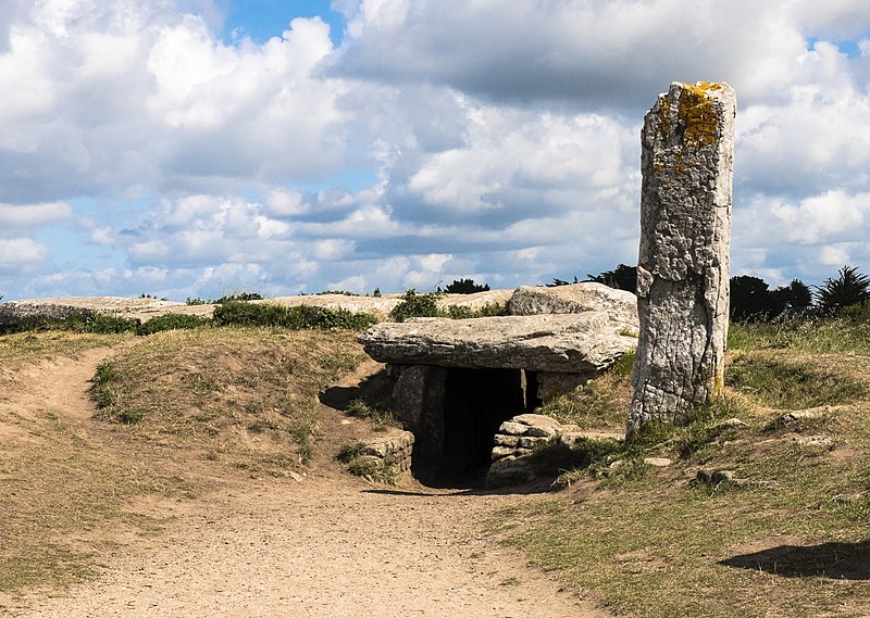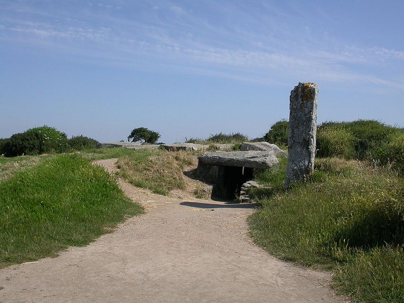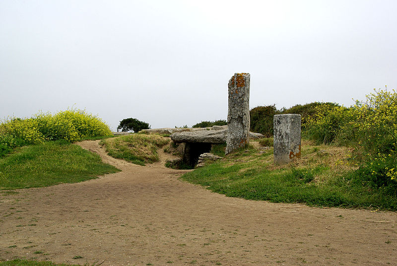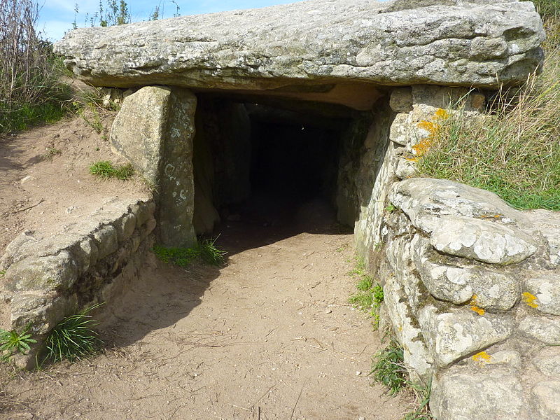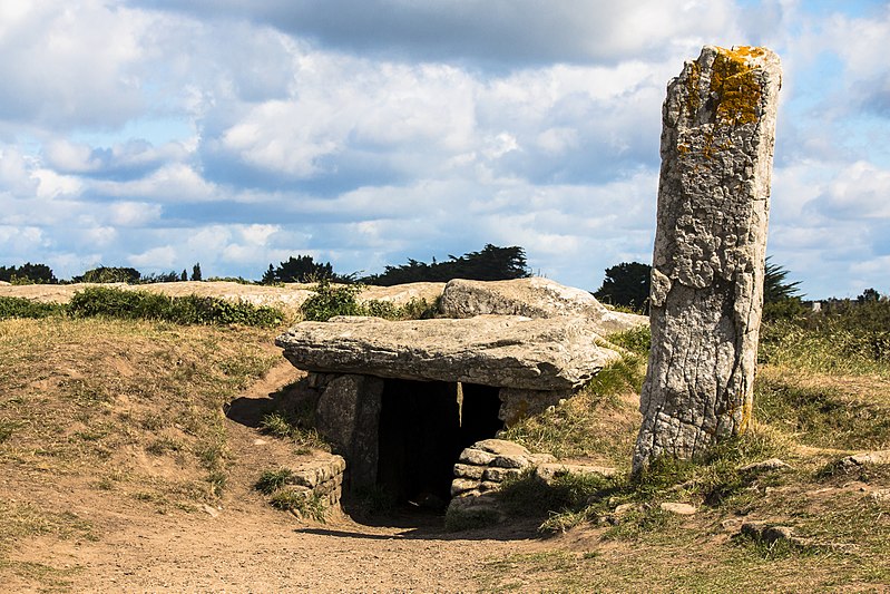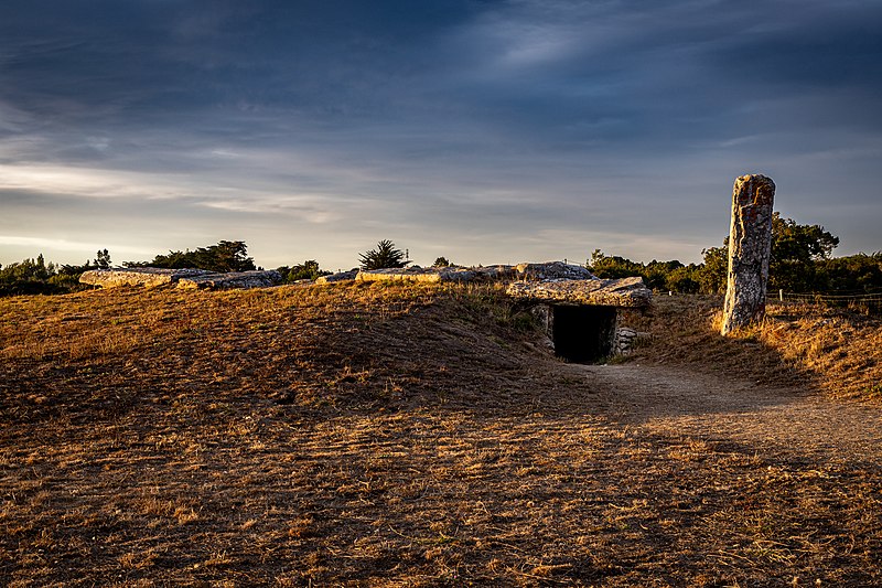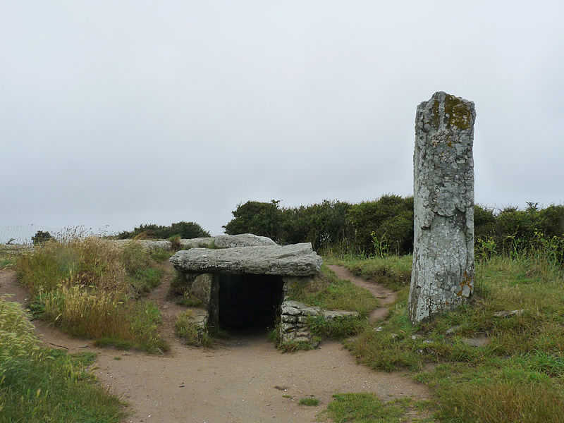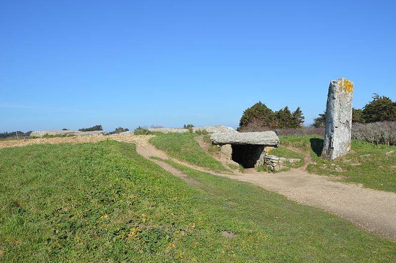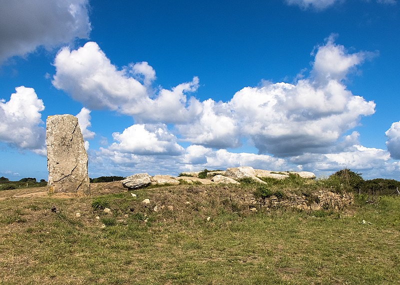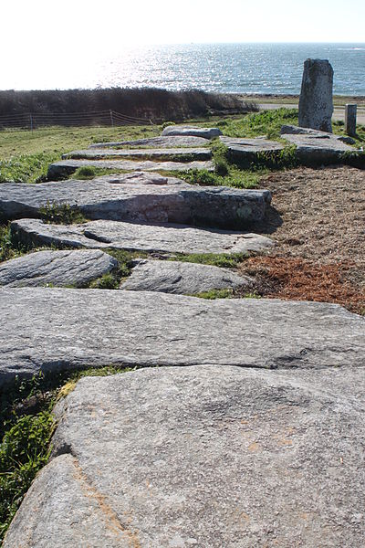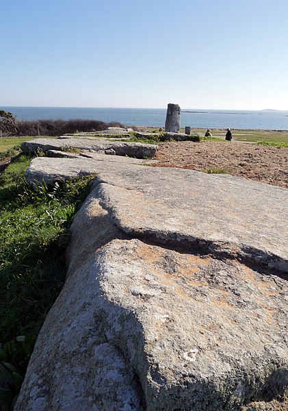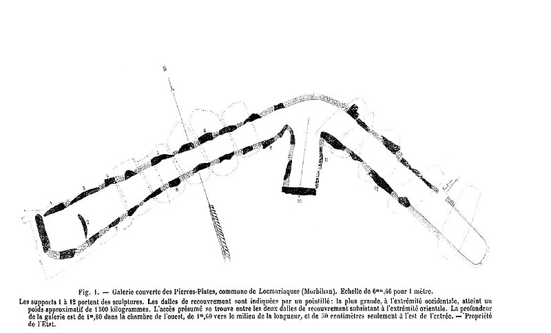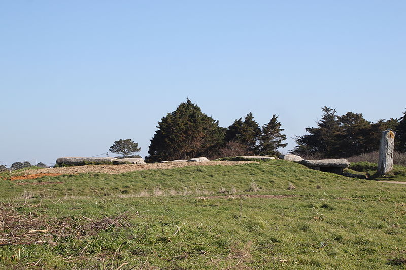 Le « menhir indicateur » jouxtant l’entrée est un pseudo‑menhir dressé en 1936 par Le Rouzic ; aucun témoignage n’atteste sa présence antérieurement. Cette pierre, comme plusieurs tables de couverture, porte de nombreuses cupules et correspond à une dalle qui, au XIXe siècle, était couchée en travers de l’accès au couloir et pouvait être une ancienne dalle de couverture.
