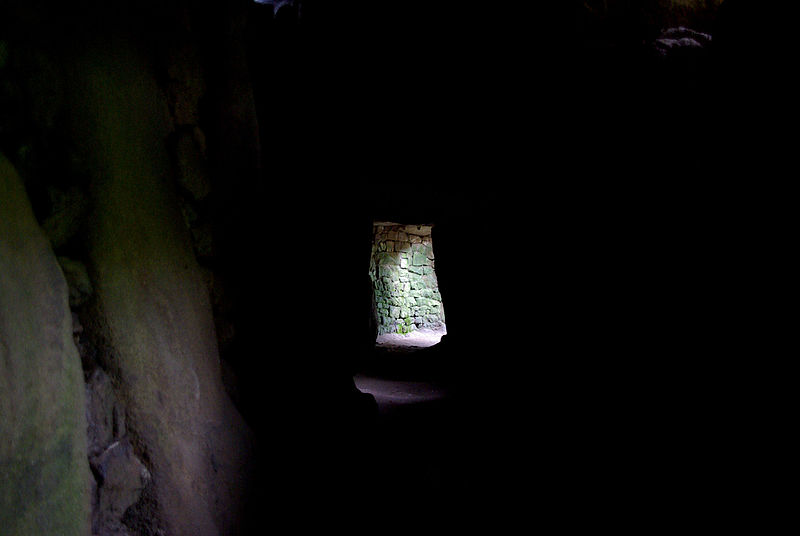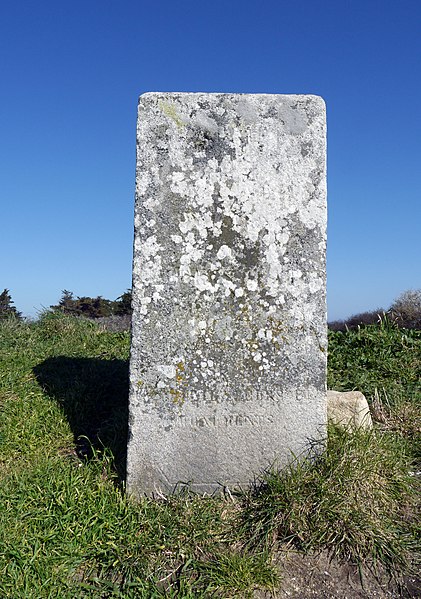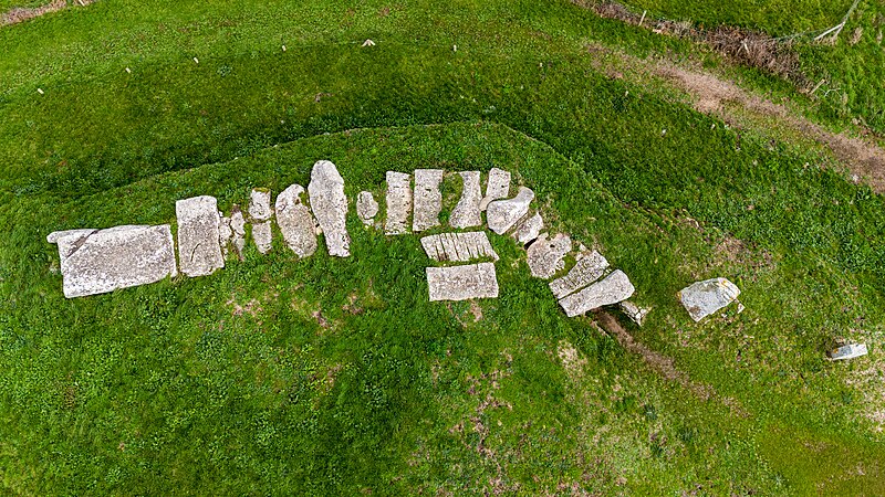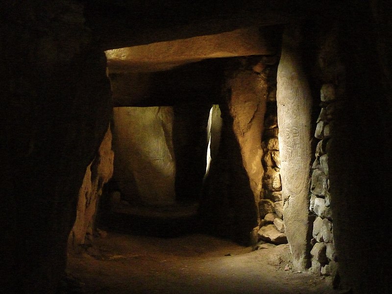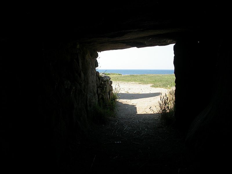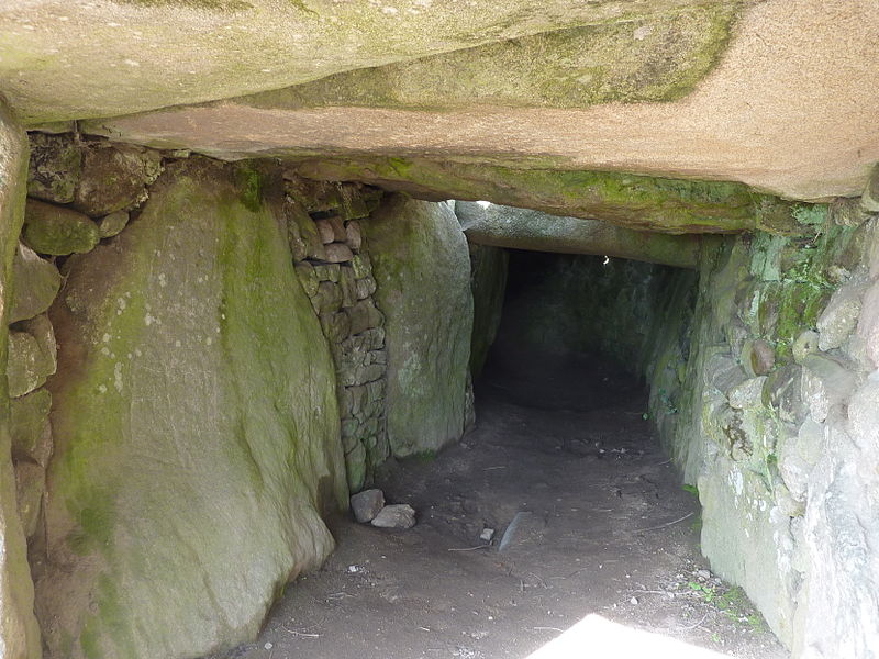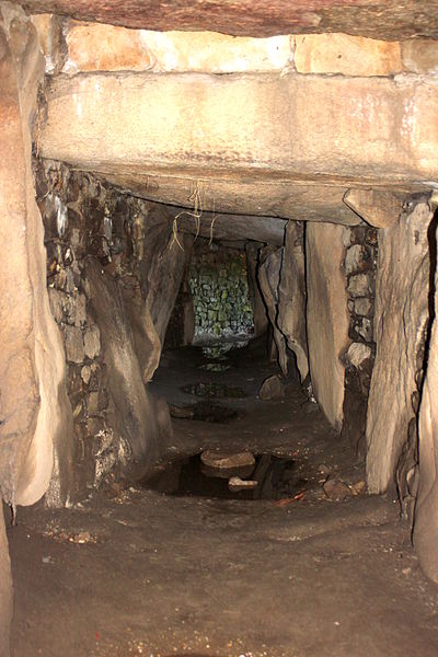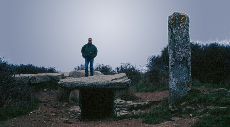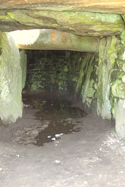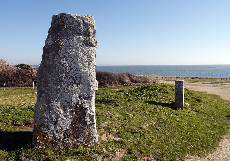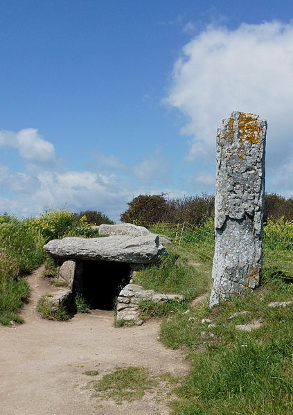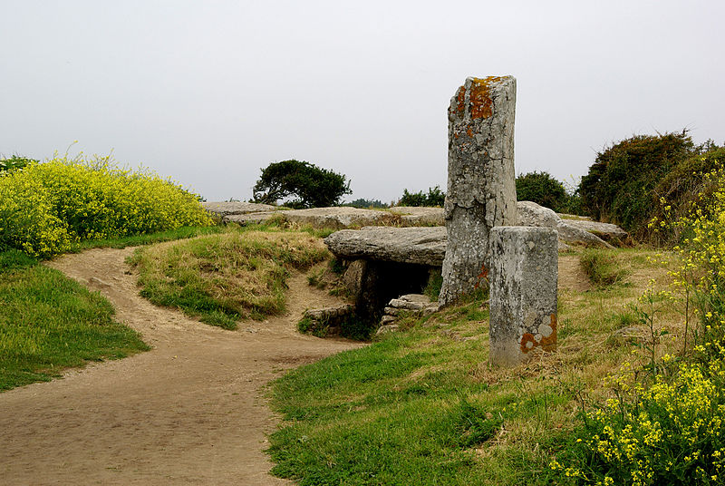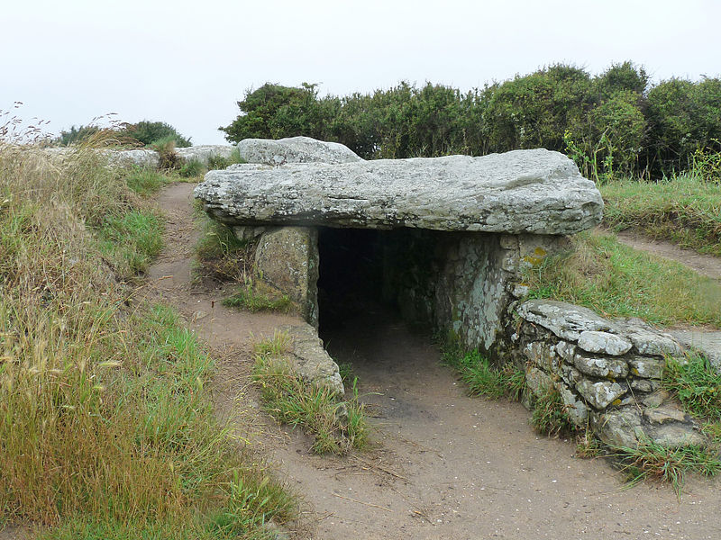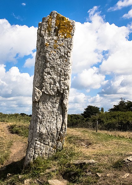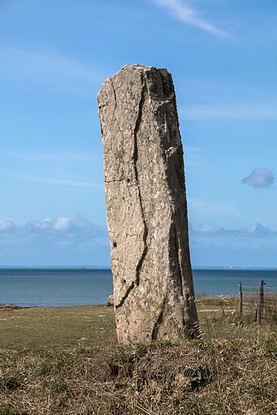 Le « menhir indicateur » jouxtant l’entrée est un pseudo‑menhir dressé en 1936 par Le Rouzic ; aucun témoignage n’atteste sa présence antérieurement. Cette pierre, comme plusieurs tables de couverture, porte de nombreuses cupules et correspond à une dalle qui, au XIXe siècle, était couchée en travers de l’accès au couloir et pouvait être une ancienne dalle de couverture.