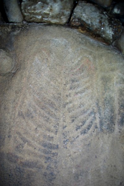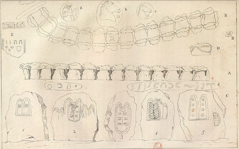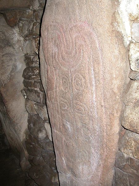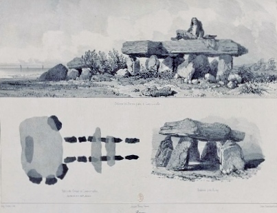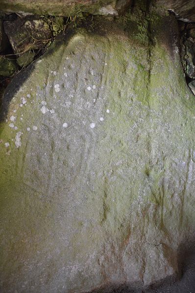 Douze orthostates présentent des gravures ; la comparaison entre le relevé de Dubois et les dalles encore visibles laisse supposer qu’une dalle gravée a disparu depuis 1813. Le motif le plus fréquent est de type scutiforme, souvent sous la forme de cartouches divisés verticalement et ornés de cercles et de motifs en forme de « fer à cheval ».
