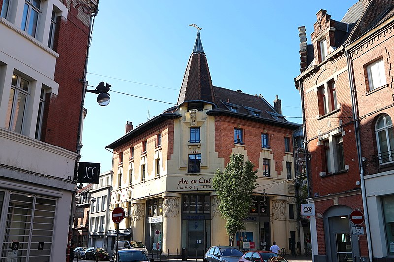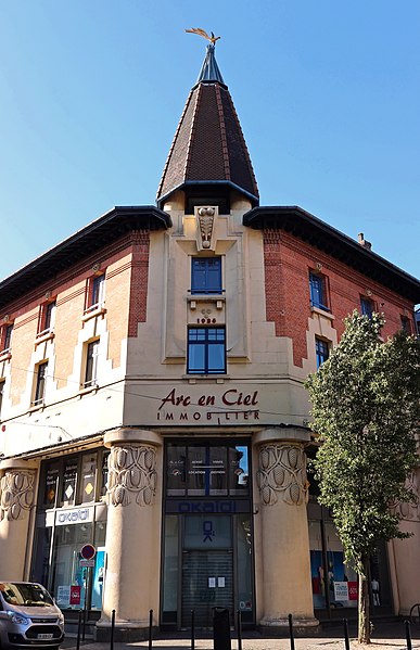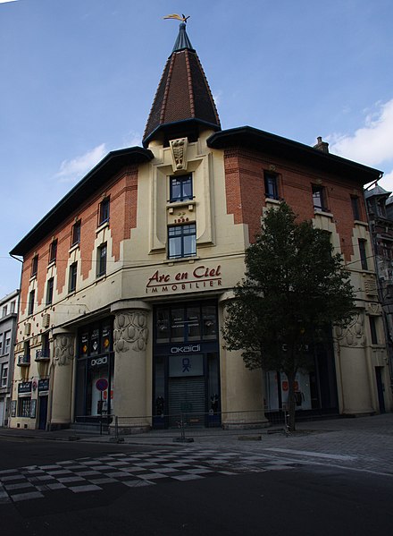 Construite en 1923 lors de la campagne de reconstruction de la ville, cette librairie présente une façade monumentale qui met en valeur le principal carrefour commerçant et symbolise la prospérité de la ville. L'ensemble est traité de façon symétrique et se distingue des niveaux d'habitation ; les entrées de ces logements sont marquées par un décor sculpté. Les façades sont identiques sur chaque rue. Les matériaux employés sont le béton armé et la brique, et le décor de pommes de pin est réalisé en ciment.