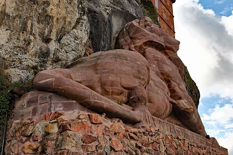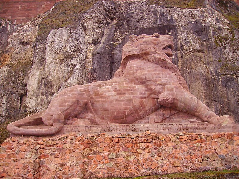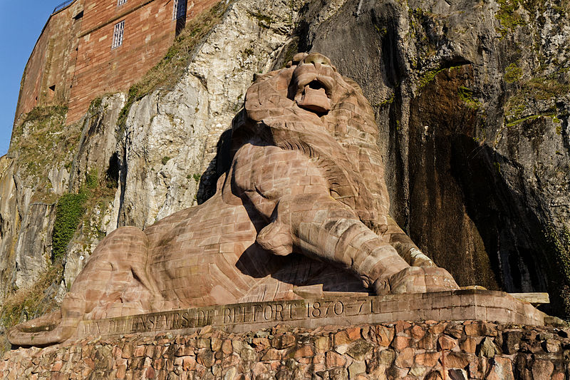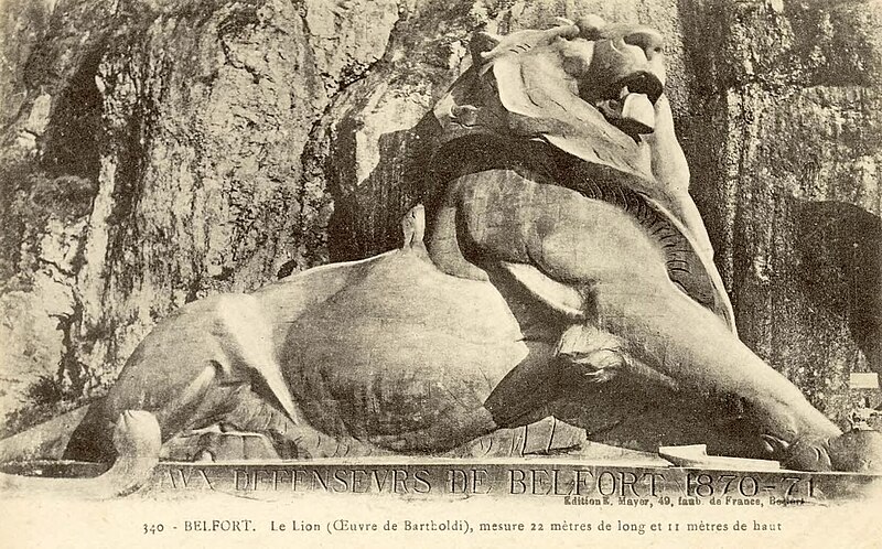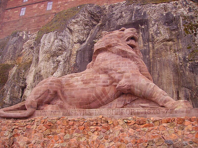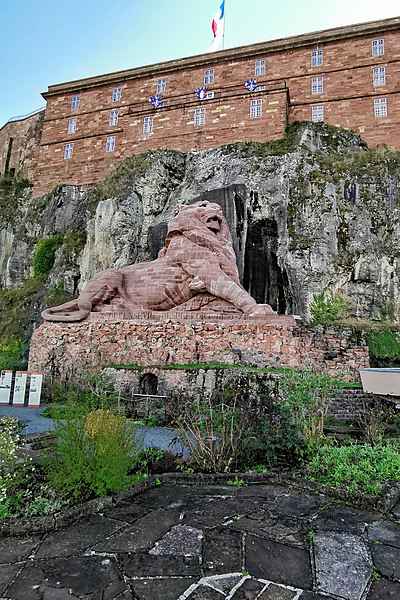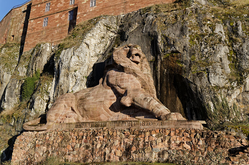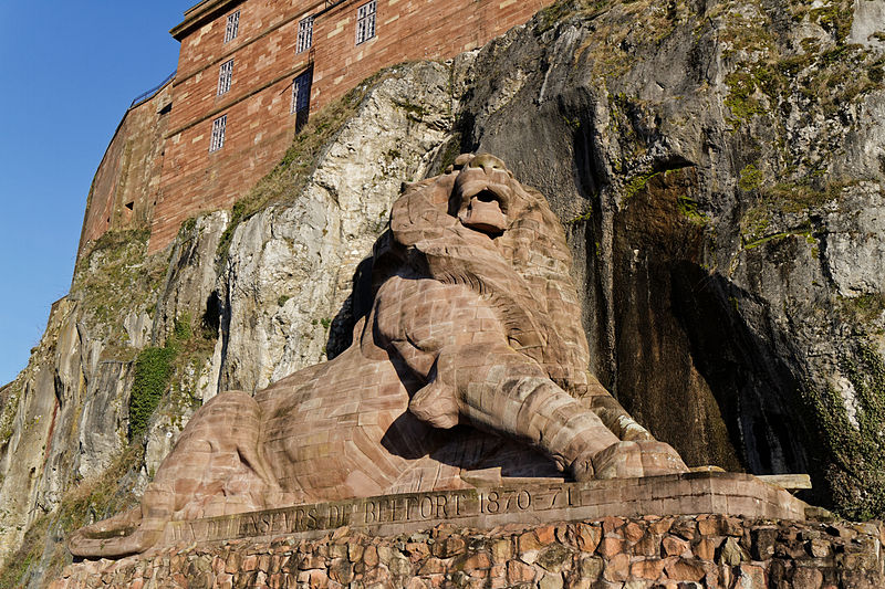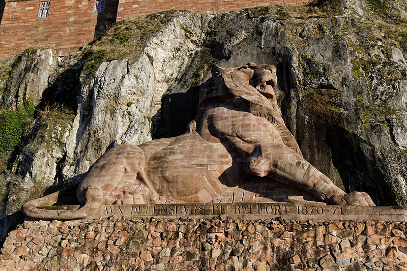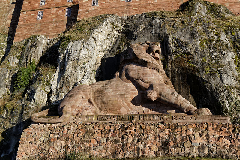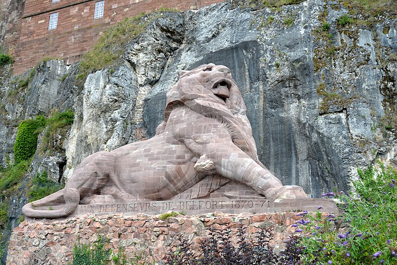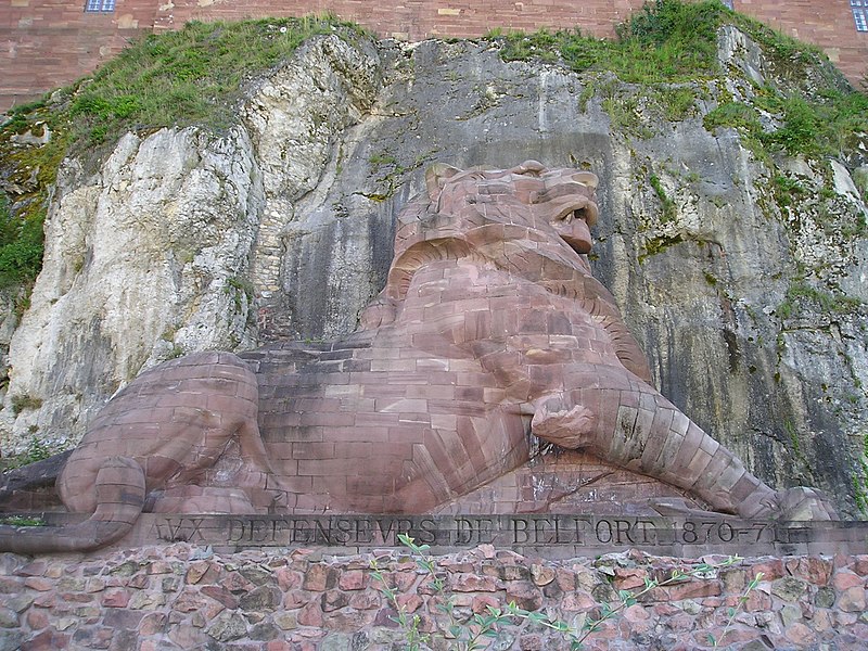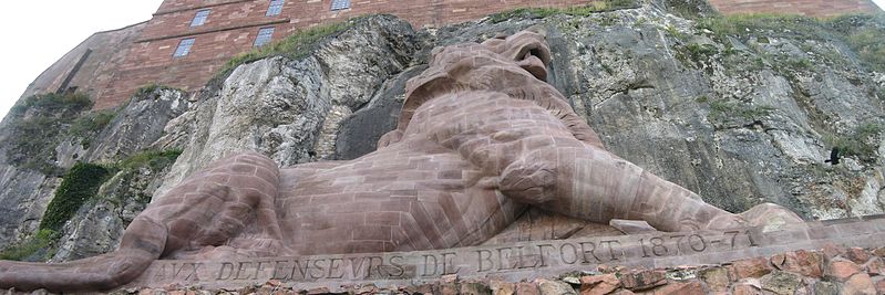 Le Lion de Belfort est une sculpture en haut-relief d'Auguste Bartholdi, installée au pied de la falaise de la citadelle de Belfort. Elle commémore la résistance de la ville assiégée par les Prussiens pendant la guerre franco-allemande de 1870. L'œuvre représente un lion couché, la patte posée sur une flèche qu'il vient d'arrêter, symbolisant l'énergie de la défense plutôt qu'une victoire. Réalisée en blocs de grès rose de Pérouse sculptés individuellement puis assemblés contre la paroi calcaire de la falaise, la statue repose sur un piédestal en rocaillage. Longue de 19,06 m et haute de 10,56 m, elle est la plus grande statue de pierre de France. À la suite de protestations allemandes, Bartholdi a tourné la tête du lion vers l'ouest, tandis que la flèche entre ses pattes reste dirigée vers la frontière allemande. Le monument évoque la résistance menée par le colonel Denfert-Rochereau durant le siège de Belfort. Le projet a été lancé par le conseil municipal le 5 décembre 1871 et Bartholdi, sollicité en 1872, a travaillé pendant cinq ans à des études préparatoires, notamment au jardin des plantes de Paris. Influencé par son maître Jean-Léon Gérôme et par des œuvres comme le Lion de Lucerne, il a inscrit son lion dans le paysage urbain. Les travaux de terrassement ont commencé en 1875 et la dernière pierre a été posée en septembre 1879. En raison d'un différend sur l'utilisation d'un reliquat de la souscription, il n'y eut pas d'inauguration officielle à l'achèvement; Bartholdi organisa néanmoins en 1880 une illumination par des feux de Bengale. La dédicace « Aux défenseurs de Belfort 1870 – 1871 » fut gravée sur le socle grâce aux fonds recueillis par la section de Belfort du Club Alpin Français, alimentés par un droit d'accès mis en place en 1890. L'image du lion a rapidement inspiré poètes, chansonniers et artistes, a servi de modèle et a été largement reproduite sur cartes postales, objets publicitaires et œuvres d'art. Face à la prolifération des reproductions, Bartholdi intente des procès à partir de 1898 et obtient gain de cause. Très vite devenu emblème de la ville, le Lion a été classé monument historique le 20 avril 1931. Des répliques existent à Paris, place Denfert-Rochereau, et à Montréal, au square Dorchester. Le monument a fait l'objet d'inaugurations publiques plus tardives : pour son centenaire en 1981, puis le 18 septembre 2011 lors des journées du patrimoine, cérémonie présidée par le maire Étienne Butzbach et rassemblant 45 000 visiteurs. En 2011 Belfort célébrait aussi les anniversaires liés à la construction du Lion et à la fin du siège. La sculpture a été nettoyée entre avril et mai 2019 pour lui rendre sa couleur d'origine. Une légende affirme que Bartholdi se serait suicidé pour avoir oublié la langue du lion ; lors de la restauration de 2019 il a été constaté que la statue possède bien une langue, et Bartholdi est mort de la tuberculose.