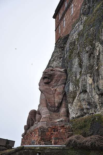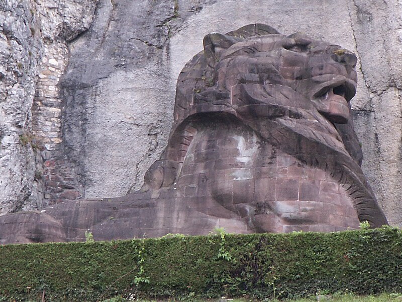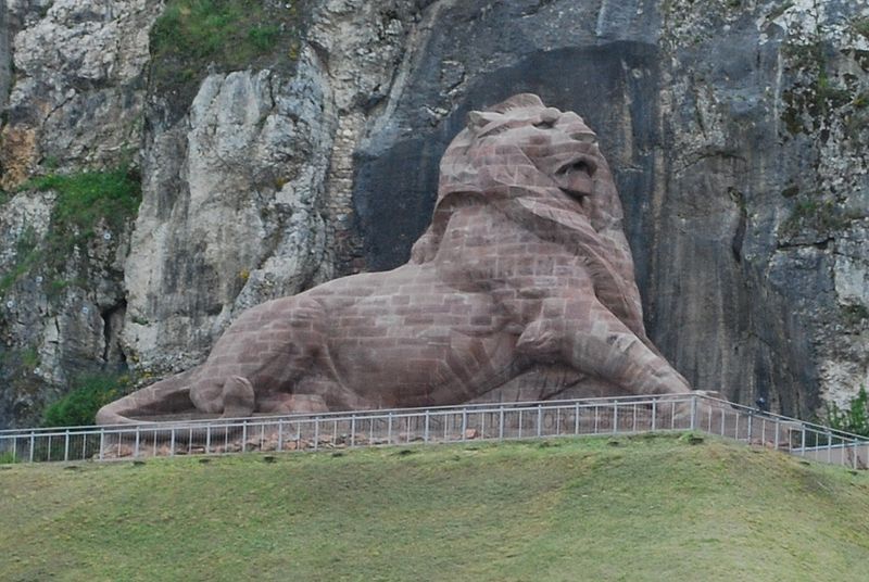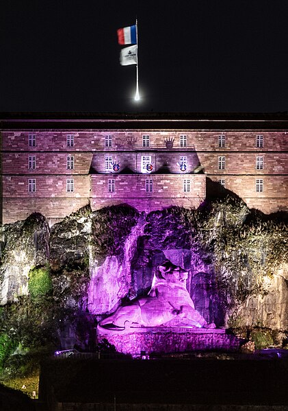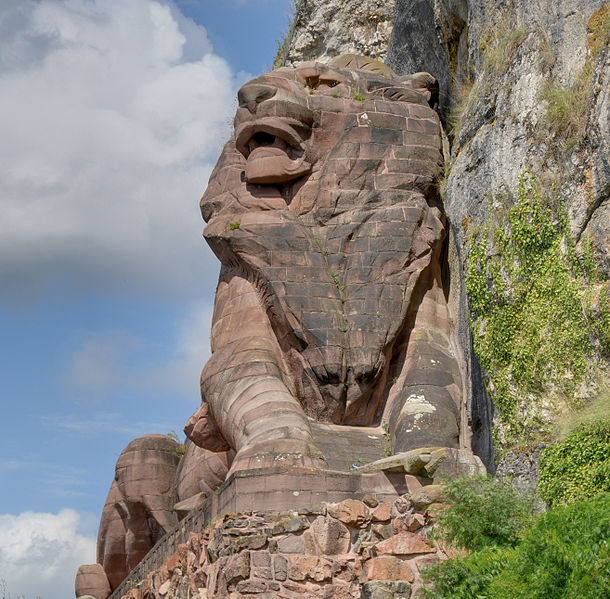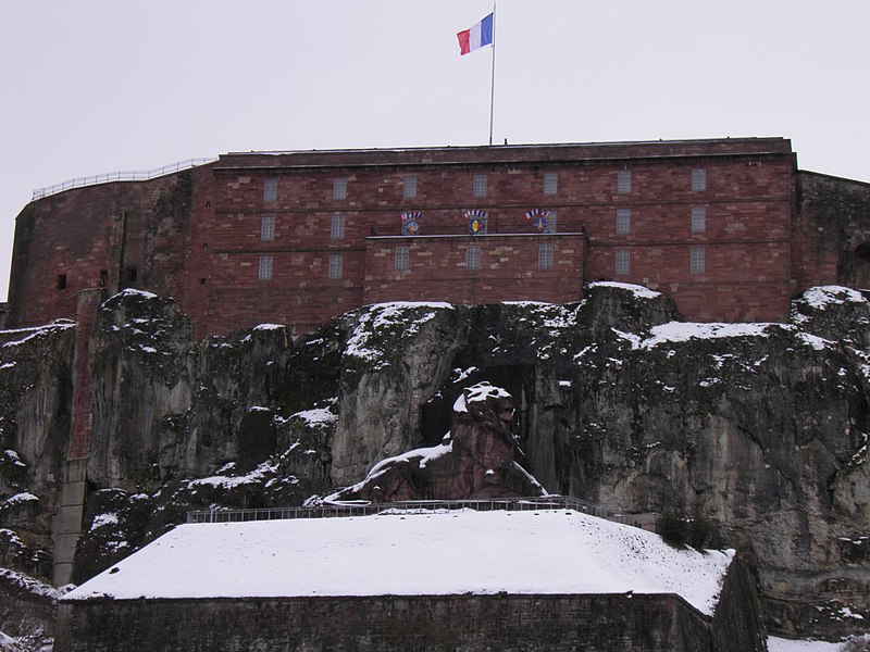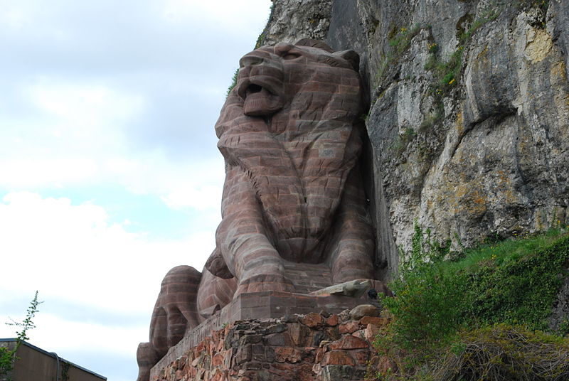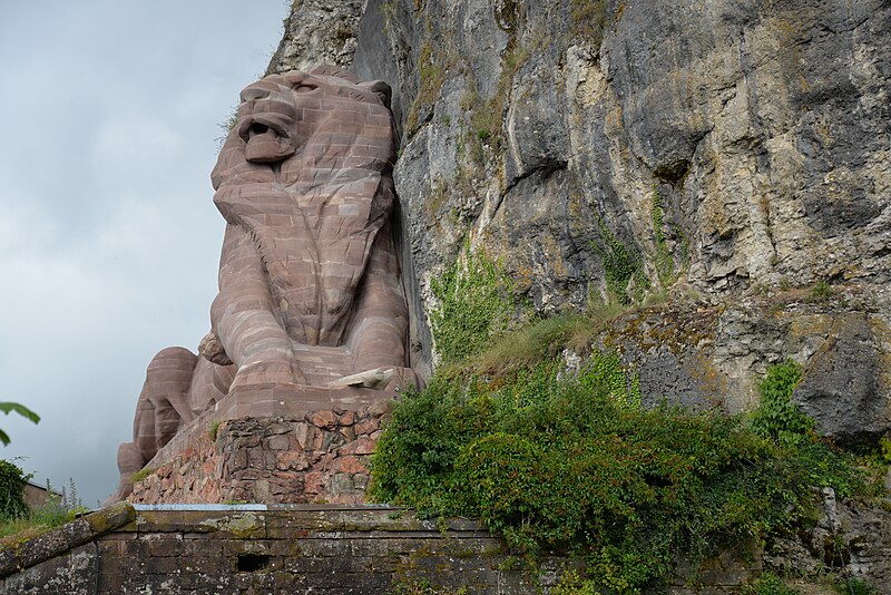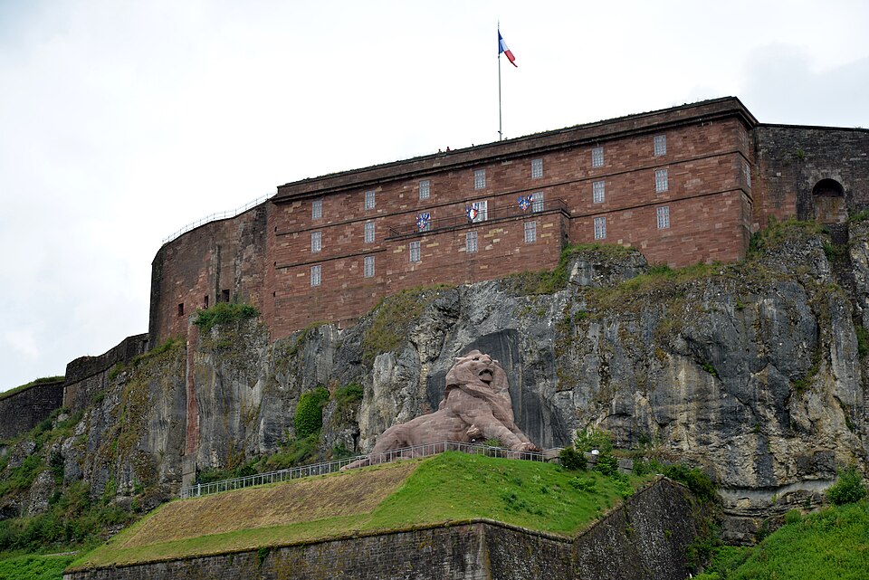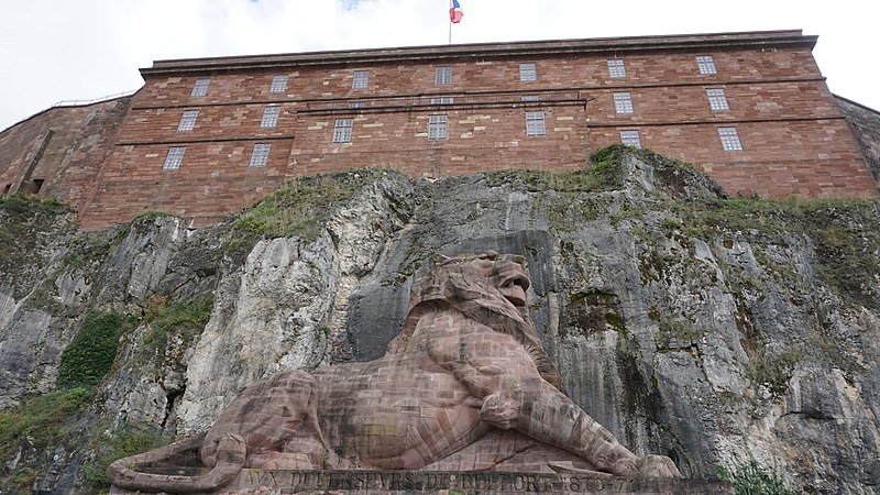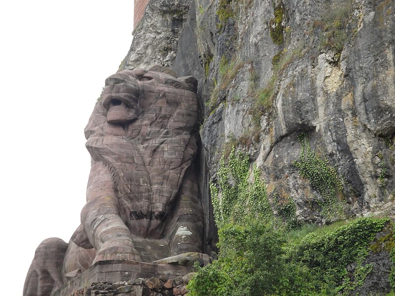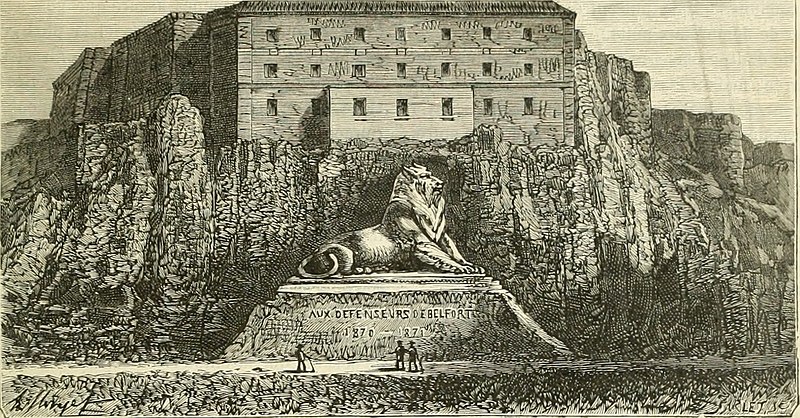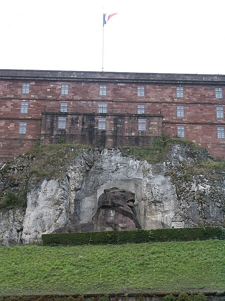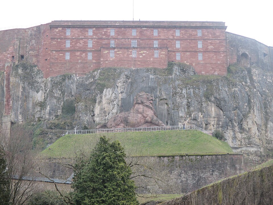 Le Lion de Belfort est une sculpture en haut-relief d'Auguste Bartholdi, installée au pied de la falaise de la citadelle de Belfort. Elle commémore la résistance de la ville assiégée par les Prussiens pendant la guerre franco-allemande de 1870. L'œuvre représente un lion couché, la patte posée sur une flèche qu'il vient d'arrêter, symbolisant l'énergie de la défense plutôt qu'une victoire. Réalisée en blocs de grès rose de Pérouse sculptés individuellement puis assemblés contre la paroi calcaire de la falaise, la statue repose sur un piédestal en rocaillage. Longue de 19,06 m et haute de 10,56 m, elle est la plus grande statue de pierre de France. À la suite de protestations allemandes, Bartholdi a tourné la tête du lion vers l'ouest, tandis que la flèche entre ses pattes reste dirigée vers la frontière allemande. Le monument évoque la résistance menée par le colonel Denfert-Rochereau durant le siège de Belfort. Le projet a été lancé par le conseil municipal le 5 décembre 1871 et Bartholdi, sollicité en 1872, a travaillé pendant cinq ans à des études préparatoires, notamment au jardin des plantes de Paris. Influencé par son maître Jean-Léon Gérôme et par des œuvres comme le Lion de Lucerne, il a inscrit son lion dans le paysage urbain. Les travaux de terrassement ont commencé en 1875 et la dernière pierre a été posée en septembre 1879. En raison d'un différend sur l'utilisation d'un reliquat de la souscription, il n'y eut pas d'inauguration officielle à l'achèvement; Bartholdi organisa néanmoins en 1880 une illumination par des feux de Bengale. La dédicace « Aux défenseurs de Belfort 1870 – 1871 » fut gravée sur le socle grâce aux fonds recueillis par la section de Belfort du Club Alpin Français, alimentés par un droit d'accès mis en place en 1890. L'image du lion a rapidement inspiré poètes, chansonniers et artistes, a servi de modèle et a été largement reproduite sur cartes postales, objets publicitaires et œuvres d'art. Face à la prolifération des reproductions, Bartholdi intente des procès à partir de 1898 et obtient gain de cause. Très vite devenu emblème de la ville, le Lion a été classé monument historique le 20 avril 1931. Des répliques existent à Paris, place Denfert-Rochereau, et à Montréal, au square Dorchester. Le monument a fait l'objet d'inaugurations publiques plus tardives : pour son centenaire en 1981, puis le 18 septembre 2011 lors des journées du patrimoine, cérémonie présidée par le maire Étienne Butzbach et rassemblant 45 000 visiteurs. En 2011 Belfort célébrait aussi les anniversaires liés à la construction du Lion et à la fin du siège. La sculpture a été nettoyée entre avril et mai 2019 pour lui rendre sa couleur d'origine. Une légende affirme que Bartholdi se serait suicidé pour avoir oublié la langue du lion ; lors de la restauration de 2019 il a été constaté que la statue possède bien une langue, et Bartholdi est mort de la tuberculose.