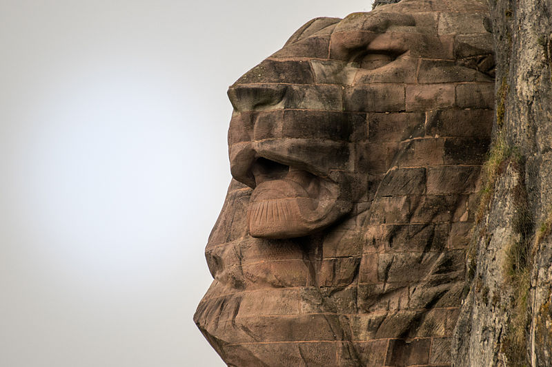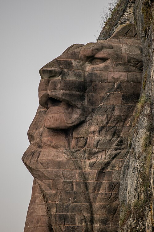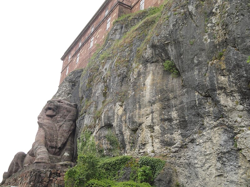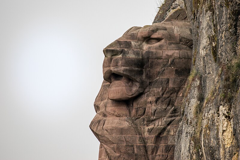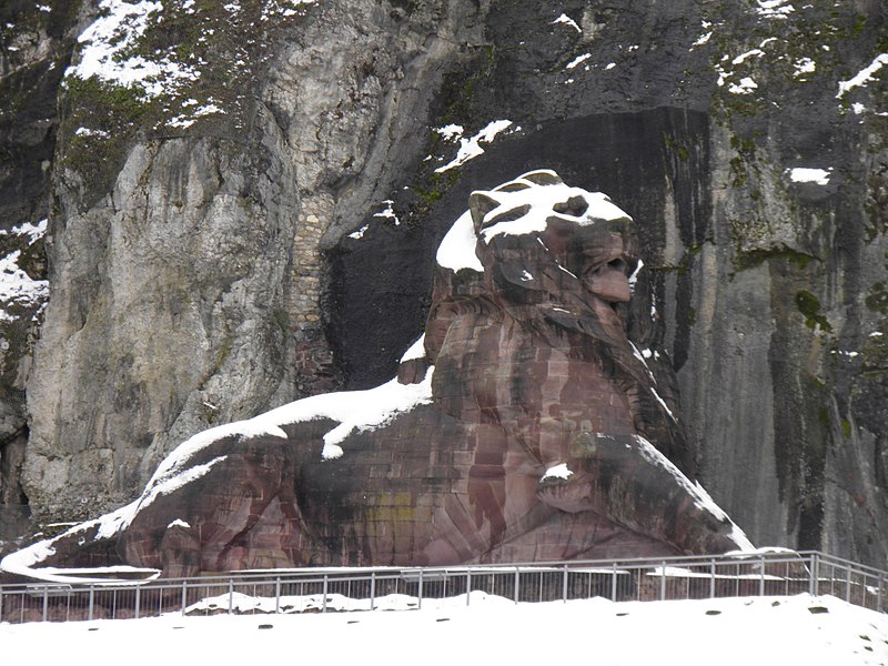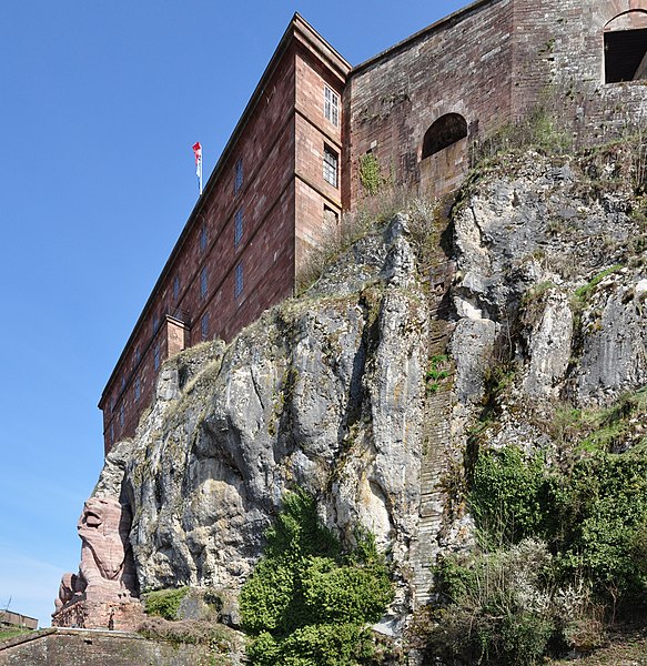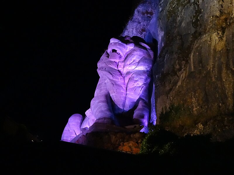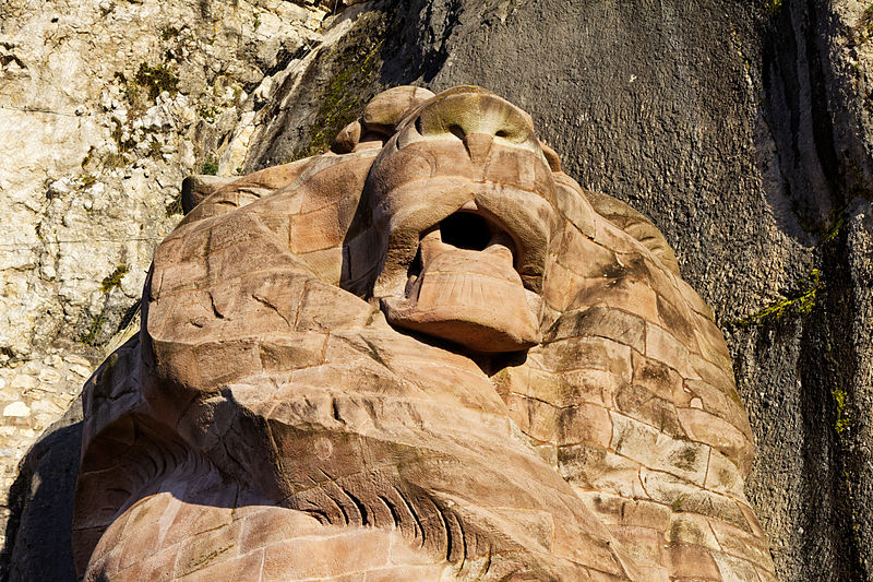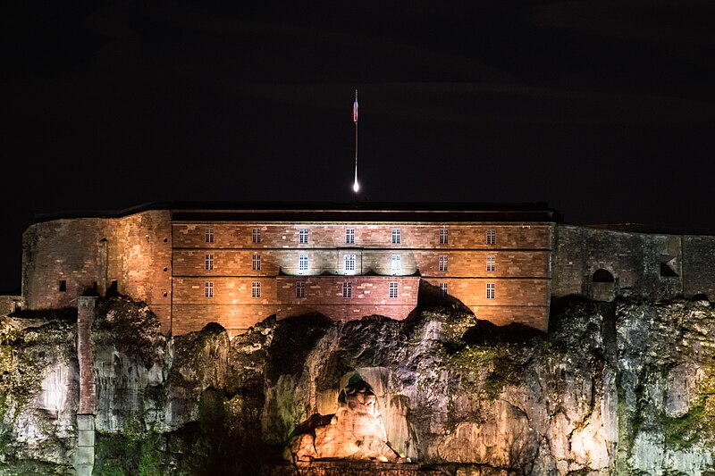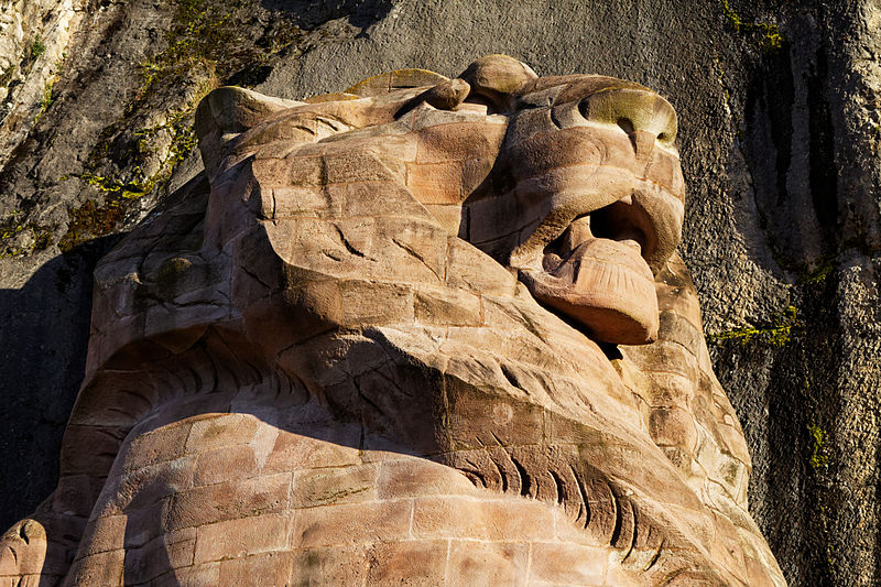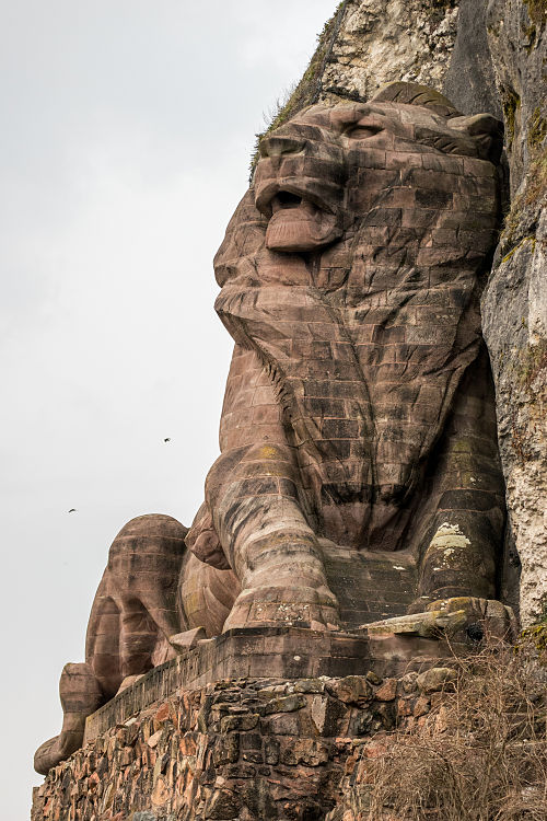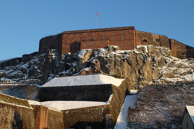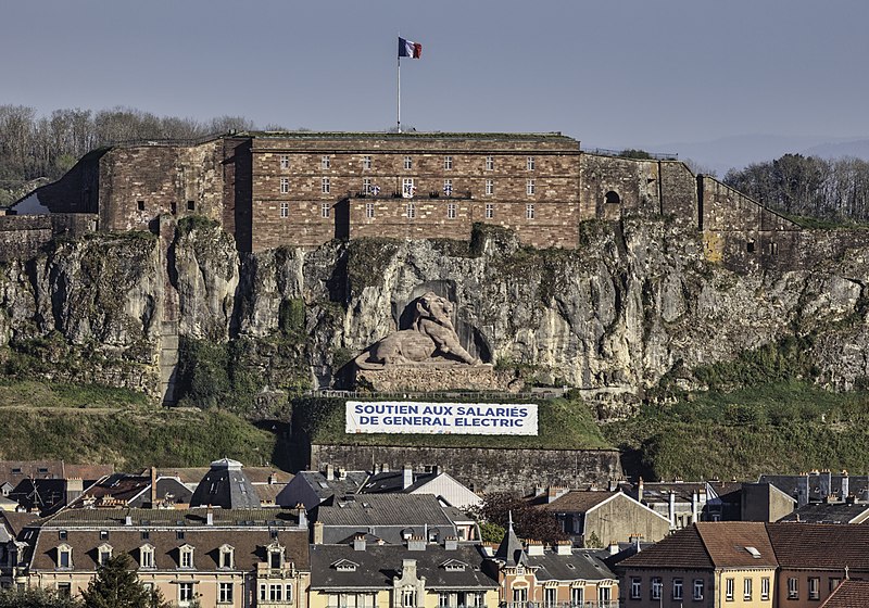 Le Lion de Belfort est une sculpture en haut-relief d'Auguste Bartholdi, installée au pied de la falaise de la citadelle de Belfort. Elle commémore la résistance de la ville assiégée par les Prussiens pendant la guerre franco-allemande de 1870. L'œuvre représente un lion couché, la patte posée sur une flèche qu'il vient d'arrêter, symbolisant l'énergie de la défense plutôt qu'une victoire. Réalisée en blocs de grès rose de Pérouse sculptés individuellement puis assemblés contre la paroi calcaire de la falaise, la statue repose sur un piédestal en rocaillage. Longue de 19,06 m et haute de 10,56 m, elle est la plus grande statue de pierre de France. À la suite de protestations allemandes, Bartholdi a tourné la tête du lion vers l'ouest, tandis que la flèche entre ses pattes reste dirigée vers la frontière allemande. Le monument évoque la résistance menée par le colonel Denfert-Rochereau durant le siège de Belfort. Le projet a été lancé par le conseil municipal le 5 décembre 1871 et Bartholdi, sollicité en 1872, a travaillé pendant cinq ans à des études préparatoires, notamment au jardin des plantes de Paris. Influencé par son maître Jean-Léon Gérôme et par des œuvres comme le Lion de Lucerne, il a inscrit son lion dans le paysage urbain. Les travaux de terrassement ont commencé en 1875 et la dernière pierre a été posée en septembre 1879. En raison d'un différend sur l'utilisation d'un reliquat de la souscription, il n'y eut pas d'inauguration officielle à l'achèvement; Bartholdi organisa néanmoins en 1880 une illumination par des feux de Bengale. La dédicace « Aux défenseurs de Belfort 1870 – 1871 » fut gravée sur le socle grâce aux fonds recueillis par la section de Belfort du Club Alpin Français, alimentés par un droit d'accès mis en place en 1890. L'image du lion a rapidement inspiré poètes, chansonniers et artistes, a servi de modèle et a été largement reproduite sur cartes postales, objets publicitaires et œuvres d'art. Face à la prolifération des reproductions, Bartholdi intente des procès à partir de 1898 et obtient gain de cause. Très vite devenu emblème de la ville, le Lion a été classé monument historique le 20 avril 1931. Des répliques existent à Paris, place Denfert-Rochereau, et à Montréal, au square Dorchester. Le monument a fait l'objet d'inaugurations publiques plus tardives : pour son centenaire en 1981, puis le 18 septembre 2011 lors des journées du patrimoine, cérémonie présidée par le maire Étienne Butzbach et rassemblant 45 000 visiteurs. En 2011 Belfort célébrait aussi les anniversaires liés à la construction du Lion et à la fin du siège. La sculpture a été nettoyée entre avril et mai 2019 pour lui rendre sa couleur d'origine. Une légende affirme que Bartholdi se serait suicidé pour avoir oublié la langue du lion ; lors de la restauration de 2019 il a été constaté que la statue possède bien une langue, et Bartholdi est mort de la tuberculose.