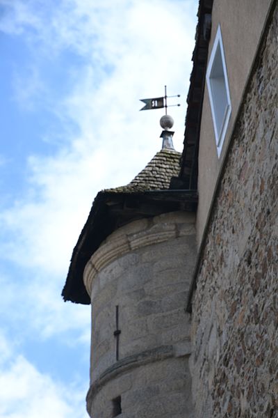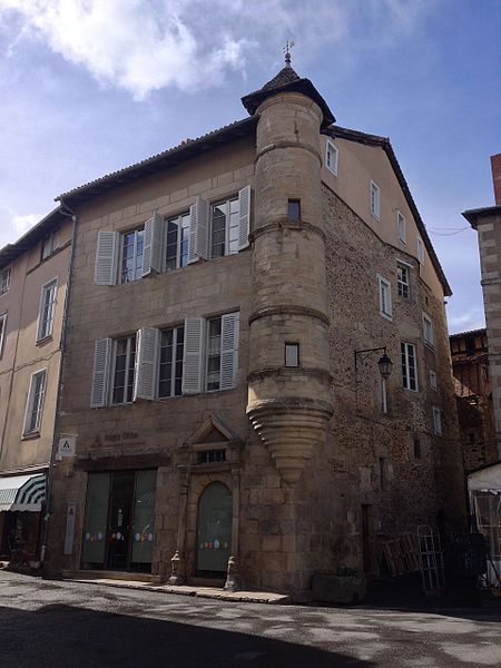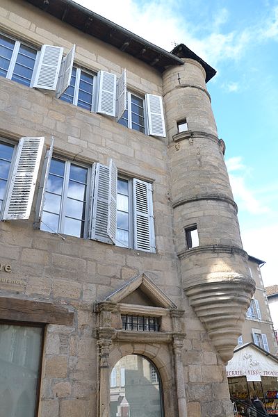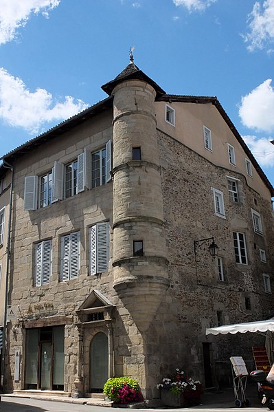 La façade s'étend sur deux côtés et, à l'angle, est dotée d'une tour circulaire. À l'origine, la façade ouverte sur la place était bordée par une ruelle très étroite ; la place actuelle résulte des transformations du XIXe siècle. La façade sur rue présente une porte flanquée de deux colonnes sur piédestaux, qui soutiennent un entablement surmonté d'un fronton ; cet ensemble encadre une baie en plein cintre. La tour d'angle est portée par un culot dont l'extrémité se trouve à 2,50 m du sol. La maison a été construite autour des années 1600. Sur le pignon nord, des baies ont été aménagées au XIXe siècle. Une ouverture de boutique a été réalisée sur la façade antérieure au troisième quart du XXe siècle, peut‑être en remplacement d'une précédente. La couverture et l'enduit du niveau du comble ont été refaits à la fin du quatrième quart du XXe siècle.