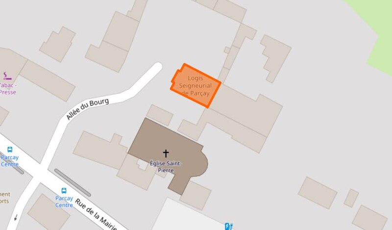 L'édifice occupe une place centrale du bourg, encadré par l'allée du Bourg et l'allée de La Commanderie au nord-ouest, la rue de la Thibaudière au nord-est, la rue Saint-Joseph au sud-ouest et l'allée de l'Orangerie au sud, et il fait face à la place de l'Église et à l'église Saint-Pierre, édifice du XIe siècle. Un large périmètre de protection patrimoniale entoure le logis, son extension variant selon les secteurs autour de 500 mètres.
