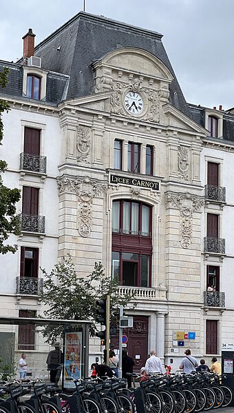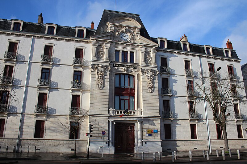 Lycée Carnot, situé à Dijon, est un établissement public local d'enseignement inauguré le 31 juillet 1893. Il est le plus ancien lycée de Dijon, créé en 1802 comme Lycée impérial, et le principal établissement de classes préparatoires aux grandes écoles de l'académie de Dijon. À la fin du XIXe siècle, la municipalité de Dijon décida de bâtir un lycée de garçons et confia le projet à l'architecte départemental Arthur Chaudouet, lauréat du concours de 1887. Le projet initial fut adapté pour répondre aux normes nouvelles d'hygiène et de confort, visant notamment à laisser pénétrer davantage de lumière à l'intérieur. Le bâtiment principal, implanté boulevard Thiers, se distingue par une silhouette simple, tandis que la travée du portail, plus ostentatoire, relève du classicisme éclectique de la seconde moitié du XIXe siècle. La structure est flanquée de deux bâtiments modernes accueillant les quartiers des Petits et des Grands ; construits en pierre et en brique, ils sont ornés de bas-reliefs en terre cuite. Les sculptures entourant l'horloge et d'autres éléments décoratifs sont l'œuvre du sculpteur dijonnais Jules Schanosky. L'ensemble architectural fut inauguré solennellement le 31 juillet 1893.