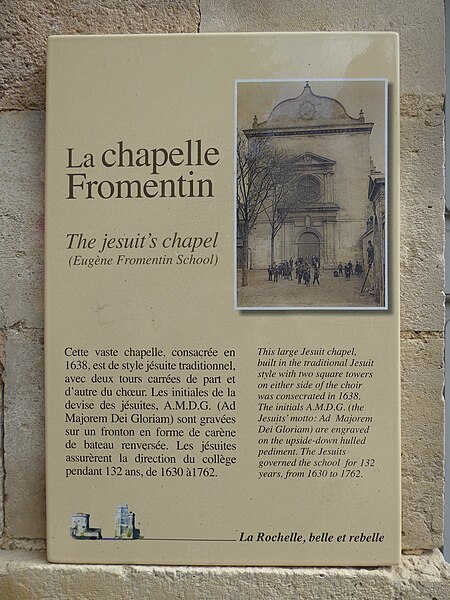 Le collège Eugène‑Fromentin, situé 2 rue Jaillot à La Rochelle, est issu des Grandes‑Écoles fondées en 1504. À l'origine installées dans deux maisons contiguës rue Bazoges, ces écoles durent déménager en 1565 dans le couvent des Cordeliers, où une porte de style Renaissance dite "Porte Jeanne d'Albret" fut édifiée l'année suivante. Après le siège de la ville, l'établissement fut confié aux jésuites qui, en 1629, achetèrent une partie de l'actuel jardin des Plantes et le relièrent au collège par un passage souterrain voûté. La chapelle du collège fut édifiée sous la direction du frère Louis Mercier : elle fut couverte en 1636 et consacrée le 8 août 1638. À l'expulsion des jésuites, le collège passa au clergé séculier puis fut fermé en 1792; il rouvrit en 1803. Les bâtiments furent reconstruits sur des plans d'Antoine Brossard en 1838 et l'ensemble principal fut achevé en 1843. La chapelle, unique vestige du collège jésuite, fit l'objet d'une restauration de 1843 à 1858. La porte Renaissance fut remplacée en 1869 et déposée dans le jardin de la bibliothèque municipale. Après 1945, le corps de bâtiment sur la rue Jaillot et le corps central furent surélevés. En 1974 le lycée redevint collège et prit le nom du peintre Eugène Fromentin. Le bâtiment historiquement principal est inscrit au titre des monuments historiques par arrêté du 21 novembre 1969.