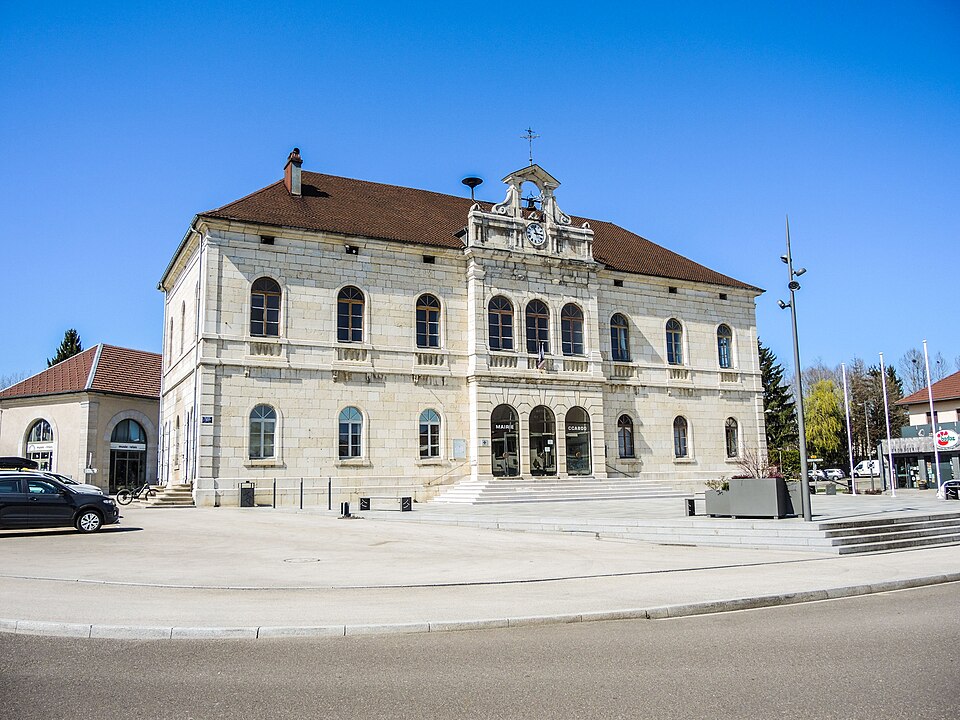 Entre 1858 et 1860, l'architecte Alexandre Clerget réalise l'hôtel de ville de style classique, qui comprend une halle et une justice de paix. L'avant-corps central est couronné d'un attique intégrant l'horloge et amorti par un clocher-mur. Deux arcades parallèles relient le vestibule au grand escalier, installé dans une cage en demi hors-œuvre, qui conduit au vestibule de l'étage situé entre deux grandes salles conservant des lambris de mi-hauteur. L'ancienne halle, en rez-de-chaussée et composée de trois corps, présente une série régulière de baies en plein cintre.