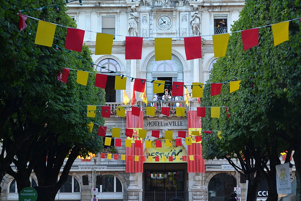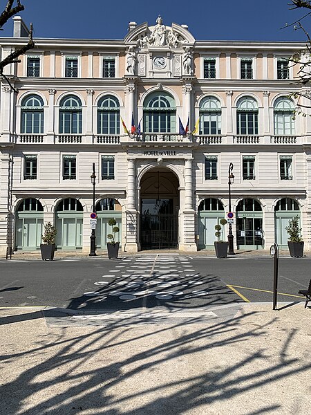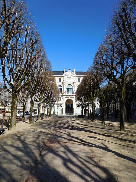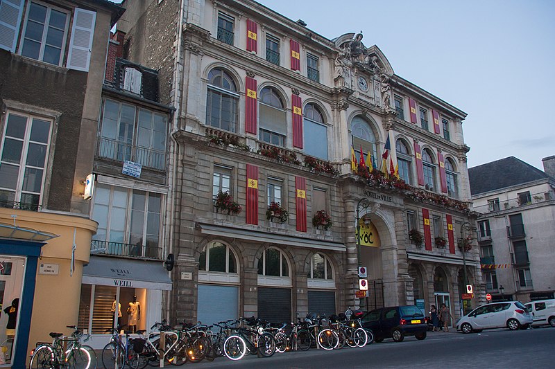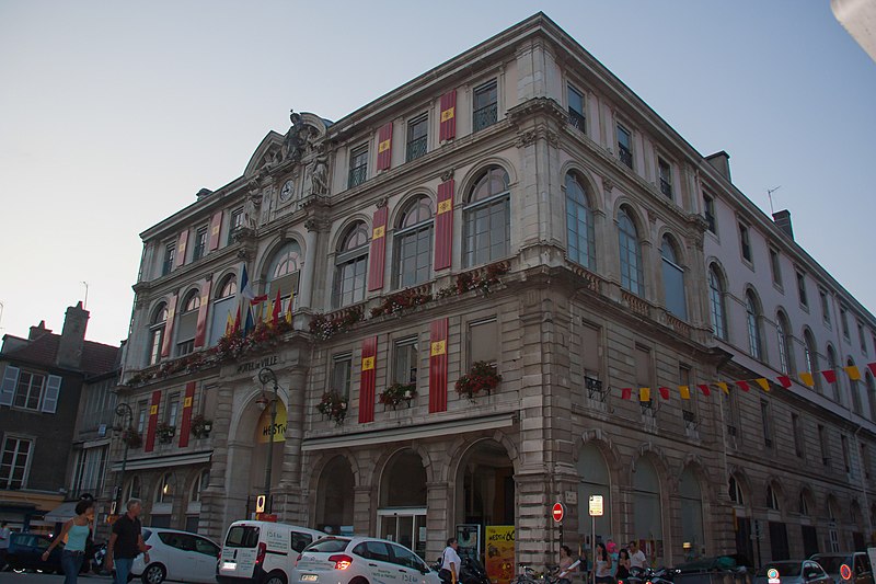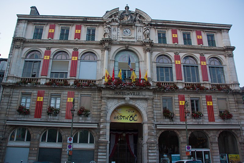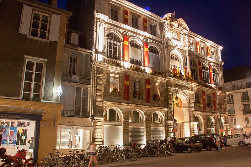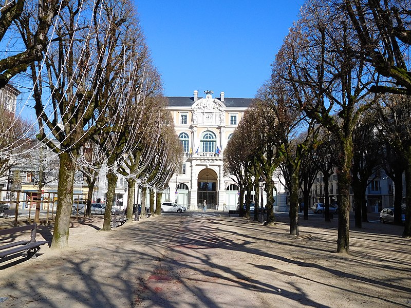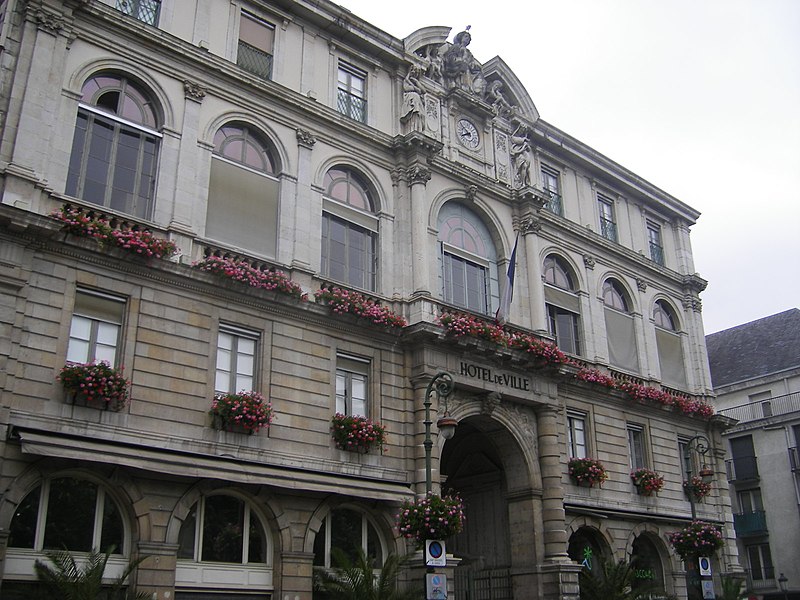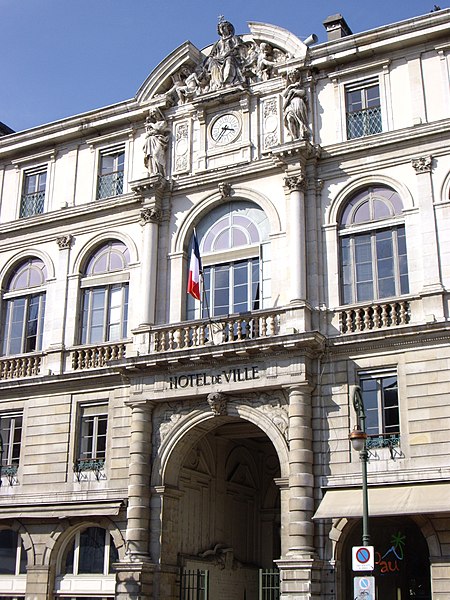 La mairie-théâtre de Pau occupe un bâtiment de la place Royale, dans les Pyrénées-Atlantiques, en région Nouvelle-Aquitaine. Le site était destiné à une nouvelle église Saint-Louis, projet né de la nécessité d’un lieu de culte plus vaste que la vieille église Saint-Martin, mais les vestiges de l’édifice inachevé ont finalement servi d’assise au théâtre. En 1839, le maire Joseph-Raymond Nogué commanda à l’architecte Pierre-Bernard Lefranc l’étude d’un projet combinant théâtre, salle de concerts et cercles ; faute de paiement, ce projet initial fut abandonné. Il fut repris en 1854 par Gustave Lévy, chargé de mettre en œuvre les plans de Lefranc, et un consortium local constitua une société d’actionnaires pour lever une partie des fonds nécessaires ; l’horloge de la façade porte la signature Borrel, à Paris. Construit entre 1854 et 1862, l’édifice accueillit le théâtre en 1862, lequel remplaça la salle alors située au n°4 de la place Gramont dont il ne subsiste que des façades et quelques décors. La salle, à l’origine de 300 places, était décorée dans le style Second Empire et ornée de décors sculptés par la manufacture Virebent de Toulouse. Dès l’ouverture, la programmation fit l’objet de critiques jugée vieillotte par une partie du public. Mal entretenu, le théâtre ferma en 1968 puis fut intégralement rénové à partir de 1982 sur décision du maire André Labarrère afin d’accueillir notamment le festival de théâtre dirigé alors par Roger Hanin ; Jeannette Lacay-Burato réalisa de nouveaux décors sur le thème de Roméo et Juliette et la coupole fut peinte d’une fresque inspirée de celle de l’Opéra Garnier réalisée par Marc Chagall. La capacité passa ensuite à 430 places et la salle rouvrit en 1984, accueillant spectacles et représentations jusqu’à une nouvelle fermeture le 25 octobre 2013 à la suite de la chute d’un élément de décor. Après des travaux menés du 4 janvier au 20 mai 2016, la salle rouvrit en juin 2016 pour des spectacles de danse, des concerts, des pièces de théâtre et des conférences ; Juliette Deschamps en assura la direction de 2016 à 2019, puis Éric Vigner en prend la direction à partir de 2020. Parallèlement, la municipalité, à la recherche de locaux plus spacieux que ceux occupés au premier étage des halles place Clémenceau, décida le 28 avril 1876 d’acquérir le théâtre et ses dépendances ; après aménagements, la mairie investit les lieux à l’automne 1878 et y siège toujours. L’édifice est inscrit au titre des monuments historiques par arrêté du 23 janvier 2017. Parmi les vues couramment présentées figurent l’hôtel de ville, la statue d’Henri IV et la façade du bâtiment. On note enfin des faits d’actualité locale : en 2000, Alain Robert effectua une escalade en solo intégral sur 15 mètres de la façade, et le maire en fonction depuis le 4 avril 2014 est François Bayrou.