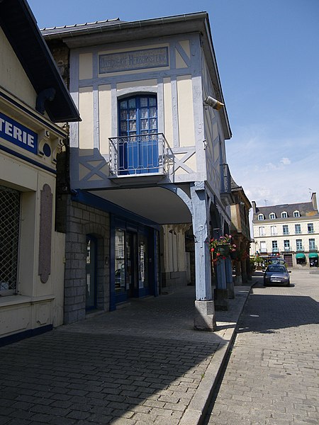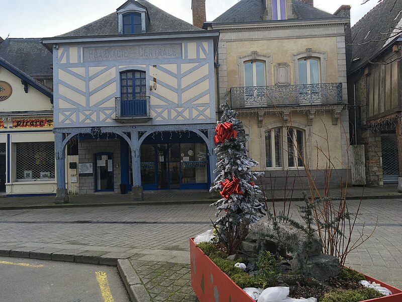 La maison anciennement cadastrée C 244 est une construction en pans de bois dotée d’un porche de deux travées formé par des poteaux portant des linteaux soutenus par des aisseliers ; le premier étage est également en pans de bois. La maison anciennement cadastrée C 246 se présente aussi comme une maison à porche : son rez-de‑chaussée comprend deux travées constituées de poteaux supportant des linteaux couronnés par une sablière moulurée, et le premier étage est en colombage à damiers. Cette maison à porche pourrait remonter au XVIe siècle, mais, les éléments architecturaux d’origine étant très peu nombreux, son interprétation reste difficile. Sa fonction de pharmacie est relativement ancienne : la tradition orale rapporte l’existence d’une pharmacie/apothicairerie dès les années 1920, et une carte postale datée de 1907 montre déjà l’inscription « pharmacie » sur le bâtiment. Des inscriptions en mosaïque témoignent de cette utilisation ; ces mosaïques semblent contemporaines de celles de la maison du numéro 16, réalisées en 1926.