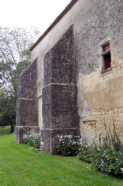La maison à contreforts de Pondaurat se situe au cœur du bourg, face à l'église Saint-Antoine, sur le côté ouest de la route départementale D12 qui mène vers Savignac. Datée du XIVe siècle, elle a d'abord servi d'hôpital pour le monastère des Antonins installé de l'autre côté de la route. L'ordre de Saint-Antoine, fondé en Dauphiné en 1095 pour soigner les maladies de peau, voyait son établissement de Pondaurat attesté comme important par deux lettres d'Henri III d'Angleterre datées de 1254, le plaçant sur l'une des routes de Compostelle. Le monastère et le bourg furent pris et incendiés par les Huguenots en 1577, puis le couvent fut entièrement remanié à la fin du XVIIe ou au début du XVIIIe siècle. À la suppression des Antonins en 1776, le monastère passa à l'ordre de Malte avant d'être vendu comme bien national en 1790 ; la commune racheta plus tard une partie des bâtiments, transformant le logis en presbytère et la chapelle en église du village. La maison, située à quelques mètres au nord-ouest de l'église, conserve des contreforts, des vestiges d'échauguettes à l'angle sud‑ouest et plusieurs baies dotées d'appuis et de traverses. Sa façade et sa toiture sont protégées au titre des monuments historiques par arrêté du 12 juillet 1990. Le site est documenté dans la base Mérimée et illustré sur Wikimedia Commons, et le village ancien de Pondaurat est présenté sur le site du tourisme de la région Aquitaine.