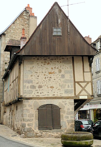La façade sur la Grande Rue montre, au‑dessus d'un rez‑de‑chaussée en pierre, un étage en fort encorbellement reposant sur une rangée de têtes de poutres, dont quatre sont soutenues par des pièces obliques prenant appui sur le mur du rez‑de‑chaussée. L'ossature de cet étage est constituée de pans de bois assemblés en croix de Saint‑André entre jambages et sablières ; vers l'angle de la place, une petite niche creusée dans la partie supérieure renferme une statuette. La façade sur la place comporte au rez‑de‑chaussée une baie en anse de panier et est surmontée d'un pignon en bois porté en encorbellement sur une console moulurée.