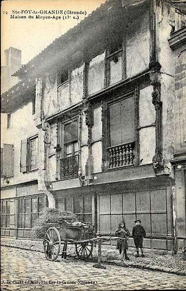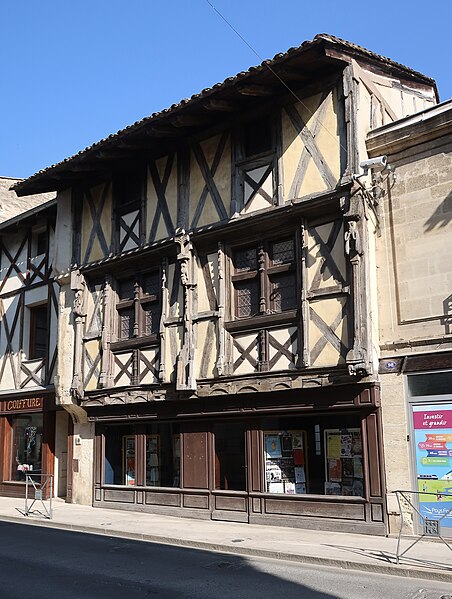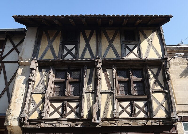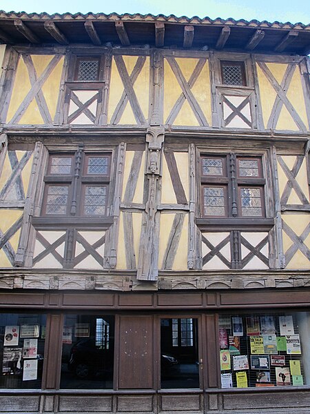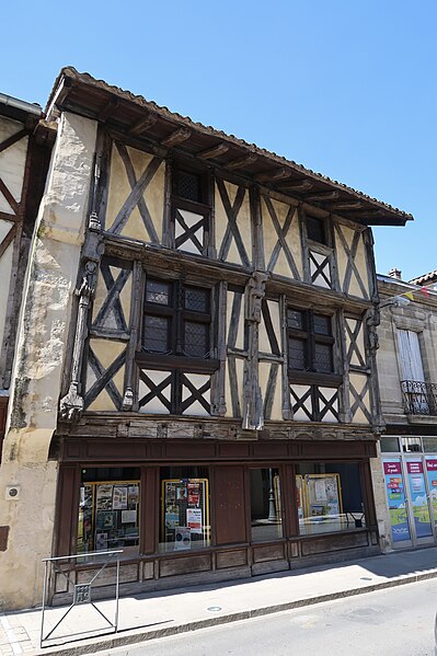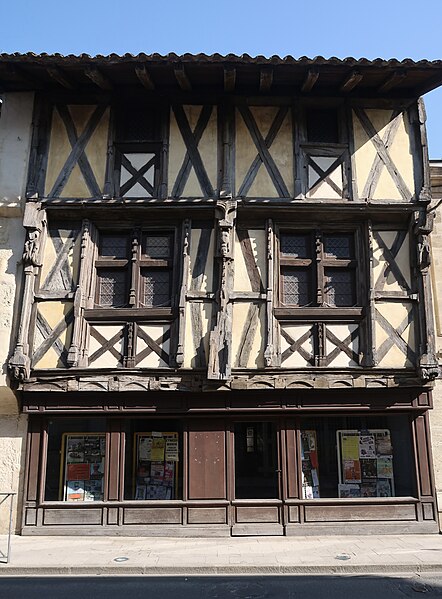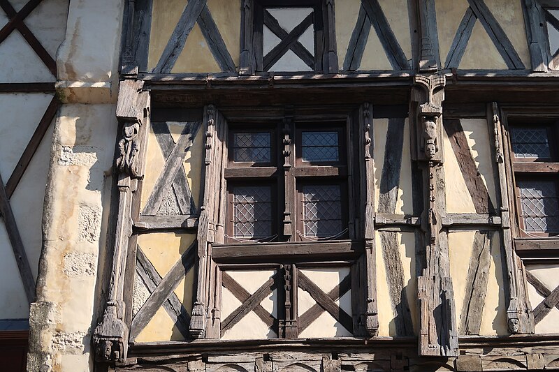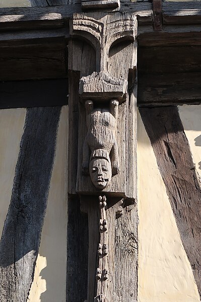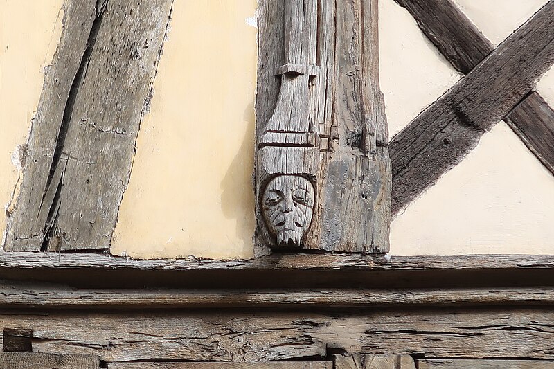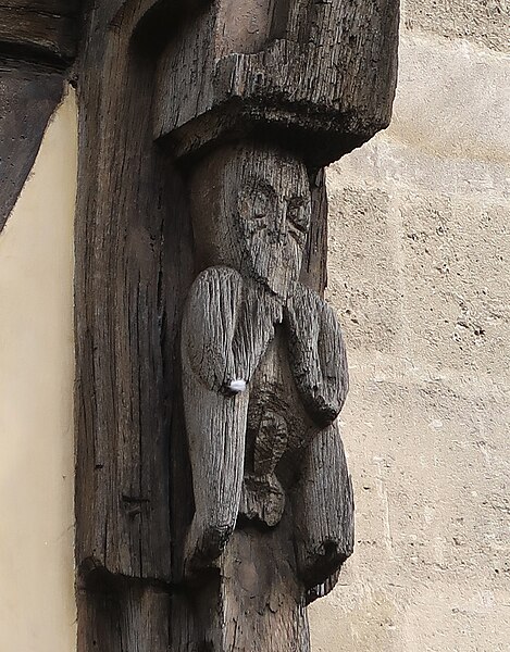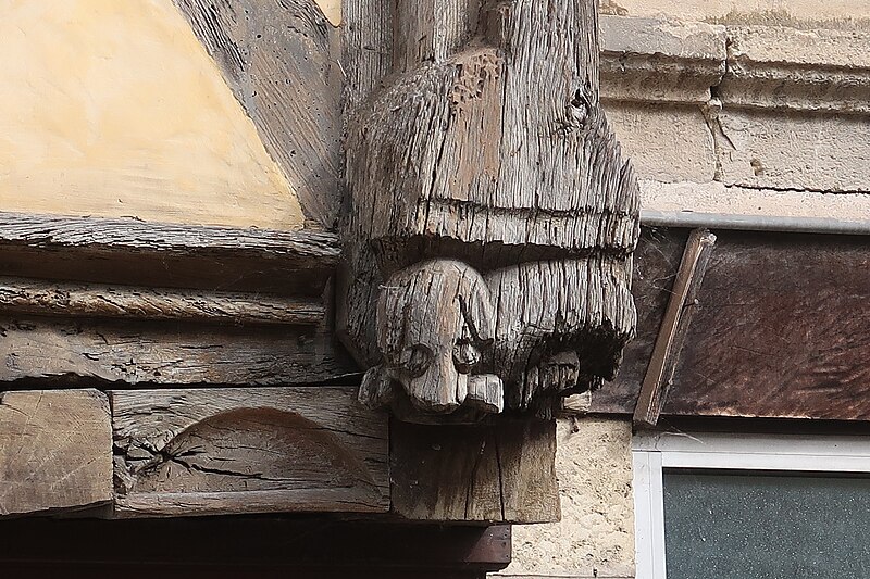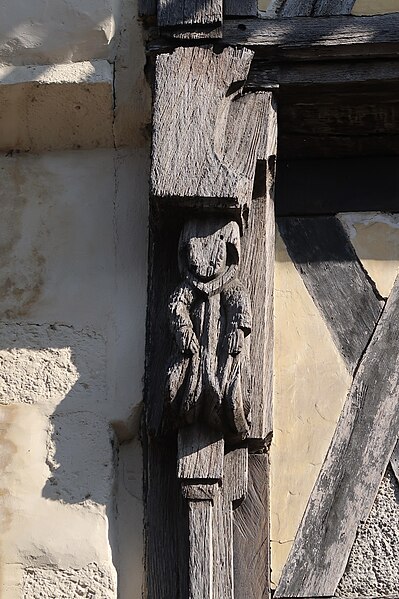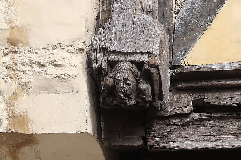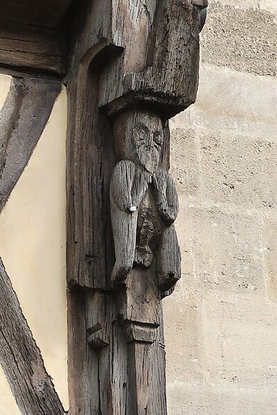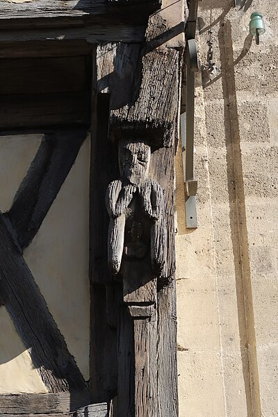 Maison à pans de bois du XVe siècle, élevée sur un rez-de-chaussée et comportant deux étages en encorbellement, chaque niveau reposant sur un bandeau de bois sculpté. Les montants des fenêtres, autrefois à meneaux, sont également sculptés. De grosses poutres, à l'angle de la maison et entre les fenêtres, sont ornées de personnages : à droite, un homme nu volontairement mutilé avec un chien à la base ; au centre, un animal à tête humaine dont la base de la poutre forme une niche ; à gauche, une femme agenouillée en robe à plis. Un ange est représenté sur le cul-de-lampe.