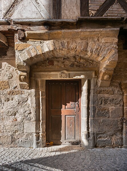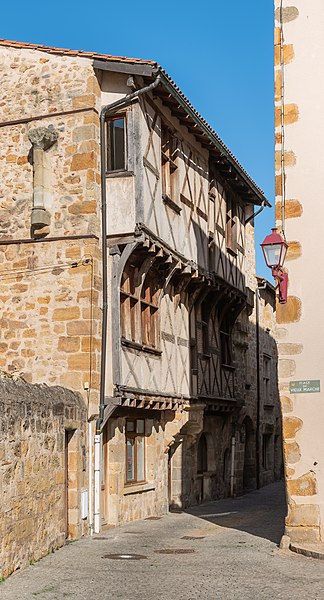 Maison à pans de bois faisant partie de l'ancien noyau de la ville, qui fut capitale du comté d'Auvergne du milieu du XIIe siècle jusqu'à la Révolution. Le rez-de-chaussée est en pierre et les étages supérieurs sont avancés, à encorbellement. Le premier étage est soutenu par des têtes de poutres et, à chaque extrémité, par des pigeatres. Le second étage, également en encorbellement, est porté par des pigeatres et des têtes de poutres alternant et présente une grande fenêtre à meneaux de bois. Sur le côté nord, un passage voûté accolé à l'immeuble, en arc légèrement brisé, supporte deux étages dotés chacun d'une fenêtre à encadrement de pierre.