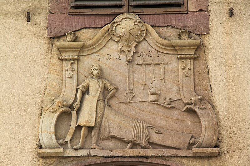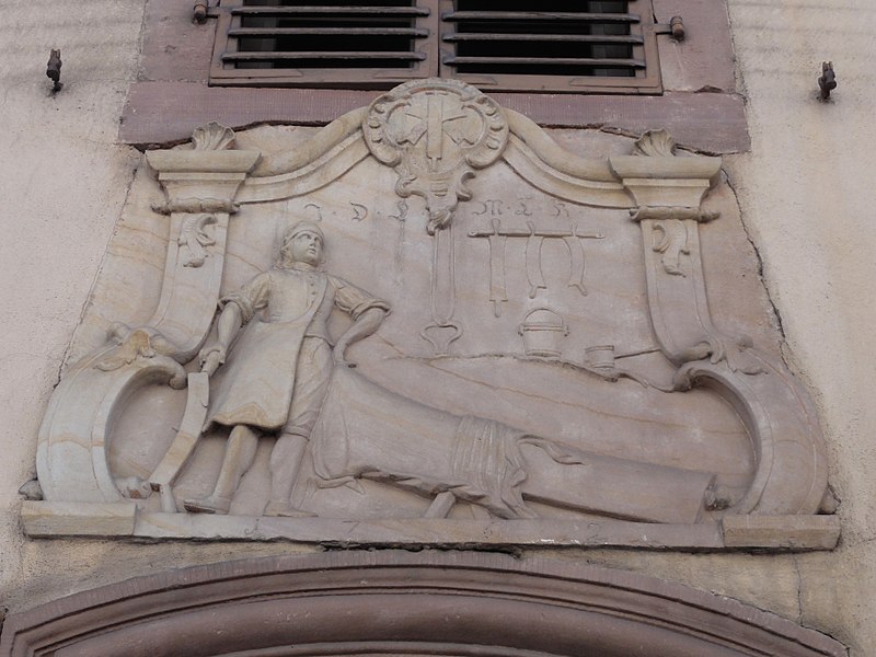 Date gravée sur le bas-relief représentant un tanneur et ses instruments.
