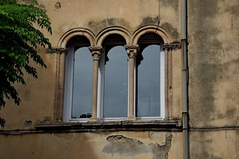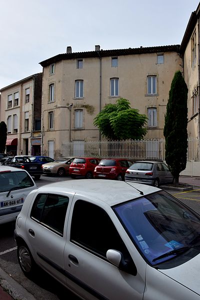 Le monastère des Bernardines de Notre-Dame des Olieux, fondé en 1204, se transporta à Narbonne en 1574 en raison des guerres de Religion. Leur église s’établit d’abord sur l’île Sainte-Radegonde, près de la Major, mais elle n’apparaît plus dans le compoix de 1696. D’après une annotation du compoix de 1641, les Bernardines auraient acheté, le 8 avril 1644, la maison de Jean de Brunes, qui est le plus ancien propriétaire connu de l’édifice. Converti en caserne à la Révolution, le couvent fut partiellement démoli en 1839. Le tracé, au milieu du XIXe siècle, de l’avenue du Capitole et la construction de nouvelles maisons en bordure ont laissé subsister deux murs anciens munis de leurs fenêtres. Ces deux murs, perpendiculaires, présentent des ouvertures d’époques différentes. L’un donne sur une cour triangulaire en façade sur l’avenue ; au premier étage il s’ouvre sur une fenêtre triple en plein cintre et, au deuxième étage, sur une fenêtre à meneaux dont l’axe est décalé. Cette fenêtre à meneaux paraît dater de la seconde moitié du XVIe siècle. La fenêtre du premier étage se compose de trois petites baies en plein cintre séparées par deux colonnettes en marbre ; leurs chapiteaux portent, aux angles, des têtes humaines et les tailloirs sont ornés de feuillages qui se prolongent en une frise au-delà de l’encadrement. Le pan de mur sur la cour arrière comporte une fenêtre géminée dont le chapiteau montre, sur chaque face, une chèvre ou un bouc dans un décor de feuillages ; la frise se poursuit sur plusieurs mètres. Malgré le style incontestablement roman de ces ouvertures, certains détails laissent suggérer une datation plutôt tardive, probablement la première moitié du XIIIe siècle.