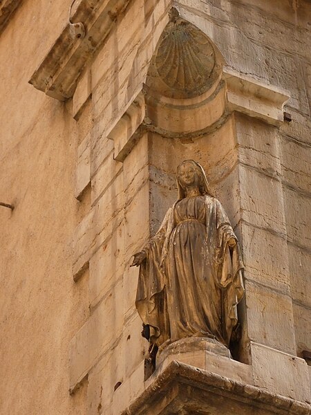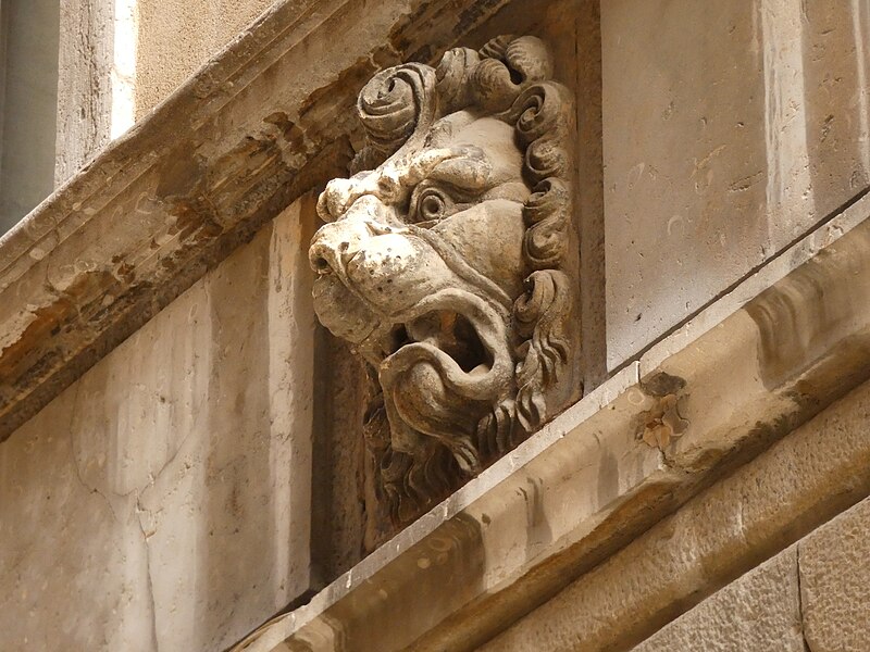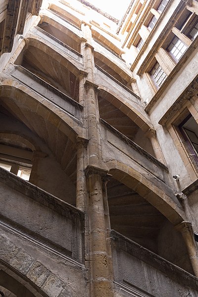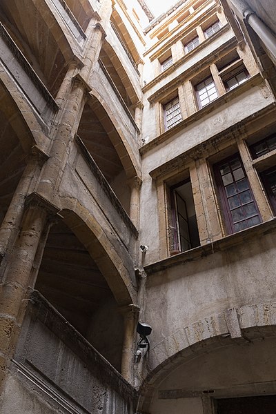 La Maison aux Lions, dite aussi maison Dugas ou « Maison des têtes de lions », se trouve au 23 rue Juiverie dans le 5e arrondissement de Lyon. Sa construction débute en 1617 sous l’initiative du marchand Jérôme Lentillon et s’achève probablement vers 1647, période à laquelle l’édifice prend son aspect actuel. Élevée sur la réunion de plusieurs parcelles médiévales, elle présente une façade exceptionnellement large pour ce quartier ancien. Après sa construction, la demeure passe entre les mains de familles influentes, dont les Médicis, puis est acquise par la famille Dugas en 1750, qui lui donne son nom courant. De nombreuses légendes entourent la maison, notamment la découverte supposée d’un trésor juif et une énigme attribuée à l’alchimiste Nicolas Flamel. L’édifice est inscrit partiellement au titre des monuments historiques pour ses façades et ses toitures par arrêté du 17 avril 1952. La façade en pierre grise, répartie sur cinq niveaux, se distingue par ses bossages de style florentin et par une douzaine à une quinzaine de têtes de lions sculptées en relief, qui lui ont valu son surnom. Une niche d’angle abrite une statue de la Vierge, tandis que le rez-de-chaussée est rythmé par des arcades et des meneaux plats caractéristiques du XVIIe siècle. La cour intérieure, accessible depuis la rue, comporte un puits et un escalier à volées droites reposant sur des colonnes, considéré comme l’un des plus élégants du Vieux Lyon.
