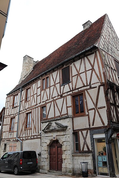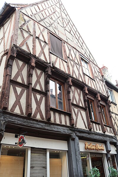 La maison, édifiée après l'incendie de 1487, conserve des poteaux bagués aux ornements prismatiques, surmontés de consoles qui supportent la sablière du second étage.