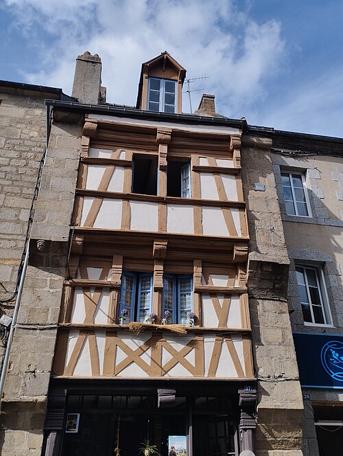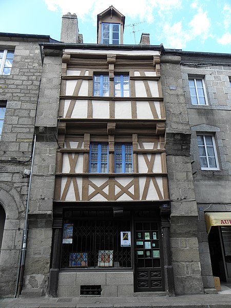 La maison située 37 Grande-Rue à Quintin (Côtes-d'Armor, Bretagne) présente une architecture conservée des XVIe–XVIIe siècles. La façade, débarrassée de l'enduit qui masquait l'ossature ancienne, révèle des poutres d'avant-solier moulurées en bois sur deux étages. Une petite tête sculptée en relief orne la hauteur du premier étage. Cette même hauteur est rythmée par des croix de saint André, renforcées par des poutres horizontales. Les deux baies sont contreventées par une croix de saint André placée sous leur allège. Quintin a été érigée en duché en 1691 et conserve plusieurs édifices de ces époques. La façade en bois et la couverture de cette maison sont partiellement inscrites au titre des monuments historiques par arrêté du 28 mai 1951. Des notices et ressources sont consultables dans la base Mérimée et sur les portails consacrés aux Côtes-d'Armor et aux monuments historiques; on peut également se référer aux articles et listes concernant Quintin et les monuments historiques des Côtes-d'Armor, notamment ceux protégés en 1951.