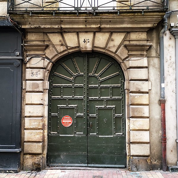 Une première maison, plus petite, existait en 1624. La construction de l'immeuble actuel se place entre 1671 et 1729. Le rez-de-chaussée des façades donnant sur la rue est occupé par des boutiques. Le portail, à arc en anse de panier, est encadré de pilastres travaillés à refends, traitement repris sur tous les encadrements de l'édifice. Les vantaux, anciens, présentent des panneaux assemblés sous des couvre-joints à rainures formant une série de rectangles et d'équerres; leurs clous, très rapprochés, sont à tête ronde.