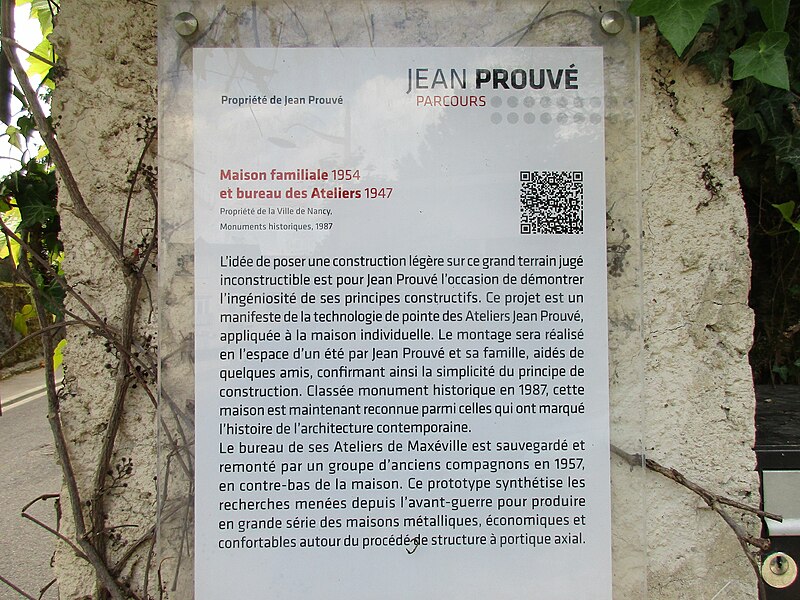 La maison de Jean Prouvé, construite à Nancy en 1954 comme domicile familial expérimental, illustre le style international et le mouvement moderne. Son auteur, l'architecte et designer Jean Prouvé (1901-1984), était de formation ferronnier d'art et fils de Victor Prouvé, engagé dans l'idée de « l'art pour tous » ; il vivait sur le site de son entreprise à Maxéville, dont un premier atelier se trouvait rue Custine de 1924 à 1931. Située au 6 rue Augustin-Hacquard, la parcelle très pentue sur le flanc de la colline dominant le nord de la ville était réputée inconstructible lorsqu'il l'acquit en 1953. La construction répond à un besoin de loger sa famille après que Prouvé eut été marginalisé à la suite du rachat de son entreprise par L'Aluminium français, ce qui l'amena parallèlement à développer des activités à Paris. On accède à la maison depuis le bas du terrain ; elle s'étire sur un étroit arasement long de 27 mètres aménagé dans la partie supérieure du coteau. Un long mur de pierre plein, parallèle au flanc du coteau, sépare la maison du versant. La toiture est une fine charpente en bois lamellé-collé, légèrement cintrée et couverte d'un matériau étanche, qui coiffe des pièces disposées en enfilade ; Prouvé appelait cet ensemble « le wagon ». Le bâtiment se compose de trois volumes enchaînés : les chambres, le bloc central qui contient le vaste séjour, et la partie abritant la cuisine et les locaux techniques. Le séjour, partie la plus généreuse, s'ouvre au sud-est par des baies vitrées intégrales et ouvrables offrant une vue sur la plaine de Nancy à travers les arbres en contrebas. L'entrée est protégée par l'avancée de la toiture au niveau du volume du séjour. Les chambres présentent des panneaux à hublots et des fenêtres munies de volets à contrepoids coulissant dans l'épaisseur de l'enveloppe, selon un principe comparable à une guillotine inversée. Des rangements sont adossés au mur du fond, dans la zone la moins lumineuse, le long de laquelle s'articule la distribution des pièces. La maison a été réalisée en trois mois ; l'essentiel des éléments de construction provenait de l'entreprise de Prouvé, qu'il racheta pour six millions de francs en 1954, somme comprenant le prix du foncier. L'atelier de Maxéville, prototype de maison à structure en compas légère de 8 × 8 m, a été remonté sur des plots maçonnés en contrebas où il sert d'étude ; installé contre la rue Augustin-Hacquard, il put être manutentionné par deux hommes en quelques heures. La maison et le bureau reconstitué de ses ateliers de 1947 à Maxéville ont été classés au titre des monuments historiques par arrêté du 2 novembre 1987. La Ville de Nancy a acquis la maison en 1990 ; depuis 2013 elle est administrée par le Musée des beaux-arts de Nancy et ouverte à la visite en tant que musée de juin à septembre. La création d'un poste d'architecte des bâtiments de France en 1997 a permis d'occuper la maison comme logement de fonction, et en 2017 elle était habitée par un ancien architecte.