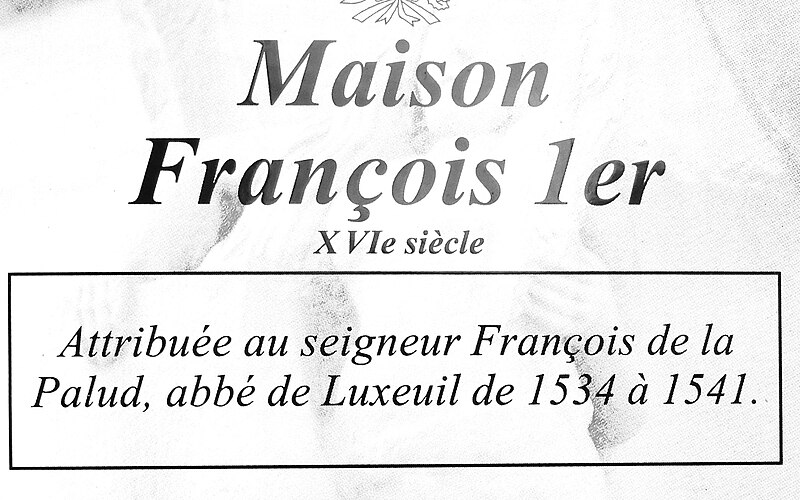 La « maison dite de François Ier » est un édifice situé à Luxeuil‑les‑Bains, en Haute‑Saône. Elle a été construite au XVIe siècle sous l'autorité de l'abbé François de La Palud, à une époque où la Franche‑Comté ne relevait pas encore du royaume de France. Bien que contemporaine du règne de François Ier, l'appellation n'évoque pas le roi : elle tient au fait que François de La Palud fut le premier abbé de Luxeuil à porter ce prénom et demeura le seul jusqu'à la Révolution, d'où une dénomination équivoque. Les arcades du rez‑de‑chaussée laissent penser qu'elle abritait deux ou trois boutiques, mais le statut ecclésiastique de l'abbé l'empêchant d'exercer une activité commerciale rend peu vraisemblable qu'il en ait été propriétaire. L'édifice a été inscrit au titre des monuments historiques en 1927 puis classé en 1937. Des documents et médias sont consultables sur Wikimedia Commons sous l'intitulé « Maison de François Ier (Luxeuil) », et la maison figure parmi les monuments historiques de la Haute‑Saône ; elle est également mentionnée dans les portails consacrés à la Haute‑Saône et aux monuments historiques français.