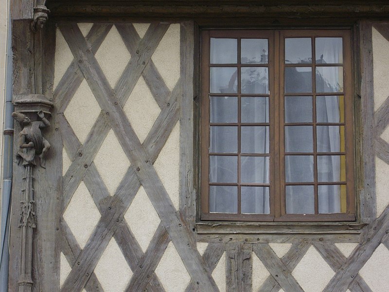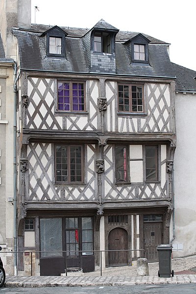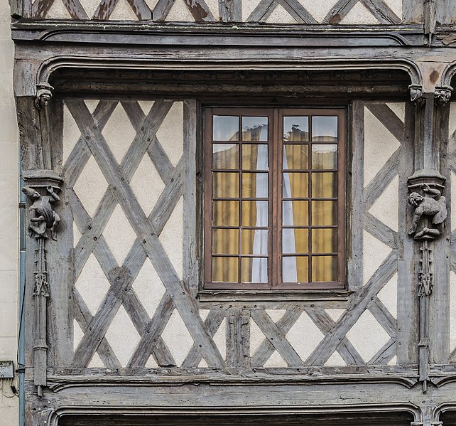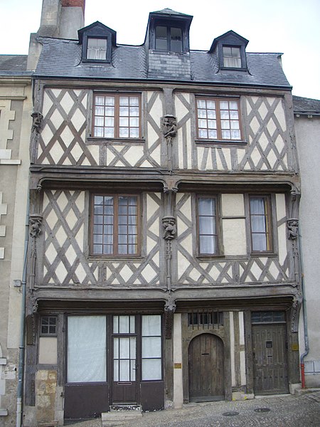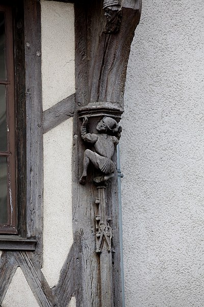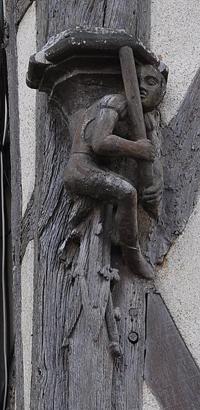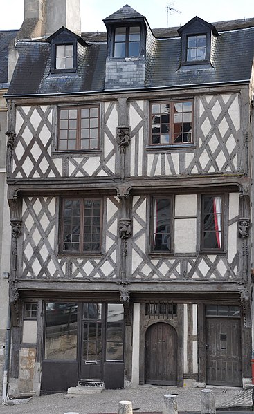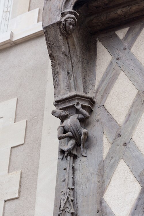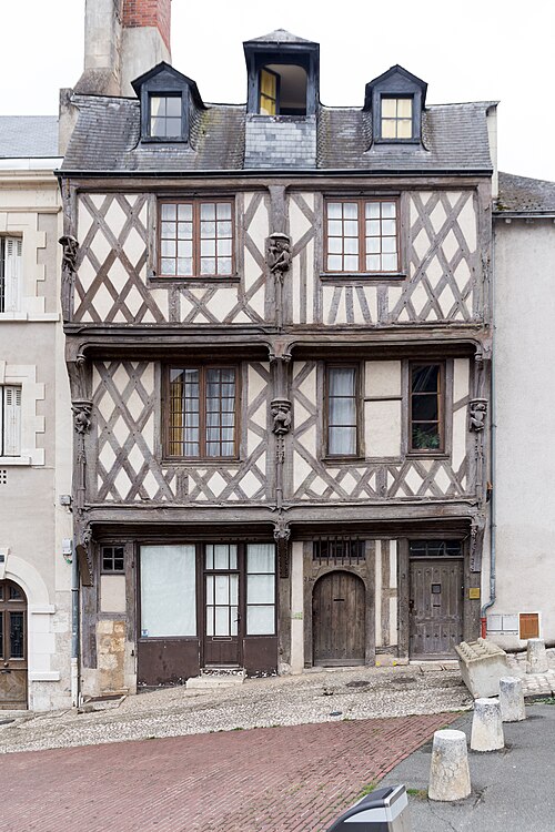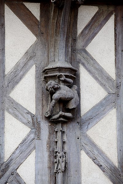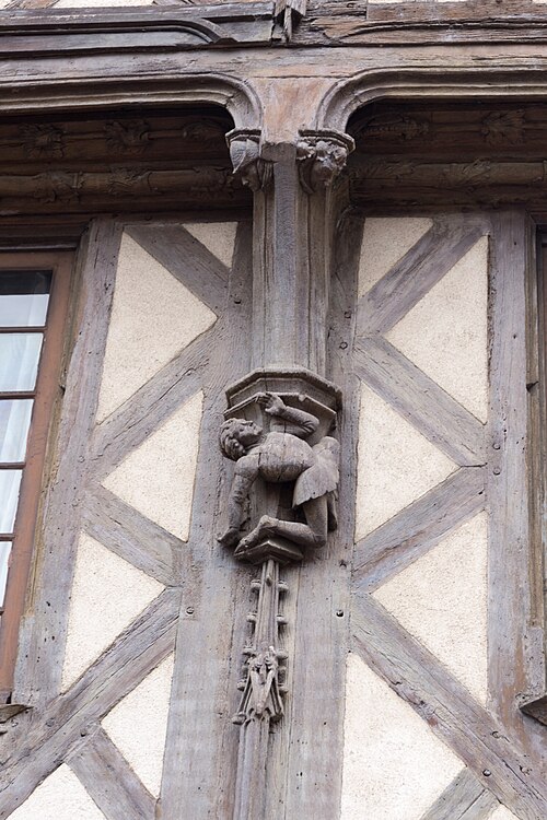Il s'agit d'une maison à pans de bois comprenant un rez-de-chaussée, deux étages en encorbellement et un étage sous combles, couverte d'une toiture à longs pans en ardoise. Les sablières doubles qui portent les étages sont moulurées et ornées de feuillages ; elles reposent sur des consoles dont la base porte de petits personnages sculptés, représentés dans des poses bizarres et comiques. À l'intérieur, le rez-de-chaussée conserve une grande cheminée en pierre à pilastre et l'escalier à vis est en bois. Le vestibule s'ouvre sur deux arcs en pierre dont les clés, décorées de consoles, prennent naissance sur des culs-de-lampe sculptés. Sous la maison, la cave est divisée par deux arcs surbaissés qui s'appuient, de chaque côté, sur des piédroits et, au centre, sur une colonne à chapiteau cubique chanfreiné.