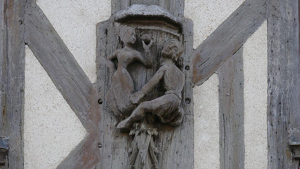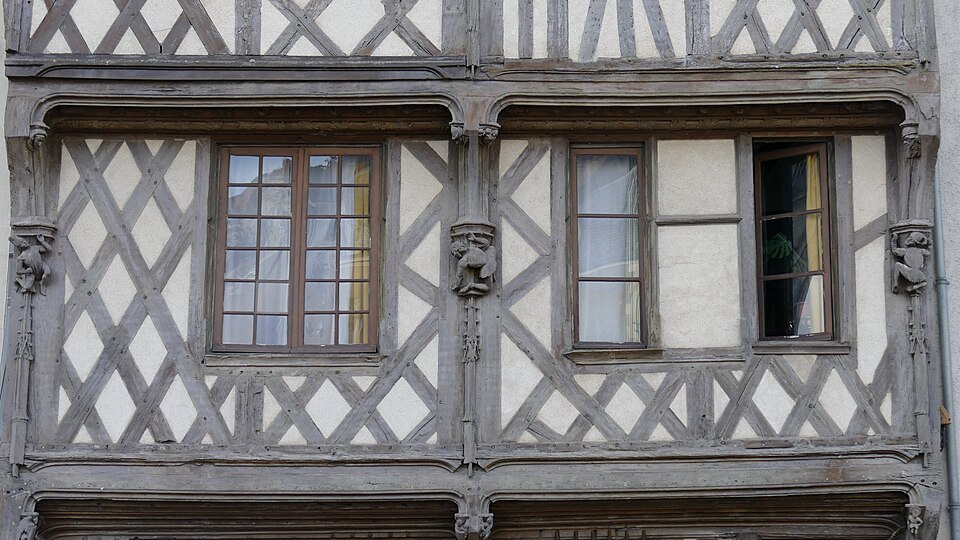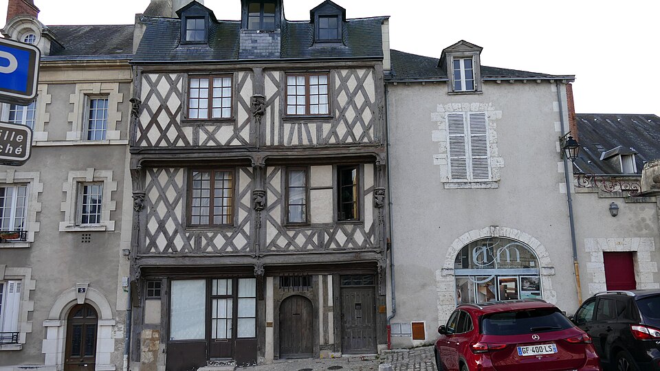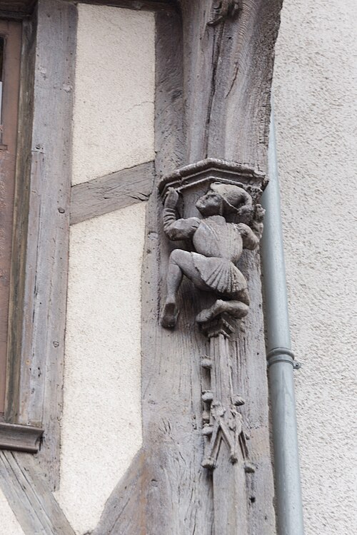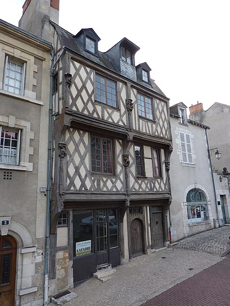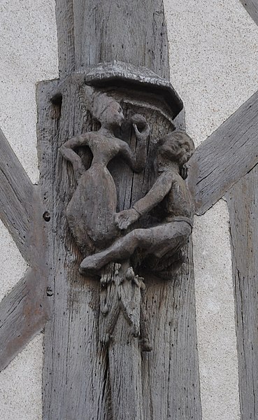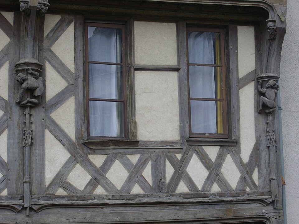 Il s'agit d'une maison à pans de bois comprenant un rez-de-chaussée, deux étages en encorbellement et un étage sous combles, couverte d'une toiture à longs pans en ardoise. Les sablières doubles qui portent les étages sont moulurées et ornées de feuillages ; elles reposent sur des consoles dont la base porte de petits personnages sculptés, représentés dans des poses bizarres et comiques. À l'intérieur, le rez-de-chaussée conserve une grande cheminée en pierre à pilastre et l'escalier à vis est en bois. Le vestibule s'ouvre sur deux arcs en pierre dont les clés, décorées de consoles, prennent naissance sur des culs-de-lampe sculptés. Sous la maison, la cave est divisée par deux arcs surbaissés qui s'appuient, de chaque côté, sur des piédroits et, au centre, sur une colonne à chapiteau cubique chanfreiné.