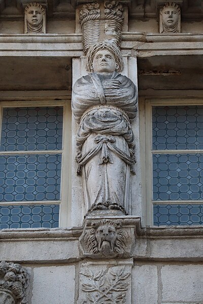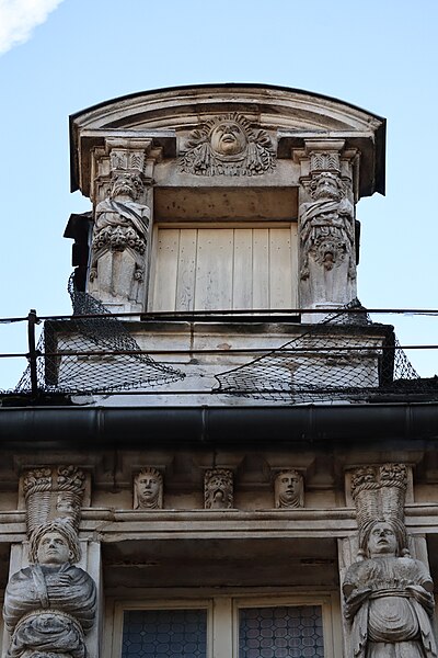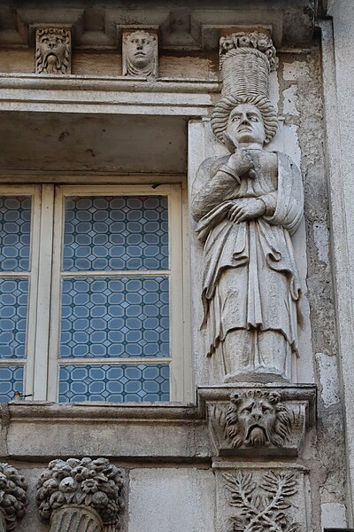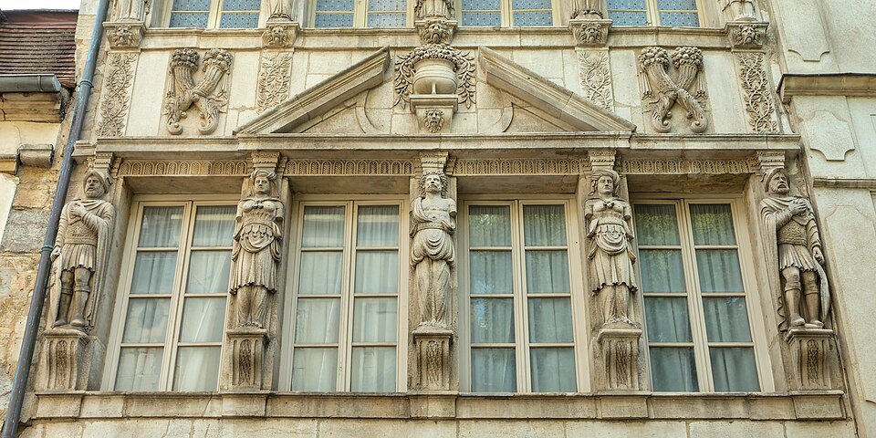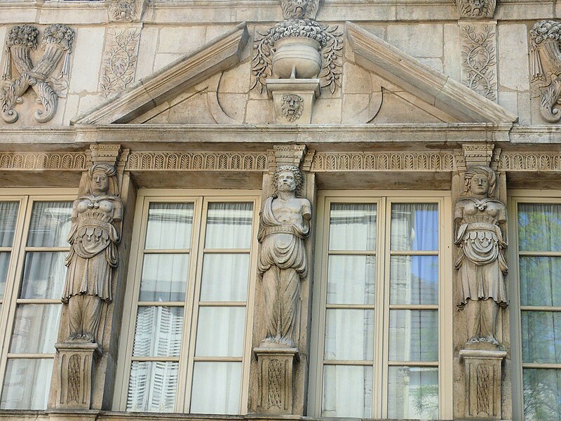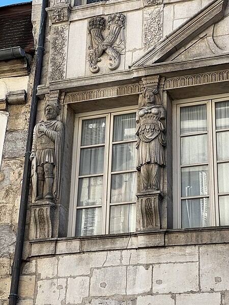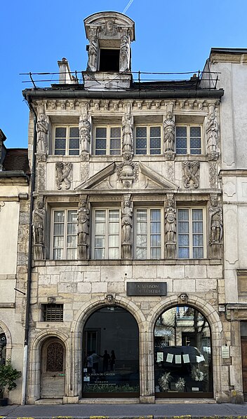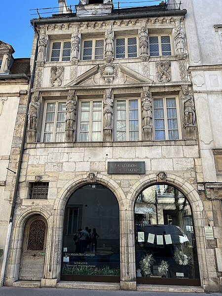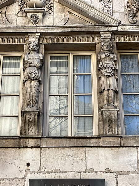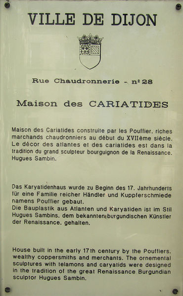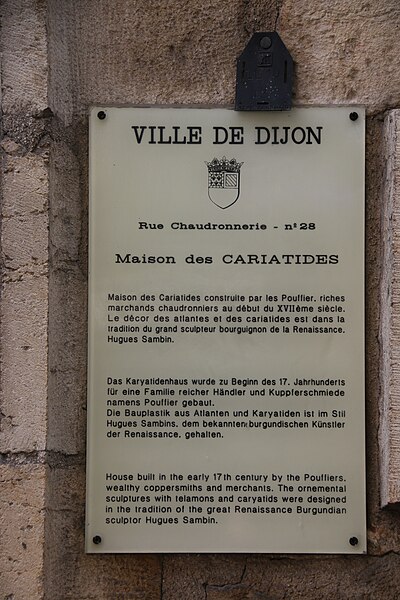 La maison dite des Cariatides, ou maison Pouffier, se situe au n° 28 de la rue Chaudronnerie à Dijon (Côte-d'Or). Elle est classée au titre des monuments historiques par arrêté du 13 juillet 1911. L'hôtel a été construit vers 1603 par l'architecte de la famille Pouffier, famille de riches marchands chaudronniers au début du XVIIe siècle. La façade présente une décoration d'atlantes et de cariatides et porte l'écusson au chaudron fleuri des propriétaires. Ce décor reprend le goût de Hugues Sambin, dont le style était déjà imité par ses successeurs. Les informations principales proviennent du panneau d'information placé devant l'hôtel. Une notice et des photographies sont accessibles sur Wikimedia Commons, et des notices complémentaires figurent dans les bases Mérimée et Structurae. Bibliographie : Eugène Fyot, Hôtels et maisons, p. 141-142, dans Congrès archéologique de France, 91e session, Dijon, 1928 ; Société française d'archéologie, Paris, 1929. Des images documentent la façade, un détail sculptural, la lucarne, la plaque d'information trilingue et les portails, consultables sur les portails municipaux et nationaux.