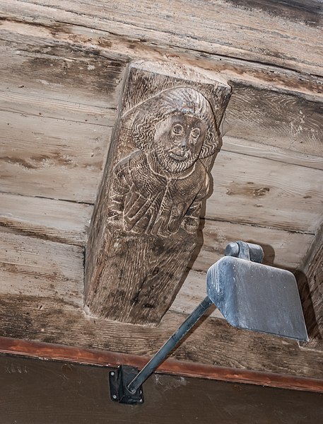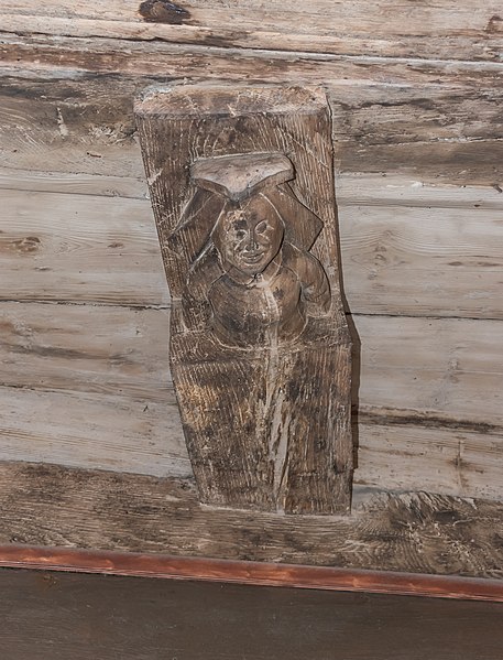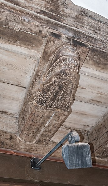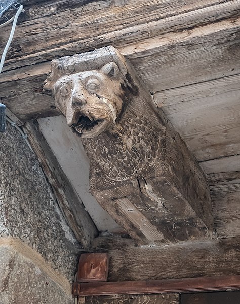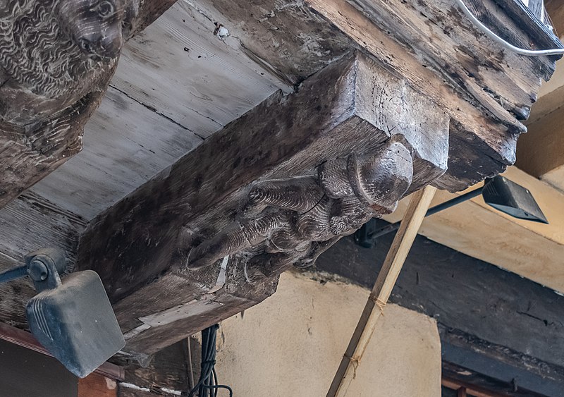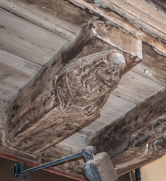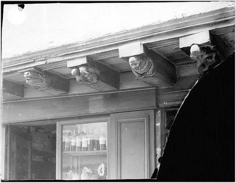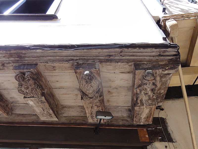 Maison à pans de bois décorée de sculptures figurant les sept péchés capitaux.