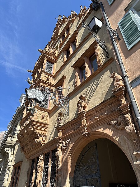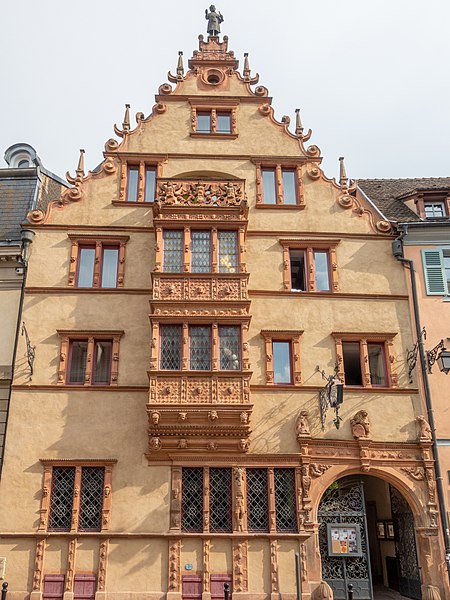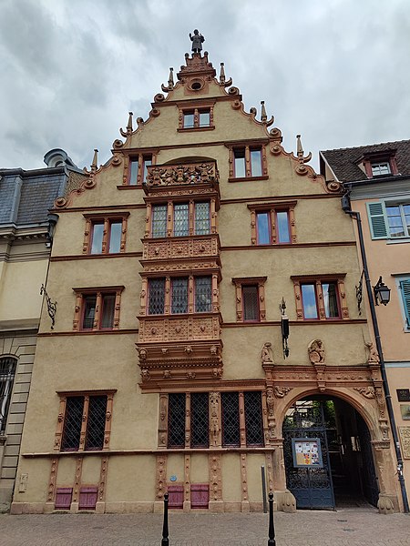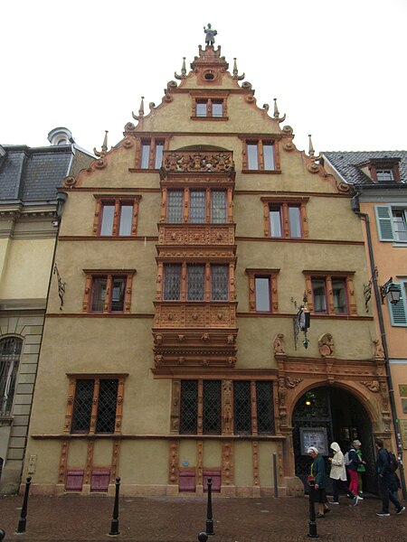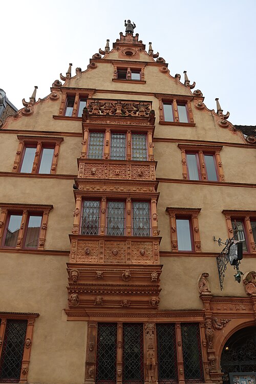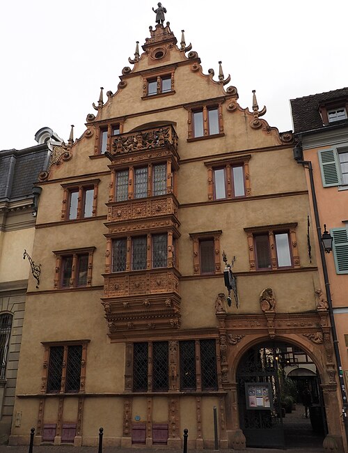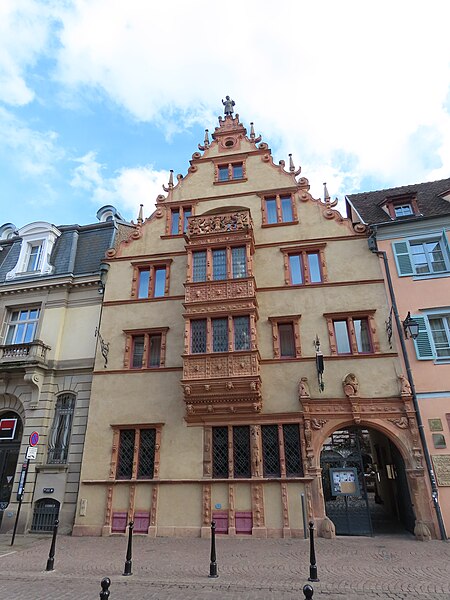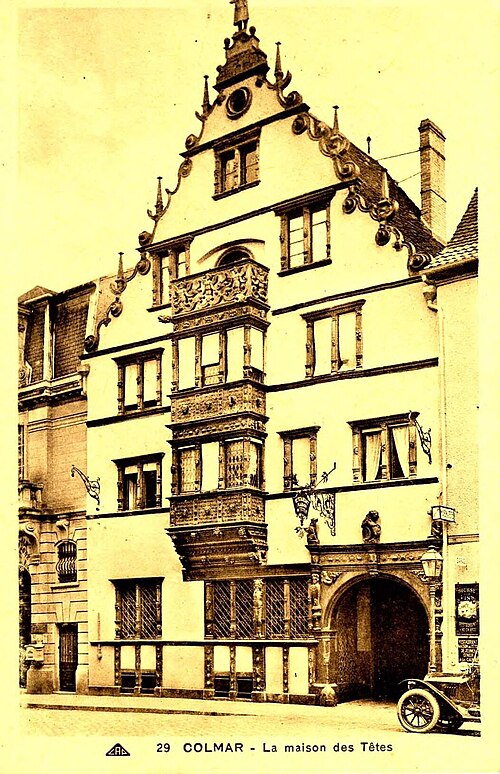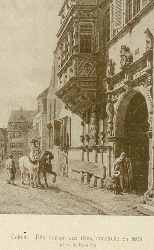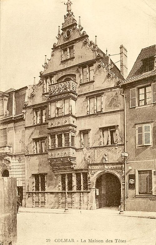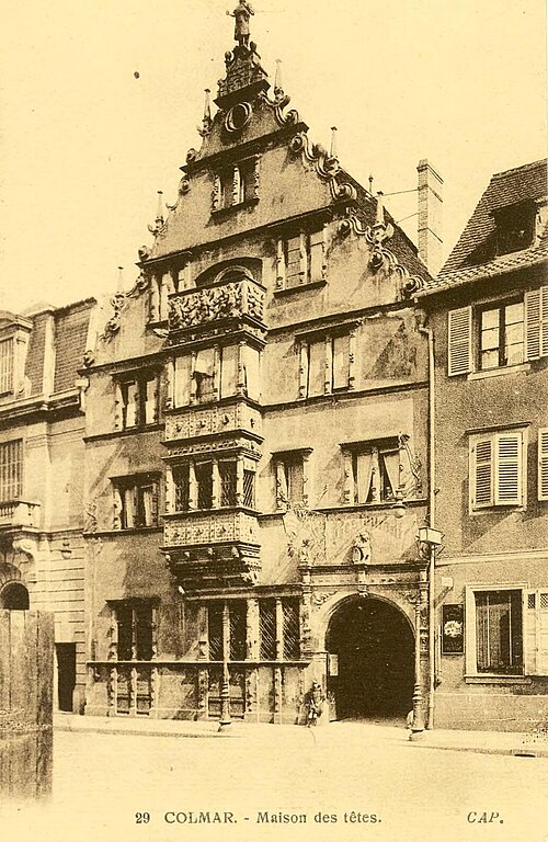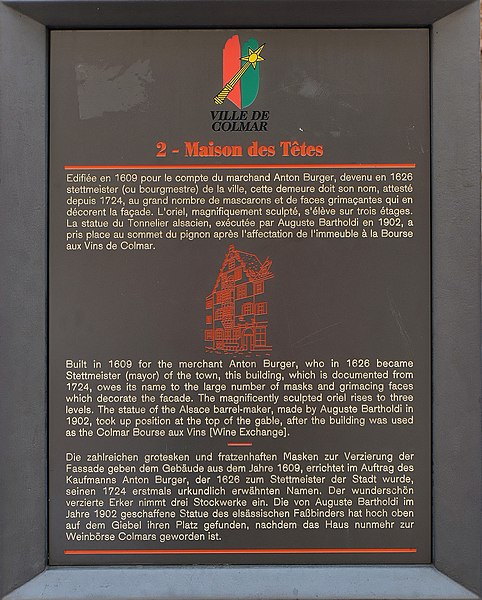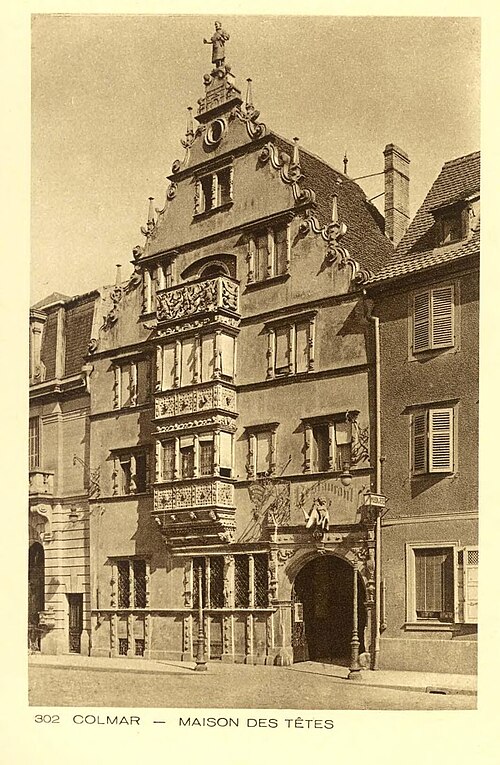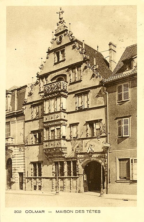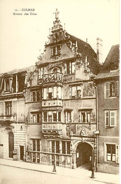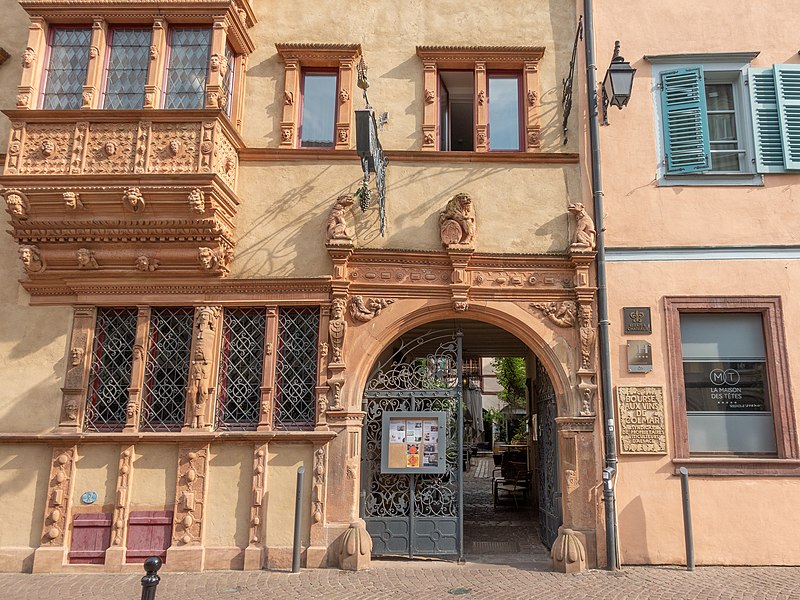 La Maison des Têtes est un monument historique situé au 19, rue des Têtes à Colmar, dans le Haut‑Rhin. Elle est classée au titre des monuments historiques depuis le 6 décembre 1898. L'édifice a été construit en 1609 pour le marchand Anton Burger, qui fut stettmeister de Colmar de 1626 à 1628. Anton Burger fit démolir la maison paternelle pour édifier celle qui porte le surnom de « Maison des Têtes ». Il fit apposer ses armoiries à deux reprises sur la façade, sur le pignon à volutes et au‑dessus du portail ; une partie de la seconde représentation englobe les armes de son épouse, Anne Ortlieb, originaire de Riquewihr. La décoration singulière de la façade comprend une profusion de figurines et 106 masques grotesques, qui ont donné son nom au bâtiment. Le texte indique qu'Anton Burger appartenait depuis 1602 à la corporation des marchands et qu'il fut conseiller municipal dès 1612 avant de devenir stattmeister en 1626. Après la succession d'Anton, la maison passa entre plusieurs propriétaires : elle fut cédée par les héritiers à Baudoin De Launay, appartint ensuite à divers propriétaires mentionnés comme Guillier, trésorier de l'extraordinaire des guerres de Sélestat, puis à De Prudhomme, capitaine du régiment d'infanterie de Noailles, avant d'être acquise par la Bourse aux Vins. Témoignage de ce passé, le pignon porte une statue en bronze d'un tonnelier réalisée en 1902 par Auguste Bartholdi. La Maison des Têtes fut transformée en restaurant et lieu de rencontre en 1898 ; des restaurations menées par Carmen et Marc Rohfritsch ont ensuite permis de réhabiliter une grande partie du bâtiment et d'y adjoindre un hôtel. En 2015, Marilyn et Éric Girardin ont ouvert un restaurant gastronomique qui a reçu une étoile du Guide Michelin en février 2017. De style Renaissance, l'édifice présente une façade composée de deux étages carrés séparés par des bandeaux, et le pignon est traité sur trois niveaux. L'oriel central occupe deux étages et repose sur un garde‑corps ajouré en pierre décoré de figures bifides, tandis que les fenêtres, de largeurs inégales, sont disposées de façon irrégulière en hauteur. Les 106 mascarons ornent l'oriel et les meneaux des fenêtres ; le pignon est surmonté d'un petit tonnelier en étain signé Auguste Bartholdi. Le texte mentionne également un propriétaire nommé Albrecht Schmidt dans la notice architecturale.
