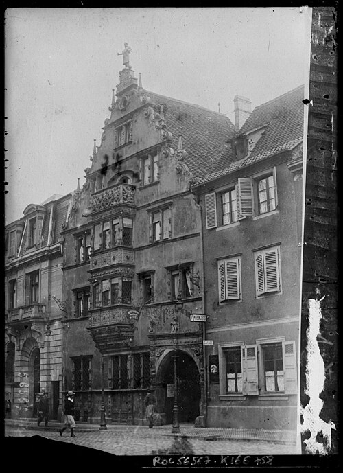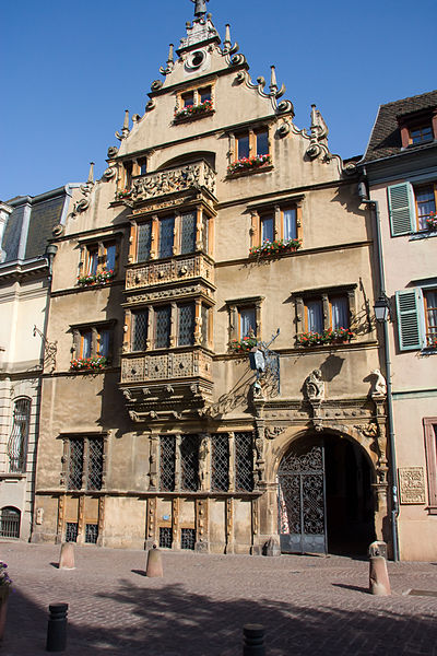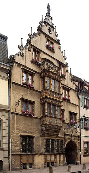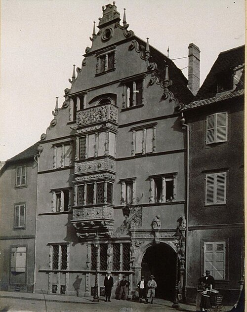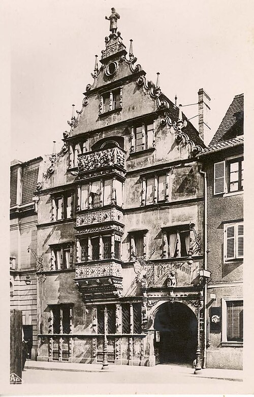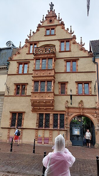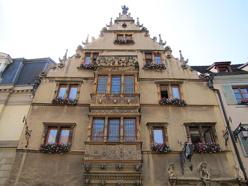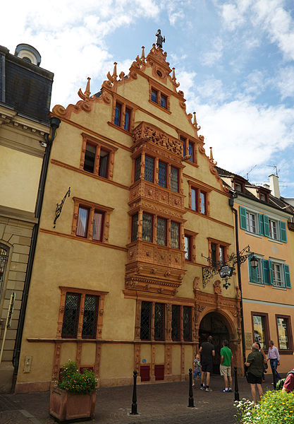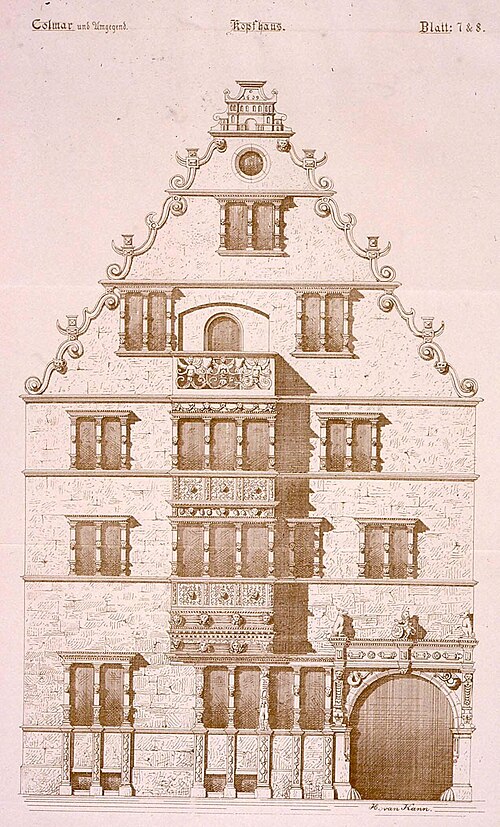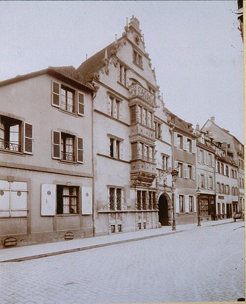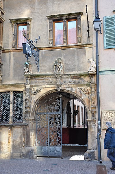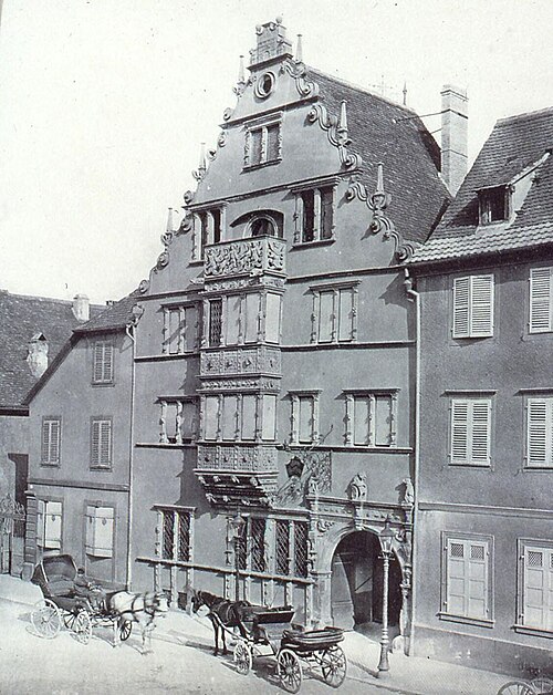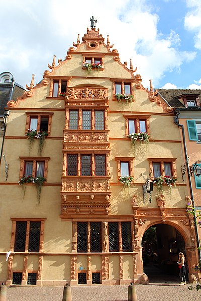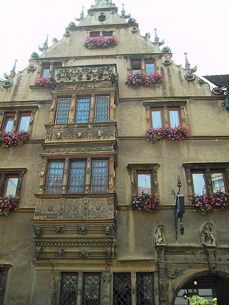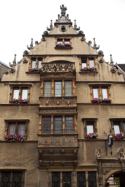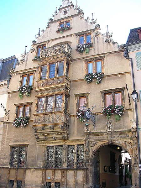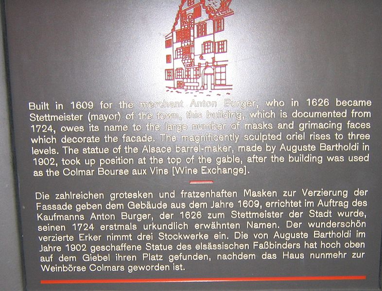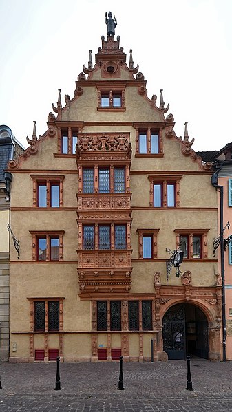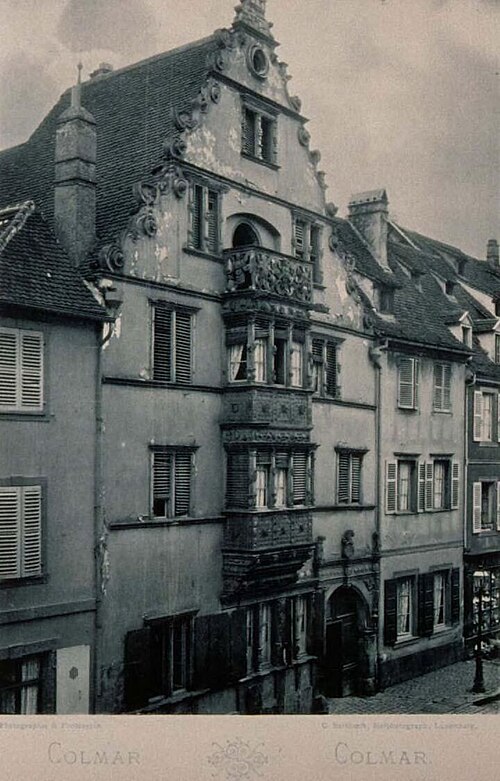 La Maison des Têtes est un monument historique situé au 19, rue des Têtes à Colmar, dans le Haut‑Rhin. Elle est classée au titre des monuments historiques depuis le 6 décembre 1898. L'édifice a été construit en 1609 pour le marchand Anton Burger, qui fut stettmeister de Colmar de 1626 à 1628. Anton Burger fit démolir la maison paternelle pour édifier celle qui porte le surnom de « Maison des Têtes ». Il fit apposer ses armoiries à deux reprises sur la façade, sur le pignon à volutes et au‑dessus du portail ; une partie de la seconde représentation englobe les armes de son épouse, Anne Ortlieb, originaire de Riquewihr. La décoration singulière de la façade comprend une profusion de figurines et 106 masques grotesques, qui ont donné son nom au bâtiment. Le texte indique qu'Anton Burger appartenait depuis 1602 à la corporation des marchands et qu'il fut conseiller municipal dès 1612 avant de devenir stattmeister en 1626. Après la succession d'Anton, la maison passa entre plusieurs propriétaires : elle fut cédée par les héritiers à Baudoin De Launay, appartint ensuite à divers propriétaires mentionnés comme Guillier, trésorier de l'extraordinaire des guerres de Sélestat, puis à De Prudhomme, capitaine du régiment d'infanterie de Noailles, avant d'être acquise par la Bourse aux Vins. Témoignage de ce passé, le pignon porte une statue en bronze d'un tonnelier réalisée en 1902 par Auguste Bartholdi. La Maison des Têtes fut transformée en restaurant et lieu de rencontre en 1898 ; des restaurations menées par Carmen et Marc Rohfritsch ont ensuite permis de réhabiliter une grande partie du bâtiment et d'y adjoindre un hôtel. En 2015, Marilyn et Éric Girardin ont ouvert un restaurant gastronomique qui a reçu une étoile du Guide Michelin en février 2017. De style Renaissance, l'édifice présente une façade composée de deux étages carrés séparés par des bandeaux, et le pignon est traité sur trois niveaux. L'oriel central occupe deux étages et repose sur un garde‑corps ajouré en pierre décoré de figures bifides, tandis que les fenêtres, de largeurs inégales, sont disposées de façon irrégulière en hauteur. Les 106 mascarons ornent l'oriel et les meneaux des fenêtres ; le pignon est surmonté d'un petit tonnelier en étain signé Auguste Bartholdi. Le texte mentionne également un propriétaire nommé Albrecht Schmidt dans la notice architecturale.