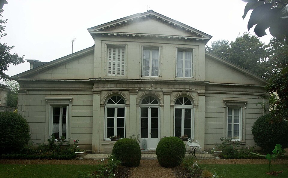 Construite en grand appareil de tuffeau sur un plan presque carré, la maison présente un pavillon central à un étage flanqué de deux ailes en rez-de-chaussée. Un fronton triangulaire, qui occupe toute la largeur des deux façades, masque les décrochements de toiture et adoucit les différences de hauteur entre les corps de bâtiment. La partie centrale est mise en valeur par de gros modillons cubiques, tandis qu'un bandeau entre les niveaux porte de petits modillons. Au rez-de-chaussée, la façade comporte trois portes en plein cintre encadrées par quatre pilastres plats ; les baies du rez-de-chaussée sont surmontées de couronnements soutenus par deux consoles. Deux fausses fenêtres closes de persiennes dissimulent les conduits de cheminées.