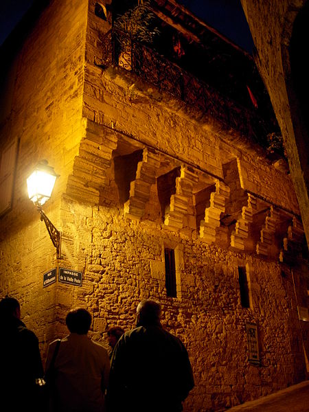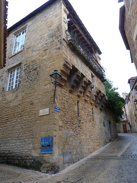 La façade présente une galerie en encorbellement soutenue par des corbeaux moulurés et dotée d'un balcon en fer forgé, tandis que les fenêtres du rez-de-chaussée sont étroites. Ce parti pris architectural confère à la construction une allure défensive qui témoigne de l'incertitude de l'époque.