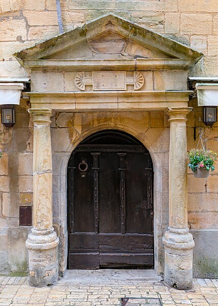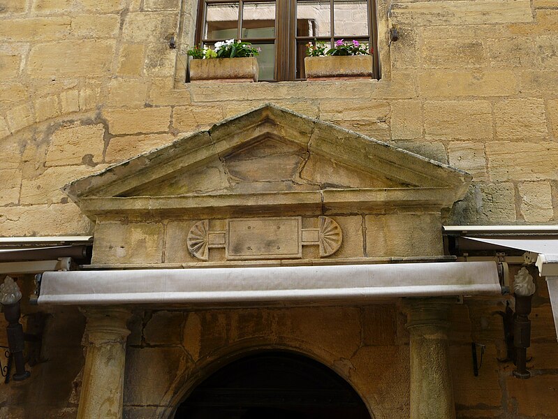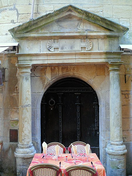 Maison de style Renaissance, caractérisée par des fenêtres à meneaux. La porte est encadrée de deux colonnes rondes qui supportent un fronton. La boutique s'ouvre par une baie cintrée.
